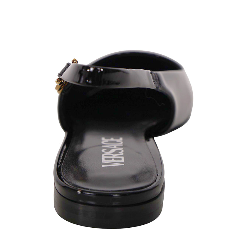 Authentic Versace flats in a classic every day style. Glossy black patent leather. Sleek pointed toe silhouette with a gold Medusa medallion accent on the slingback strap. Low stacked heel for all-day wear. Lined in leather with leather soles. Style 1013024. Made in Italy. The elegance style of high heels in a low wearable heel. Perfect for elevating both day and evening looks.