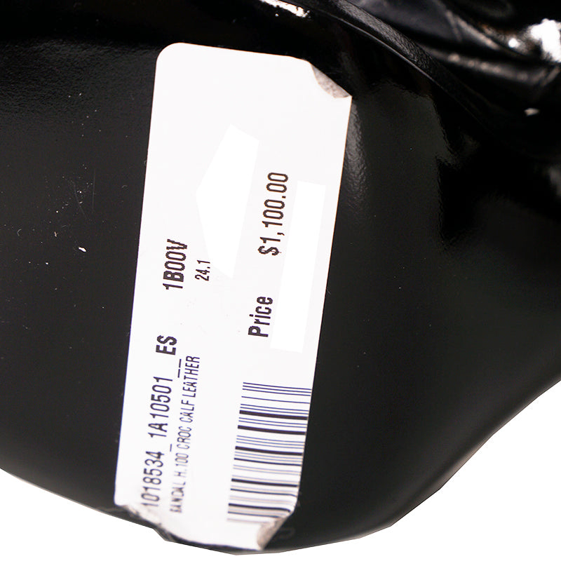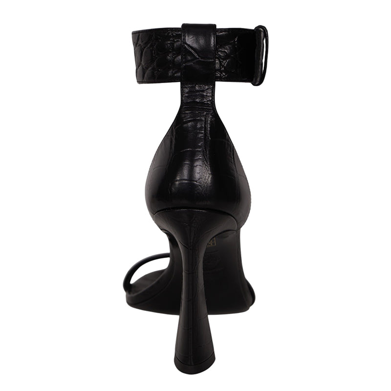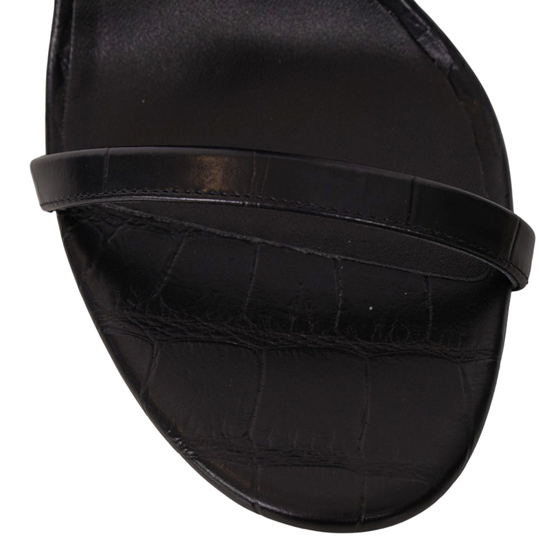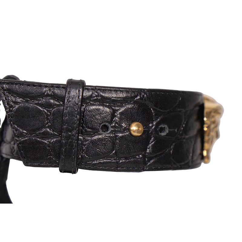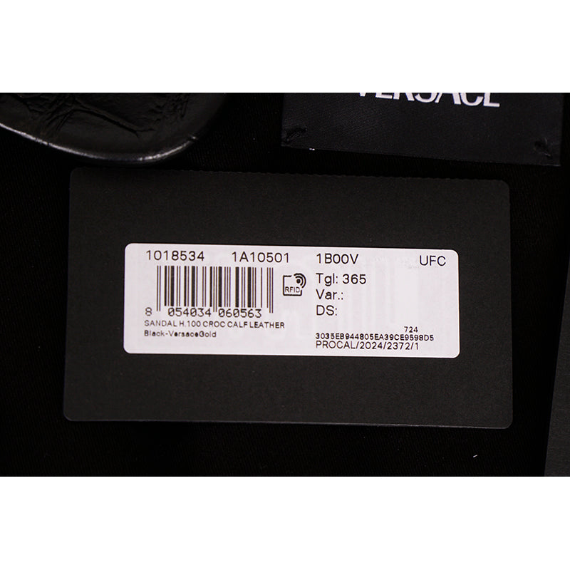 Authentic Versace high-heel sandals crafted in classic and sleek style. Embossed black leather with a crocodile finish. Single strap at toe. Wide ankle strap adorned with a signature gold Medusa logo. Sculpted high heel. Gold-toned hardware. Leather insole and outsole. Style 1A10501. Made in Spain. A striking and sophisticated pair perfect for evening wear or elevated occasions.