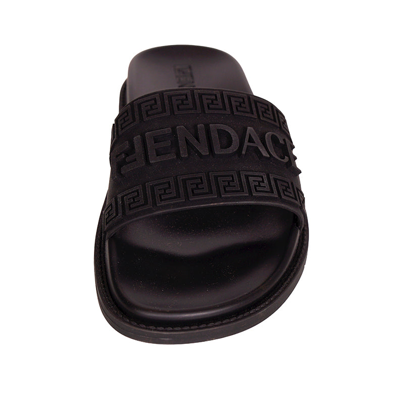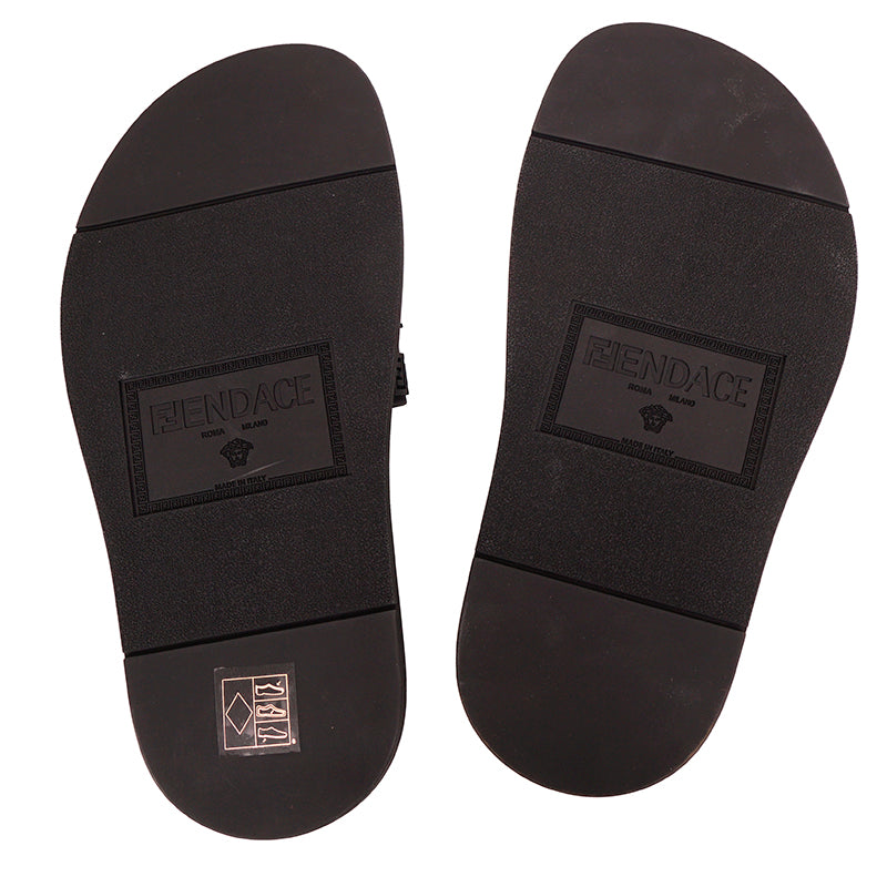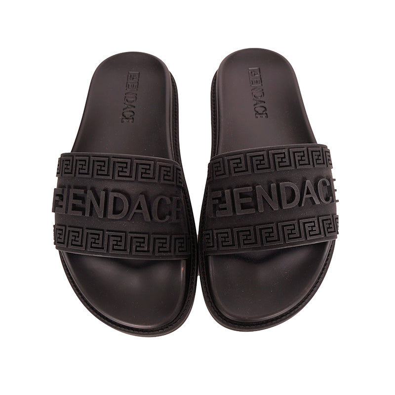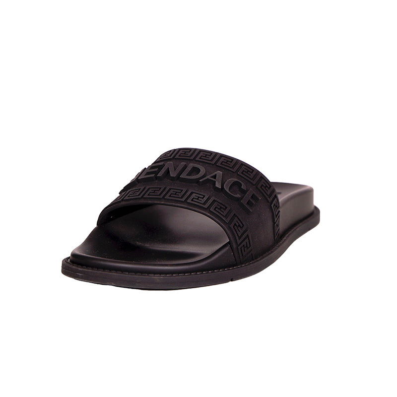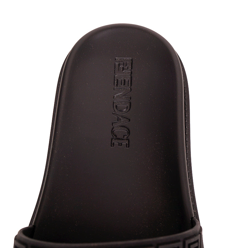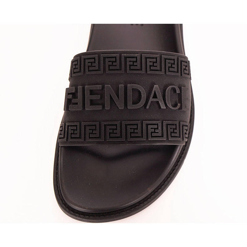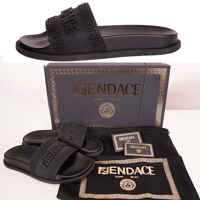 Authentic Versace sandals from the Fendi FENDACE colab in a classic pool slide style. Black rubber molded pool slides embellished FENDACE logo and Versace Greca border on front. 100% Polyurethane. Style 1006686. Made in Italy. Great sandals for the gym or the pool.