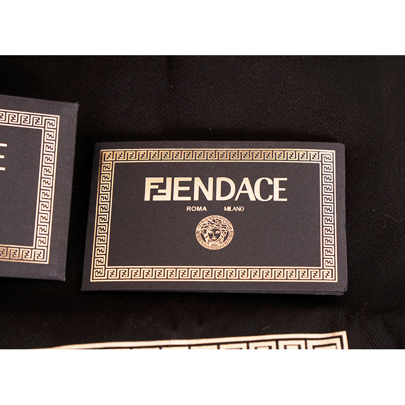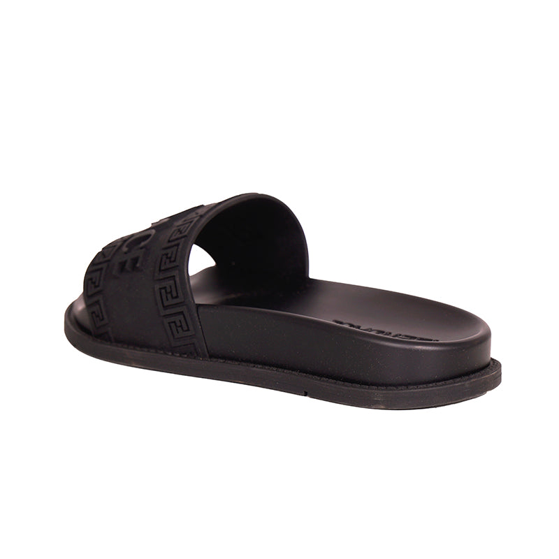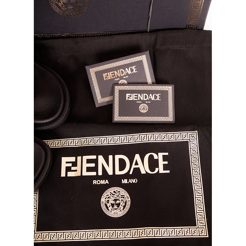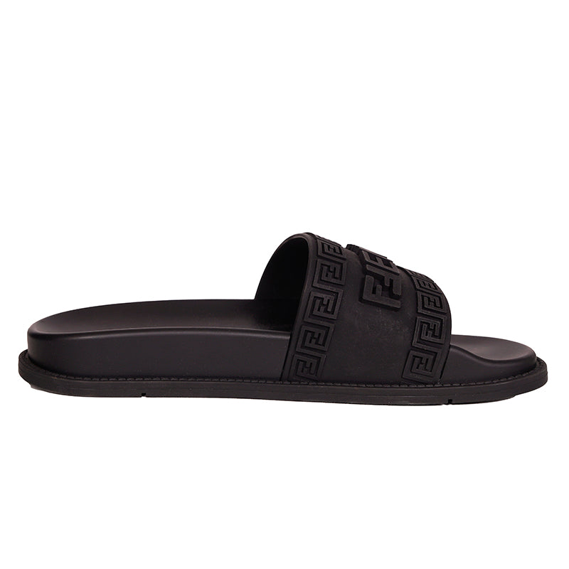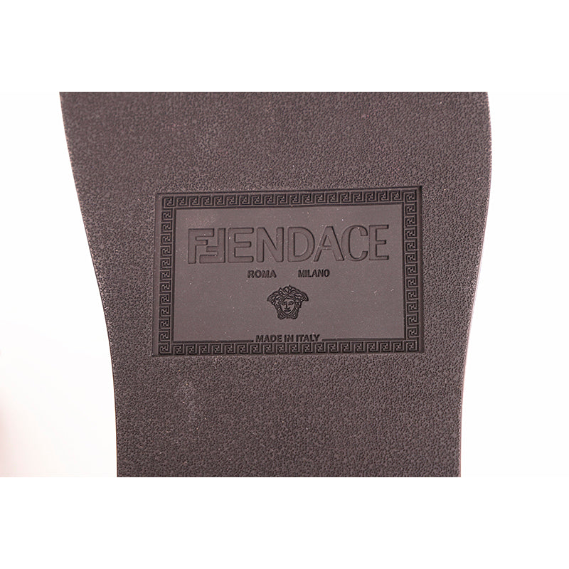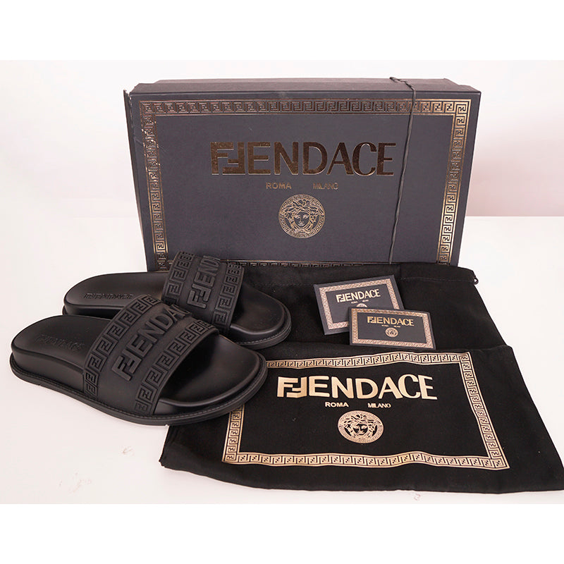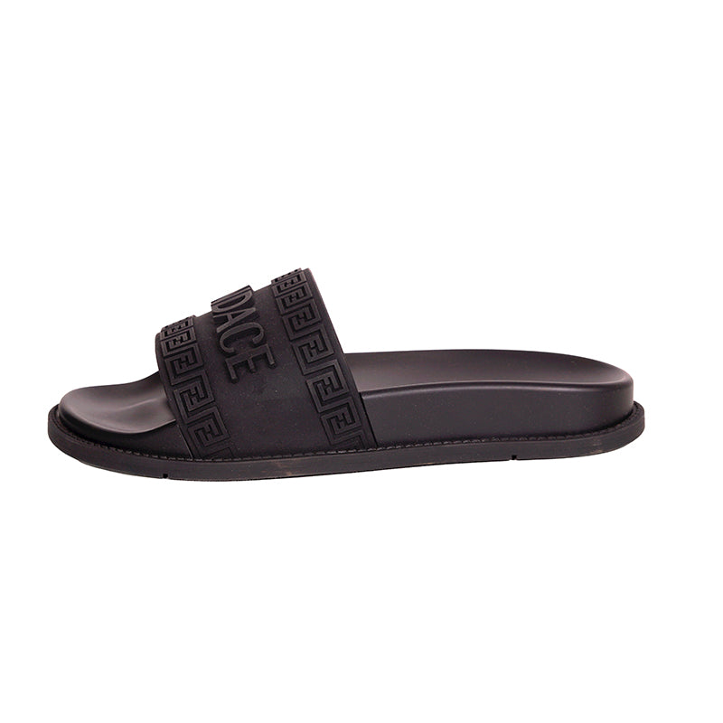 Authentic Versace sandals from the Fendi FENDACE colab in a classic pool slide style. Black rubber molded pool slides embellished FENDACE logo and Versace Greca border on front. 100% Polyurethane. Style 1006686. Made in Italy. Great sandals for the gym or the pool.