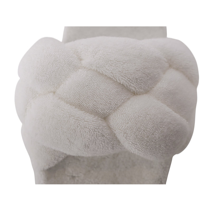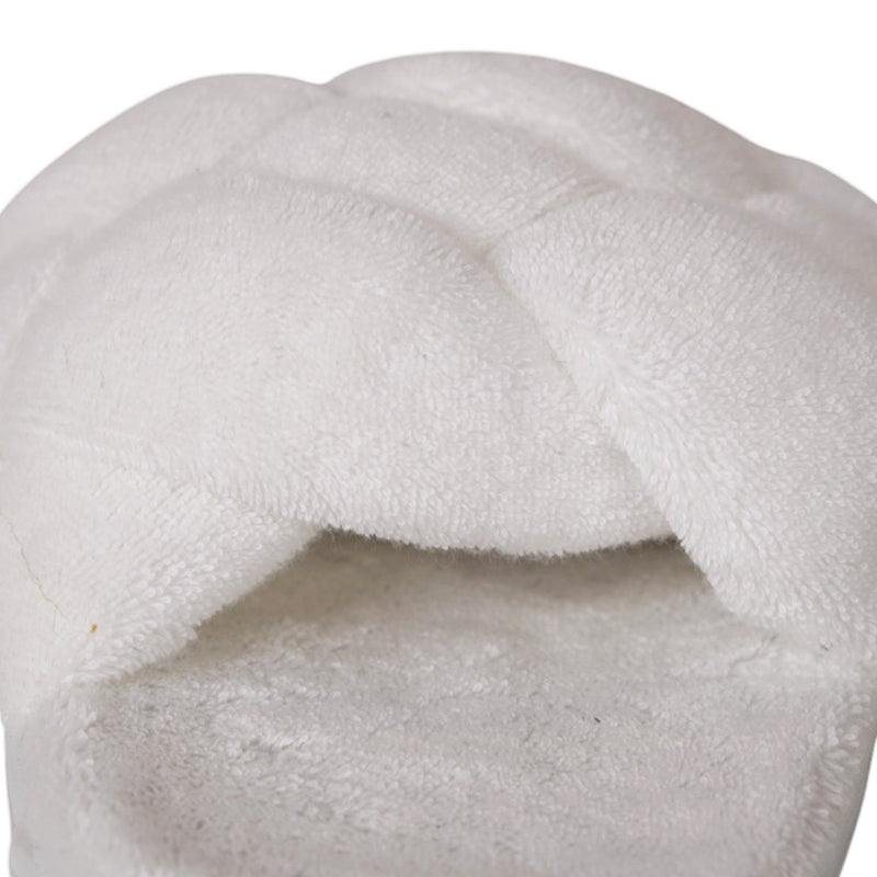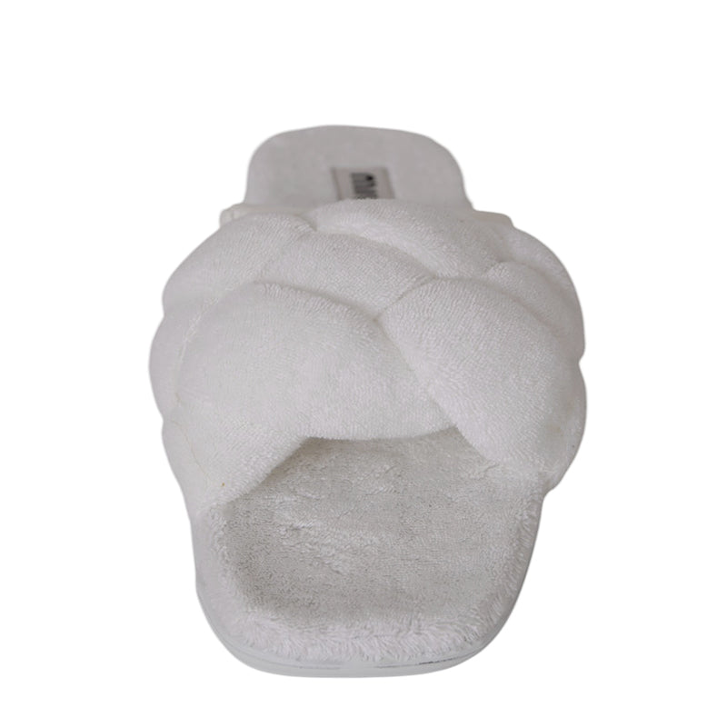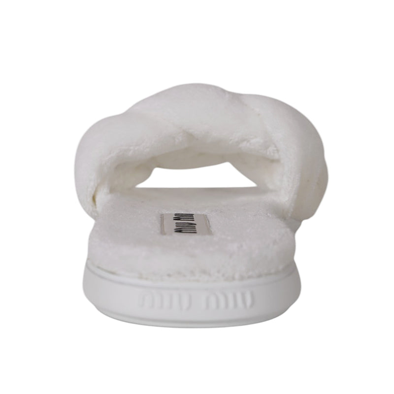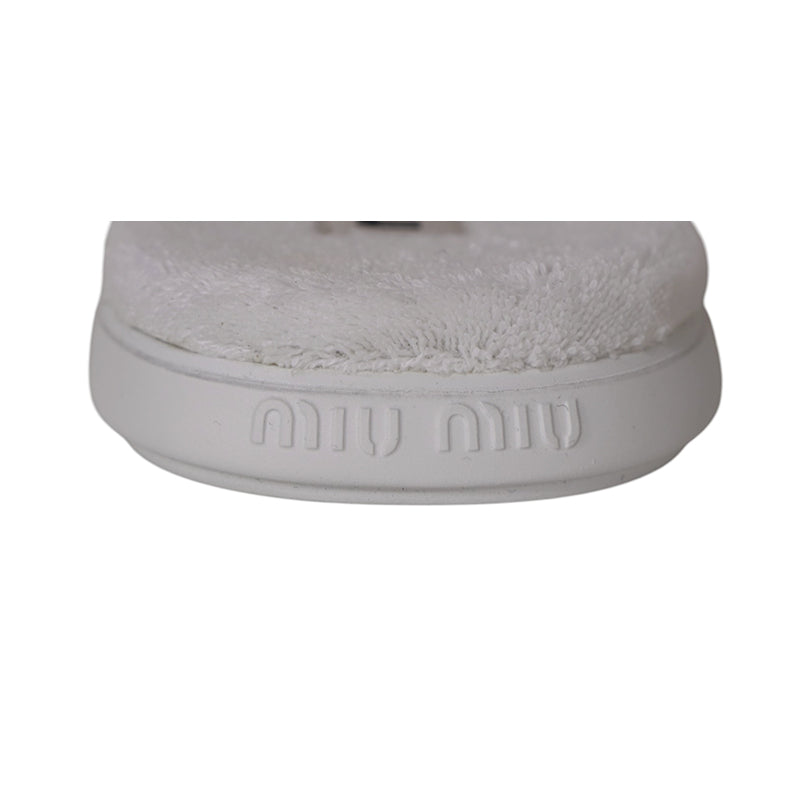 Authentic Miu Miu slides in a playful spa-inspired design. Soft white terry cloth terry fabric with a wide braided strap. Cushioned sole fully covered in plush terry with embossed Miu Miu logo detail at the heel and outsole. White rubber soles for comfort and durability. Style 5XX543. Made in Italy. A cozy yet chic pair, perfect for lounging or casual streetwear looks.