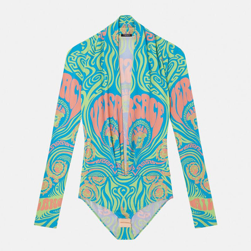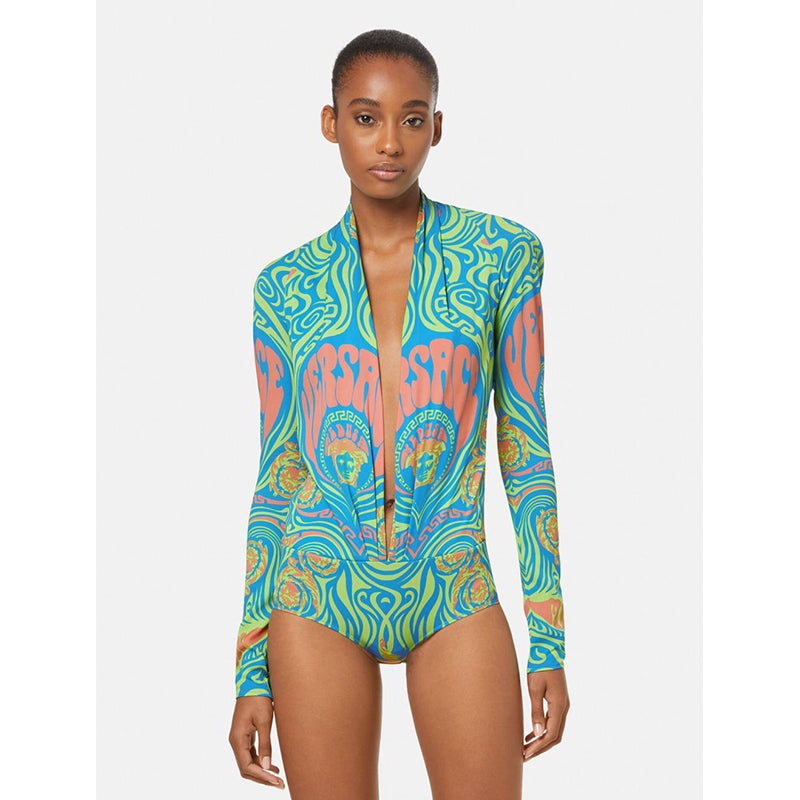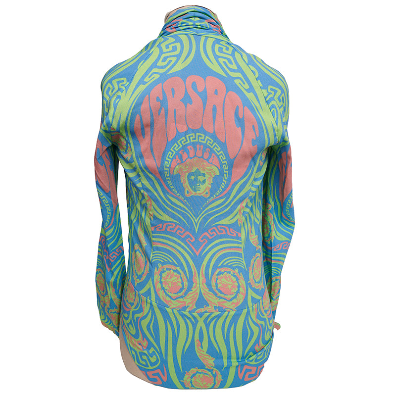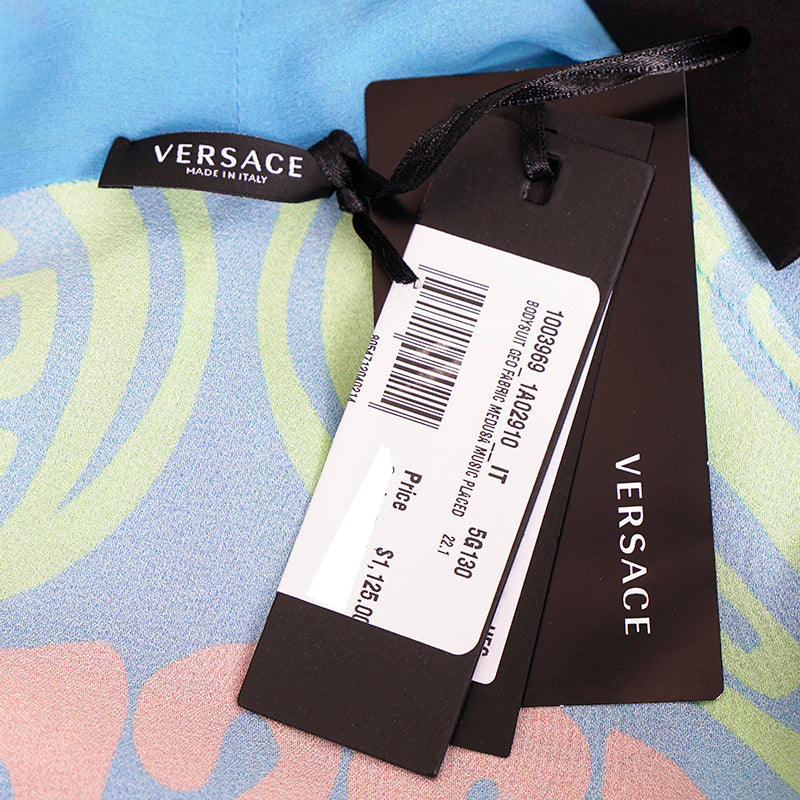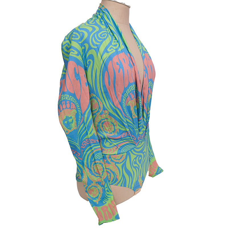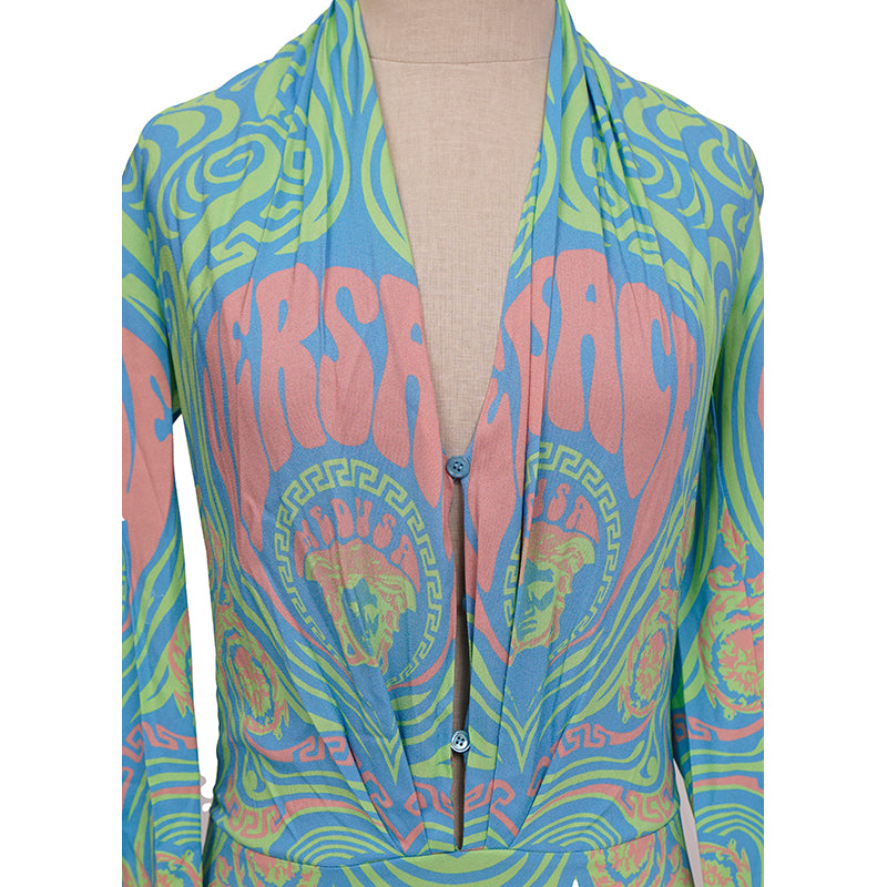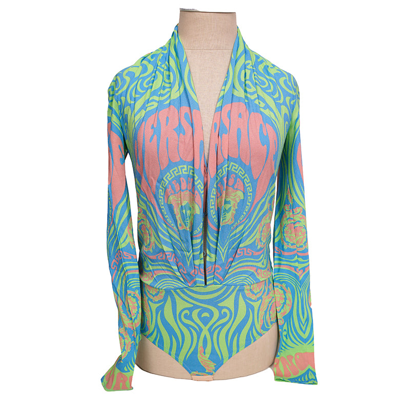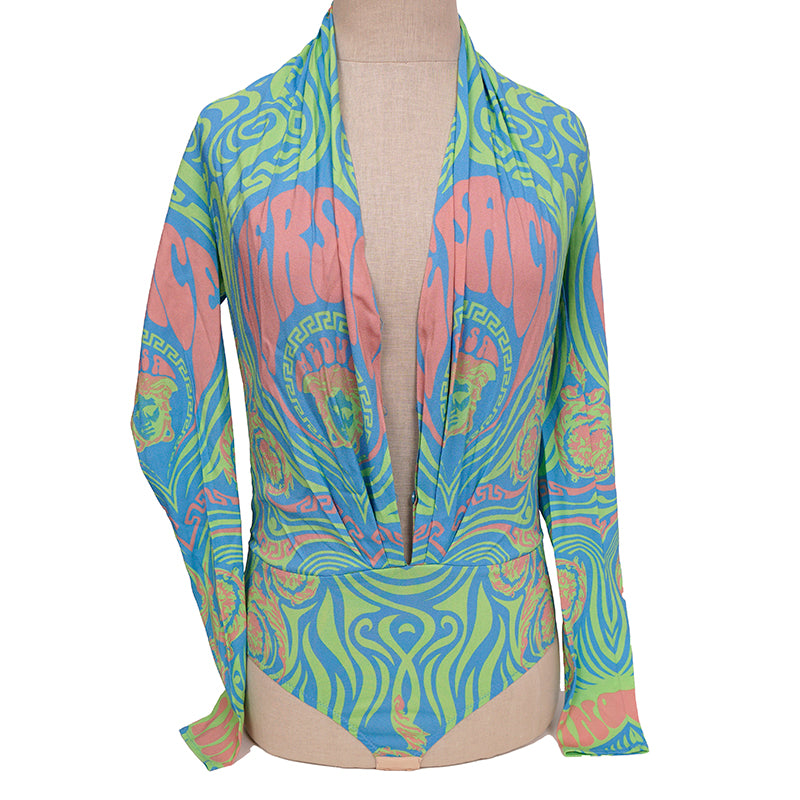 Authentic Versace bodysuit top from the 70's style music collection. Medusa Music print – a play on the psychedelic art style of the 70s. Teal blue, neon green and pastel pink. Stretch nylon jersey and silk. Split neckline with button closures (allows you to adjust how deep you want the V opening). Long sleeves. Large Medusa logo in back. Adjustable hook and eye gusset. 96% viscose, 4% elastane, Lining: 87% silk, 9% polyamide, 4% elastane. Gusset: 92% cotton, 8% elastane. Style 1003969. Made in Italy. Pair with everything to jeans to skirts. Sure to get noticed.
