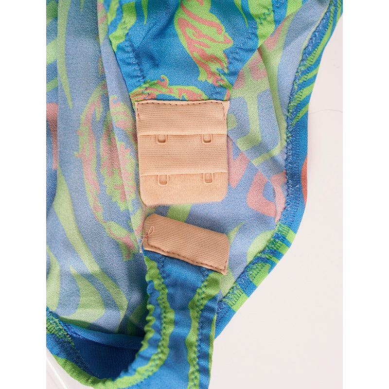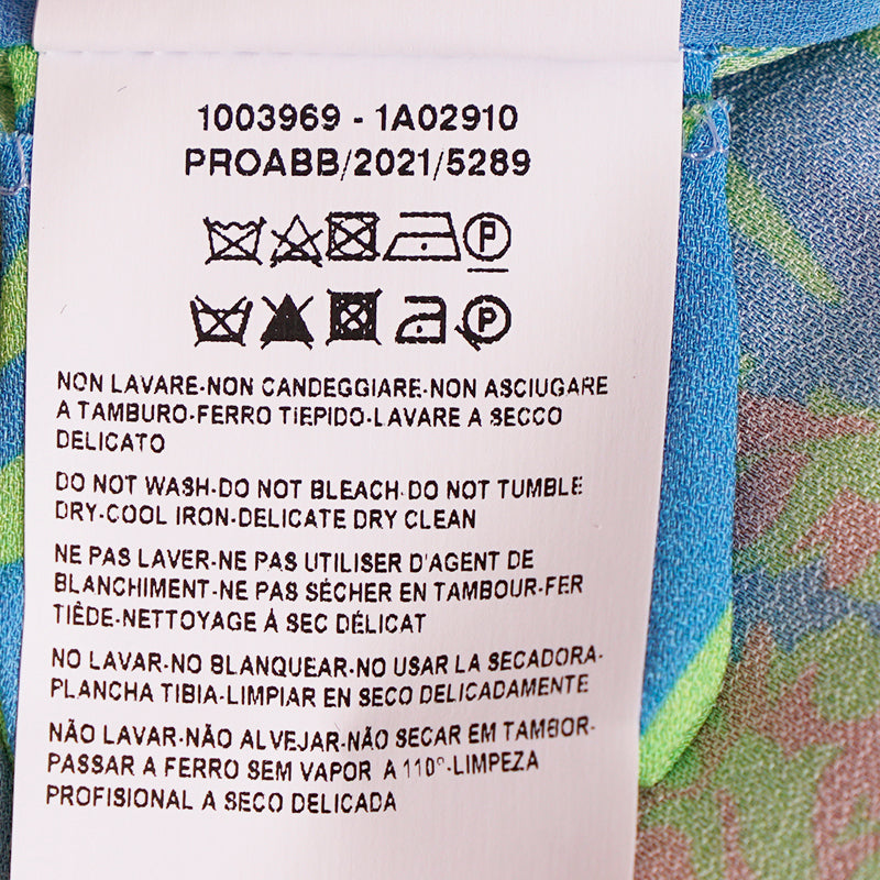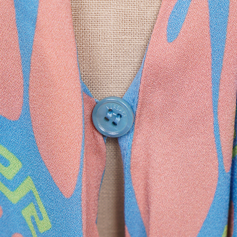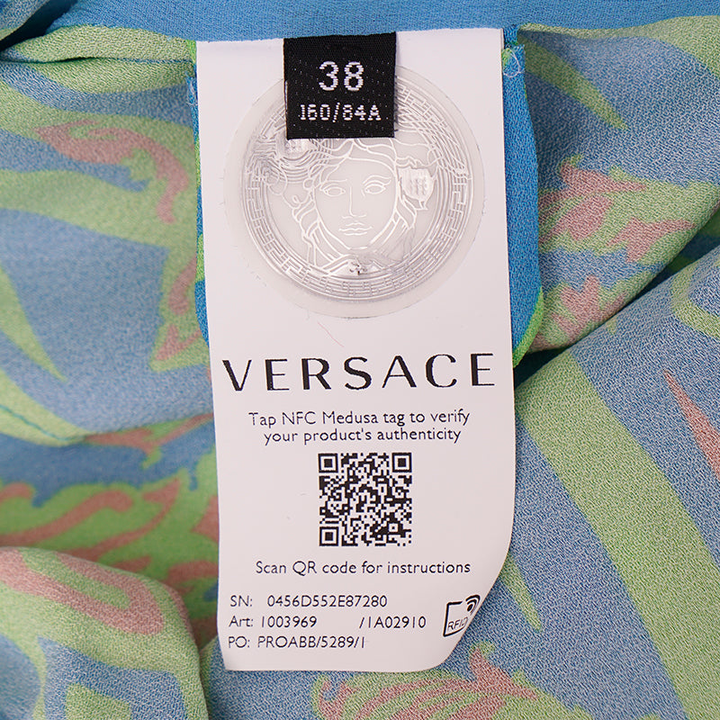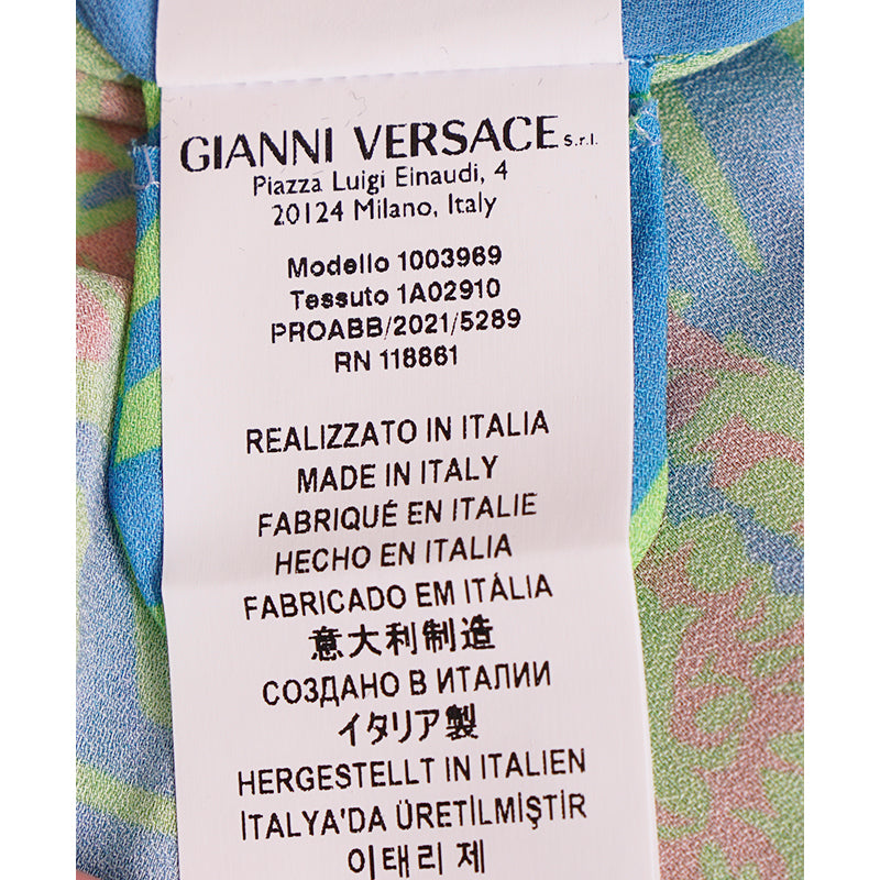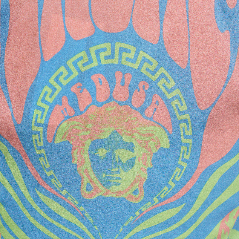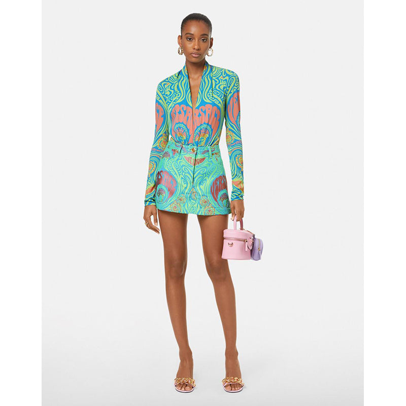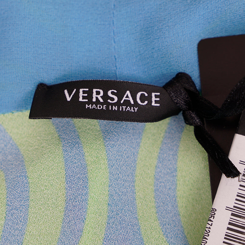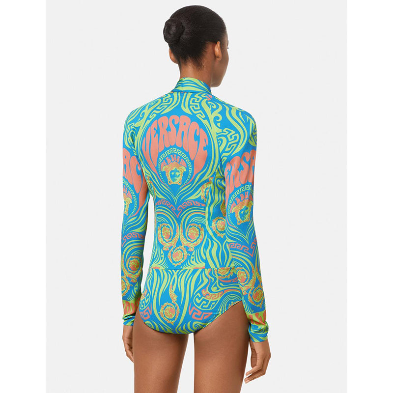 Authentic Versace bodysuit top from the 70's style music collection. Medusa Music print – a play on the psychedelic art style of the 70s. Teal blue, neon green and pastel pink. Stretch nylon jersey and silk. Split neckline with button closures (allows you to adjust how deep you want the V opening). Long sleeves. Large Medusa logo in back. Adjustable hook and eye gusset. 96% viscose, 4% elastane, Lining: 87% silk, 9% polyamide, 4% elastane. Gusset: 92% cotton, 8% elastane. Style 1003969. Made in Italy. Pair with everything to jeans to skirts. Sure to get noticed.