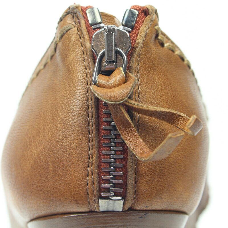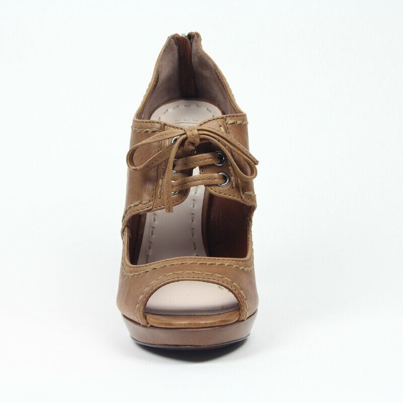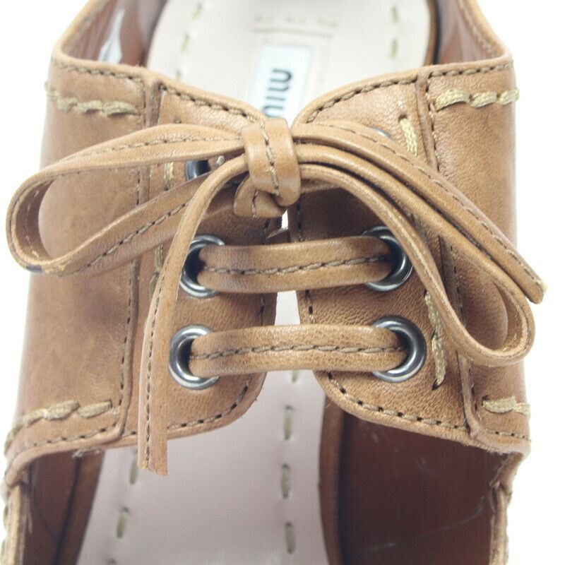 Authentic Miu Miu heels in a fun style. Medium brown, almost camel, in a vintage washed/rugged leather. Leather laces closure. Open peep toe. Back zip. Small platform. . Style 5Kp113. Made in Italy. Perfect with dresses to jeans. Has a very country girl vintage vibe.