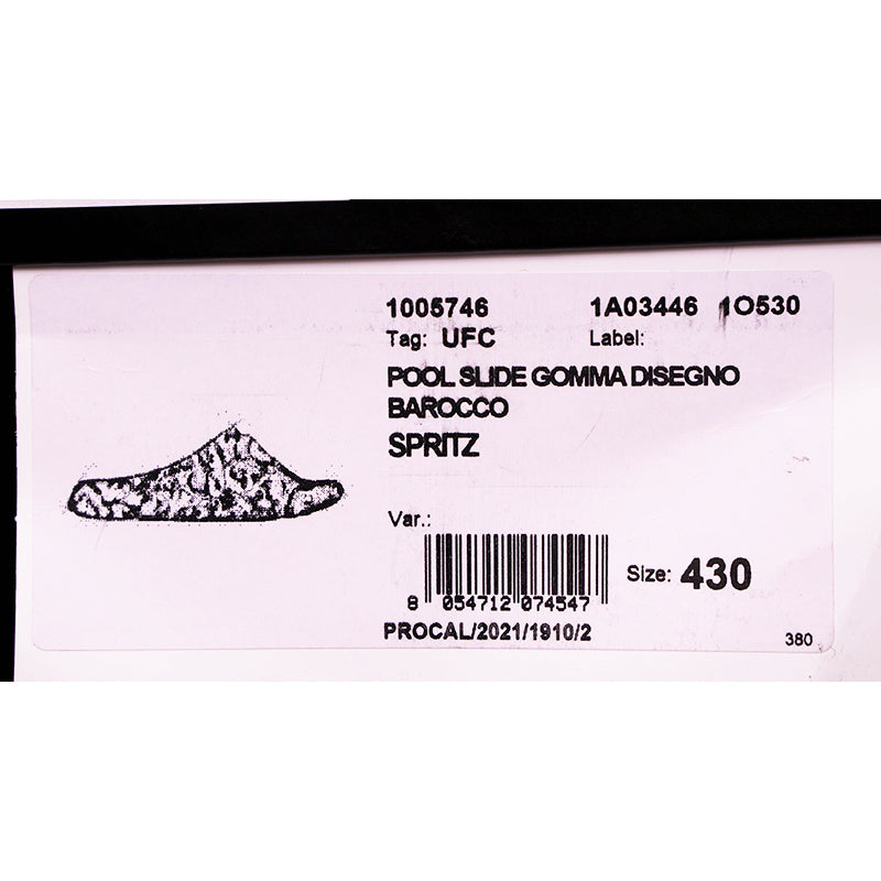 Authentic Versace sandals in an update style for summer that will take you into fall. Versace's iconic Barocco motif with its swirling acanthus leaves is transformed into a 3D rendition on this pool slide topped with a signature Medusa head in the center. Color is called Turquoise, it is a pretty green-blue turquoise. Style 1005746. Made in Italy. From the style to the bold color these are sure to get noticed.
