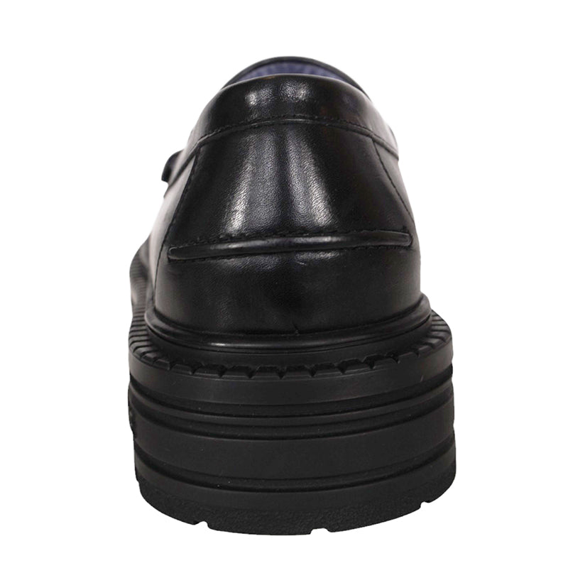 Authentic Versace loafers in a bold classic style. Crafted from smooth black calf leather with a chunky platform rubber sole for modern edge. Penny loafer style strap across the top, embossed with the Versace logo. Lined in a pretty contrasting blue leather. Style 1016084. Made in Italy. A versatile statement shoe, perfect for both elevated casual and sharp tailored looks.