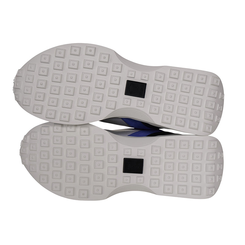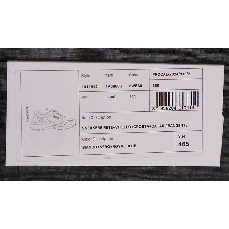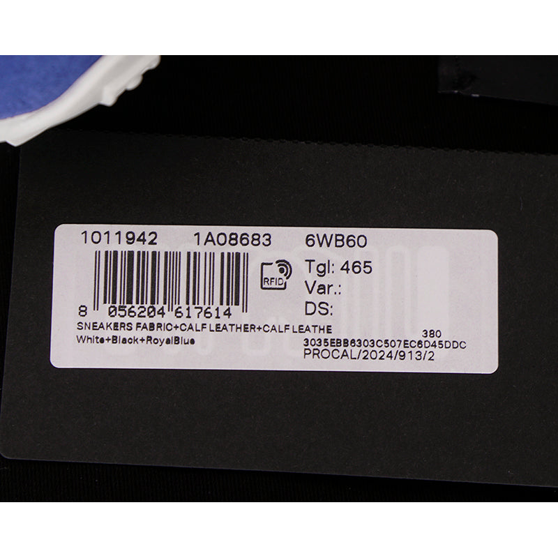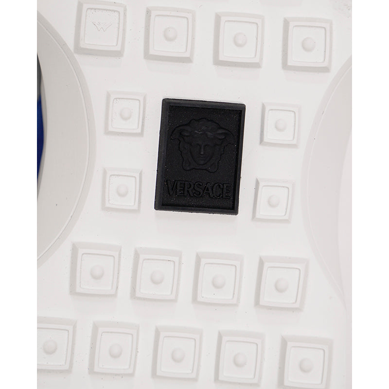 Authentic Versace low-top sneakers in a mod color block style. Leather, and suede in white, black, and royal blue. Layered panel construction with contrast materials and colors. Black Medusa logo head above laces. White rubber sole. Greca-pattern pull tab at heel. Logo on the side. Style 1A08683. Made in Italy. A contemporary athletic-inspired silhouette combining luxury craftsmanship with urban edge.