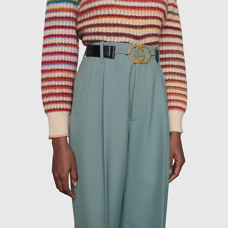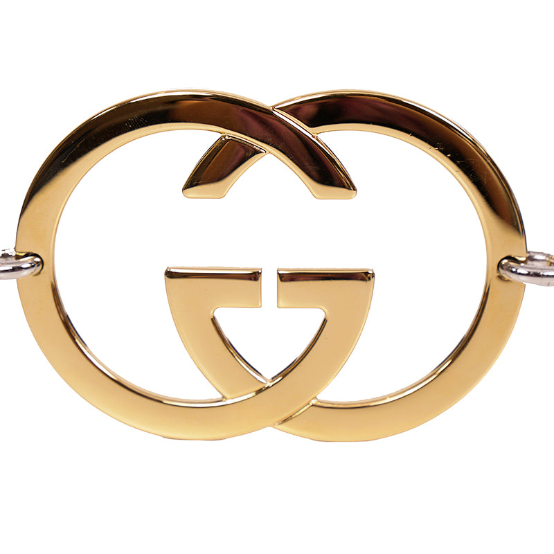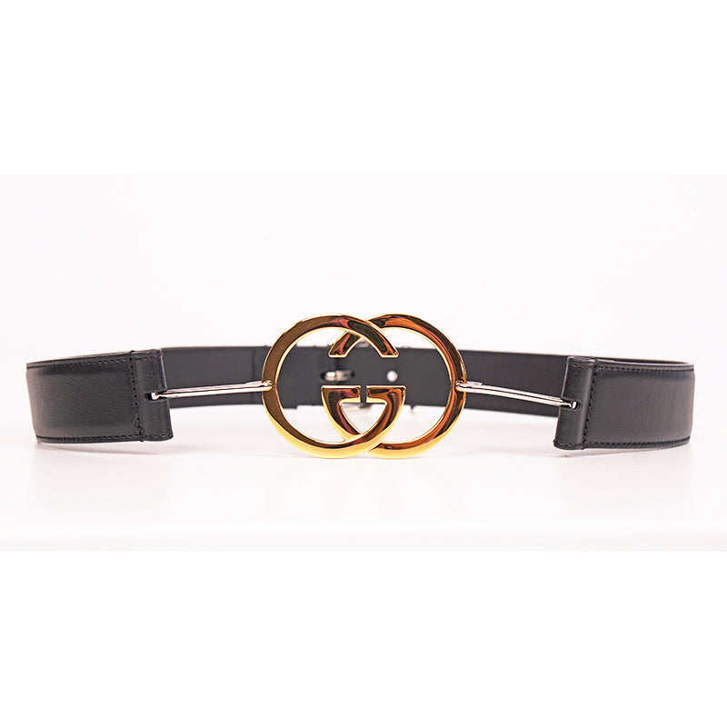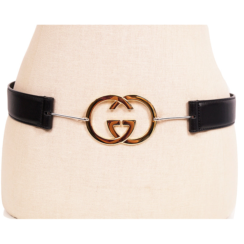 Authentic Gucci belt in a stunning stand out style. Black leather. Shiny gold-toned large interlocking G hardware in front center. Silver tone side hardware and buckle in back. Can be worn as a hip or waist belt. Style 636885. Made in Italy. Can be worn over a jacket or with a simple dress, even jeans. Sure to get noticed as it is stunning and very rare.