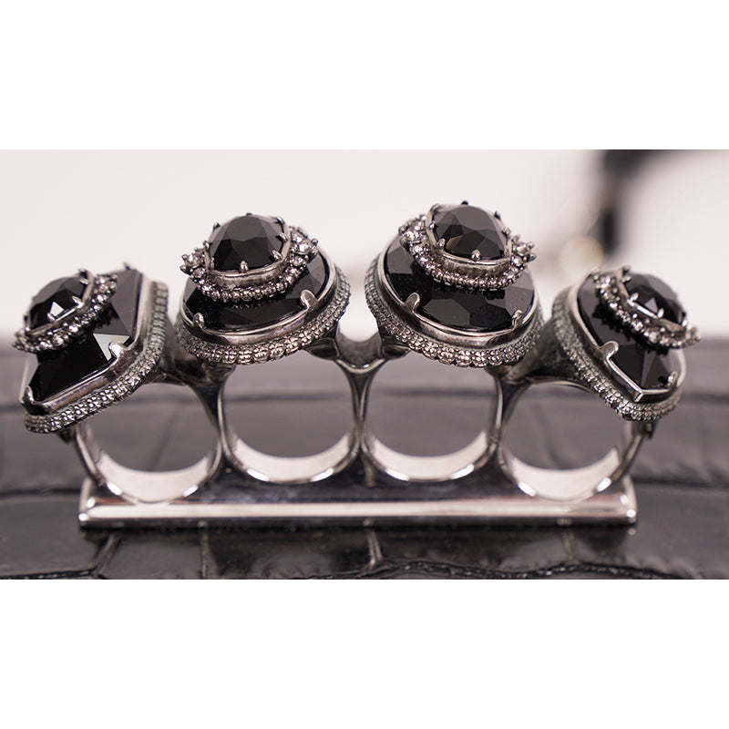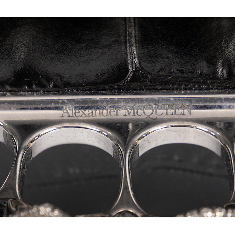 Authentic Alexander McQueen bag in a stunning gothic style. Black embossed croc calf leather. Black crystal encrusted four ring knuckle front accent. Magnetic flap closure. Black suede lining. Large main compartment. Interior zip pocket. Adjustable leather chain strap. Silver tone hardware. Style 570563. Made in Italy. Amazing and sure to get noticed. Perfect for the office or cocktails.