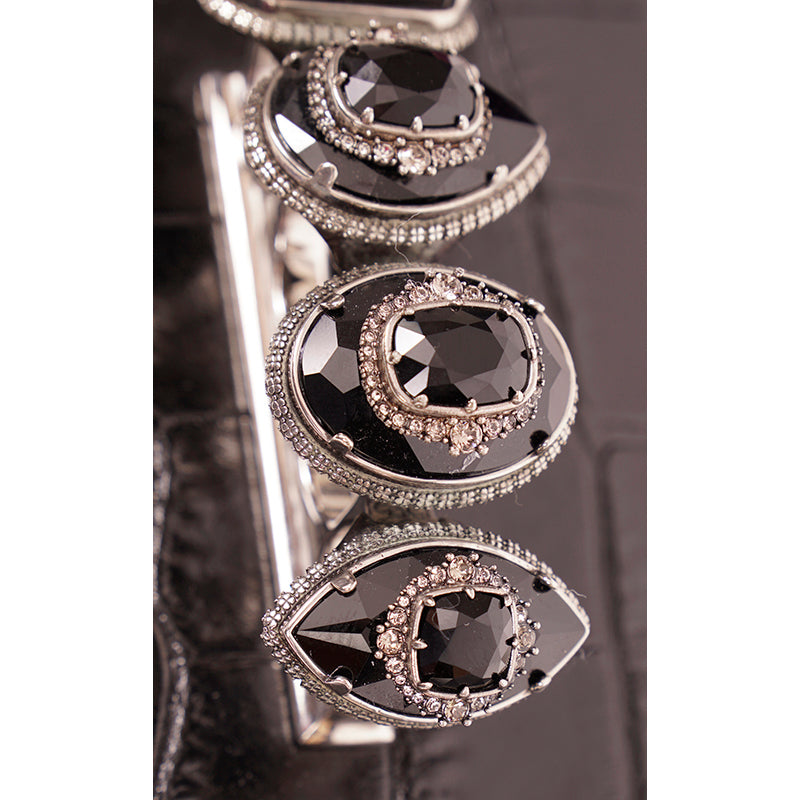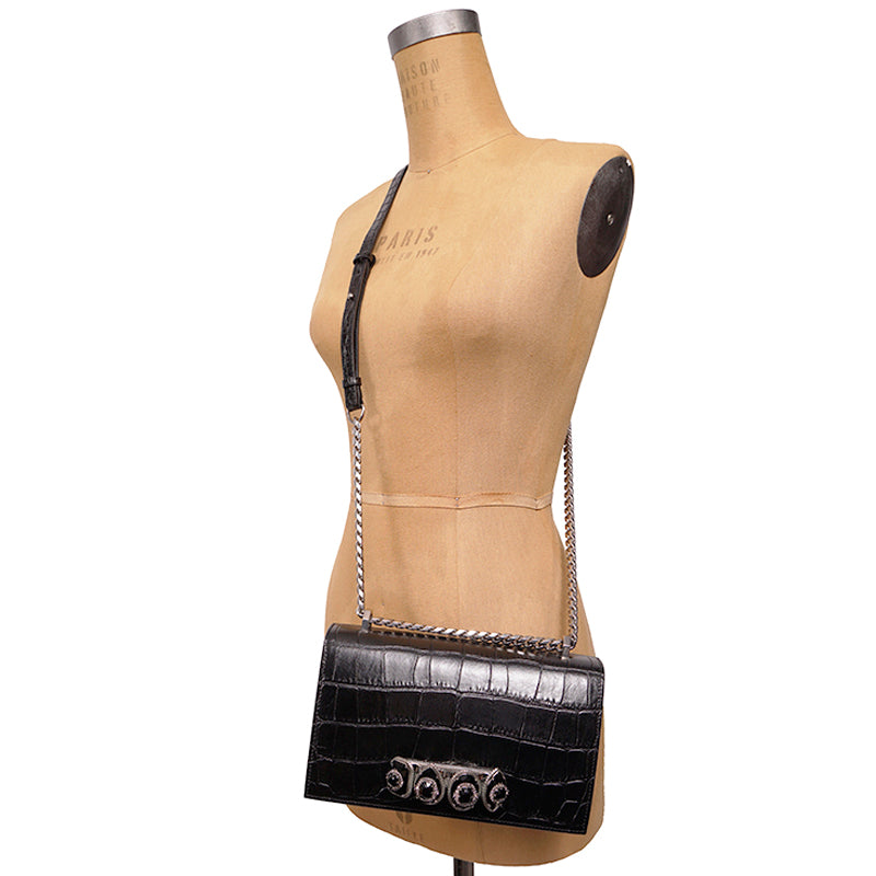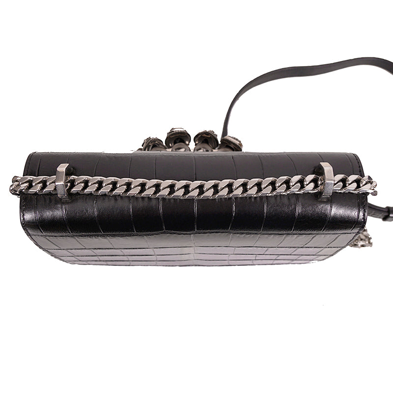 NEW $2395 ALEXANDER MCQUEEN Black Croc Embossed JEWELED KNUCKLE Chain FLAP BAG