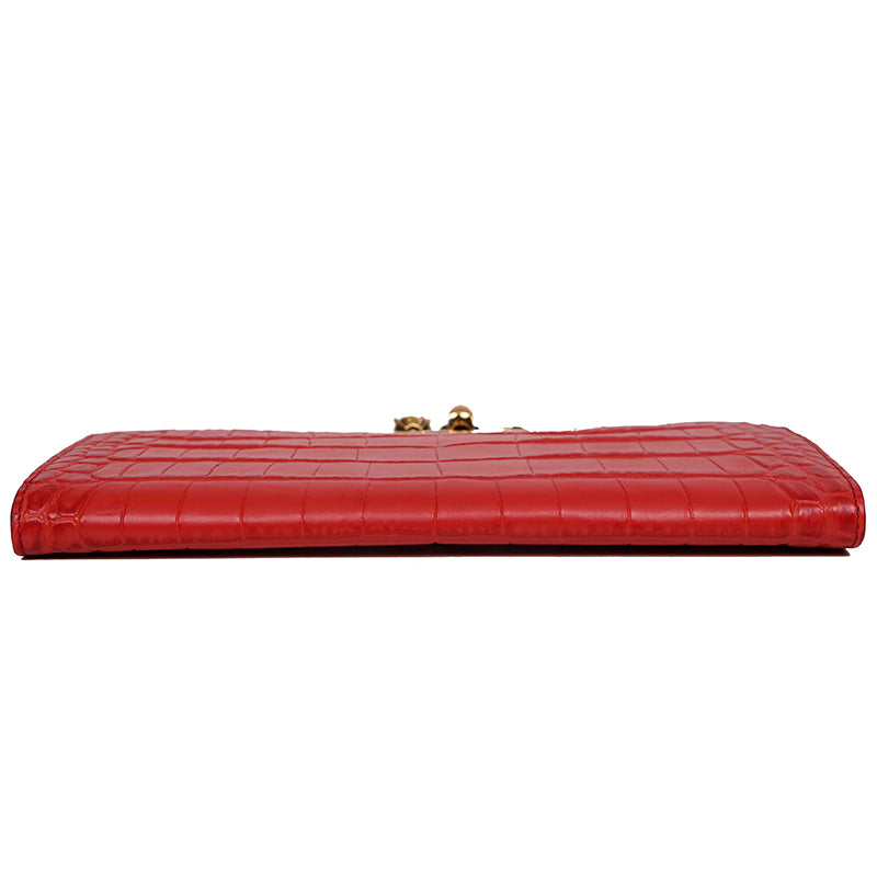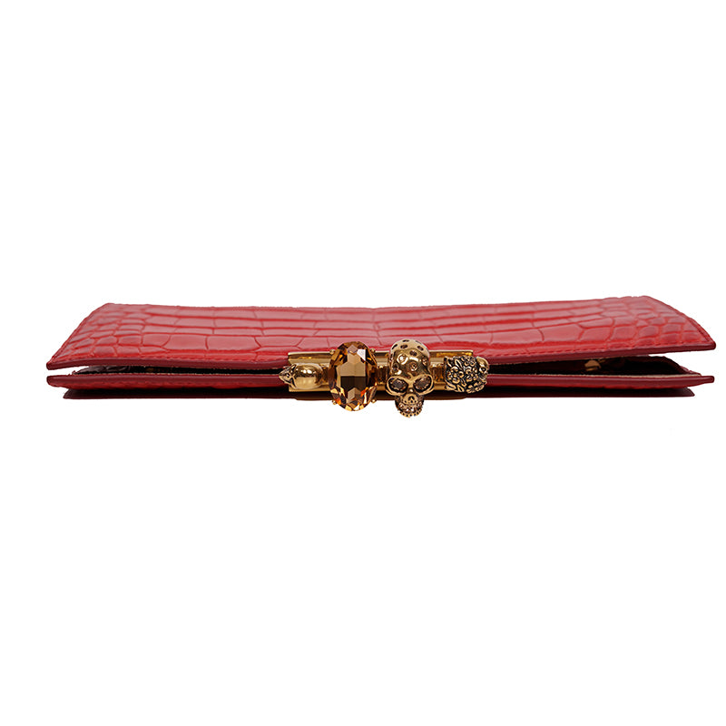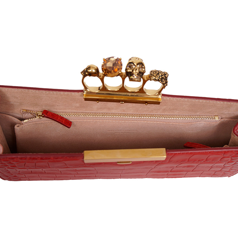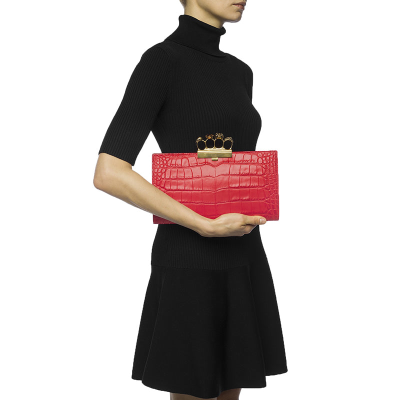 Authentic Alexander McQueen bag in a sleek style for day or night. A gilded handle adorned with Swarovski encrusted skull and flowers knuckle rings. Scarlet red in crocodile embossed leather. Push lock closure. Lined in blush suede leather. Interior zip pocket. Gold-tone hardware. Style 460427. Made in Italy. Pair with cocktail dresses to skinny jeans and heels.