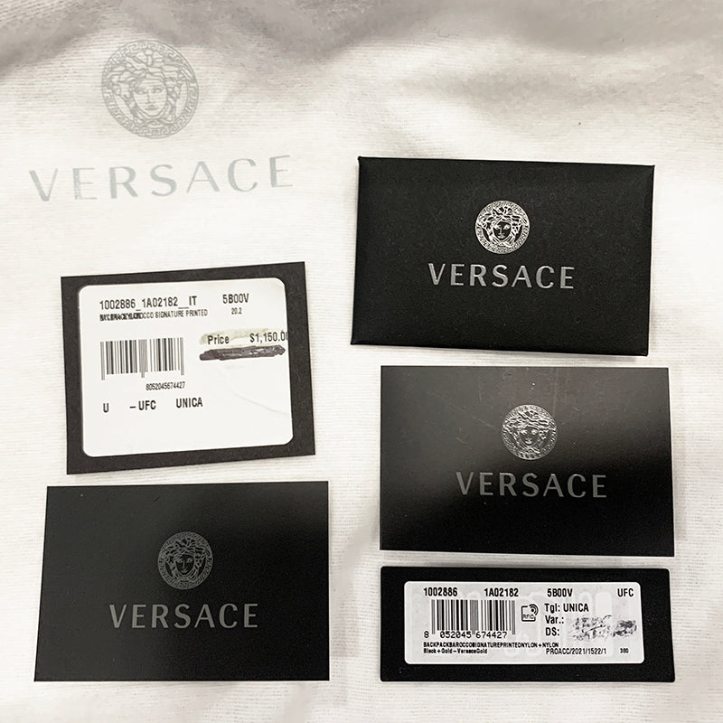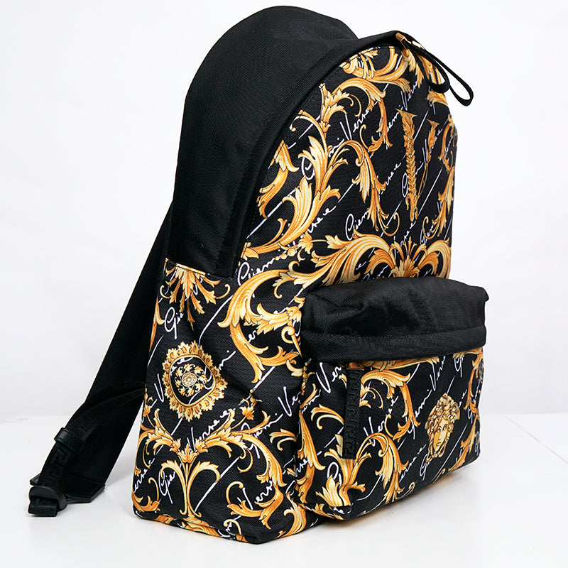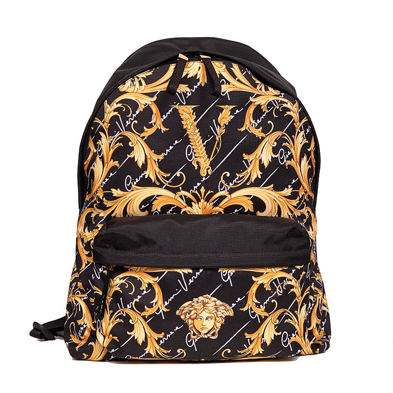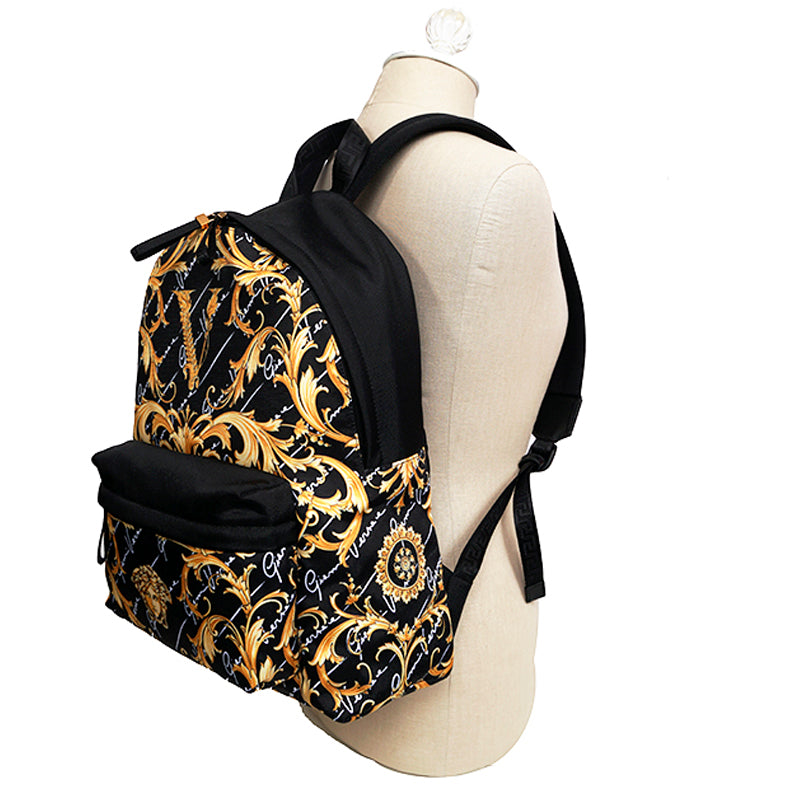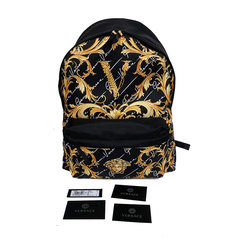 Authentic Versace backpack in a classic Baroque print. Black polyester canvas with Barocco and Signature print Large Virtus V logo and Medusa head logo. Front zip pocket, two-way curved zip top with Greca zipper pulls. Adjustable shoulder straps and handle back. Solid black back. Lined in black nylon. Made in Italy. Style 1002886. Sure to noticed. Makes a great gift.