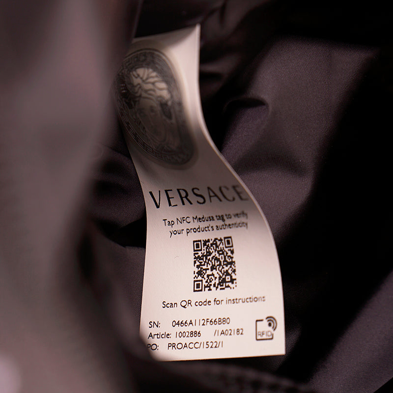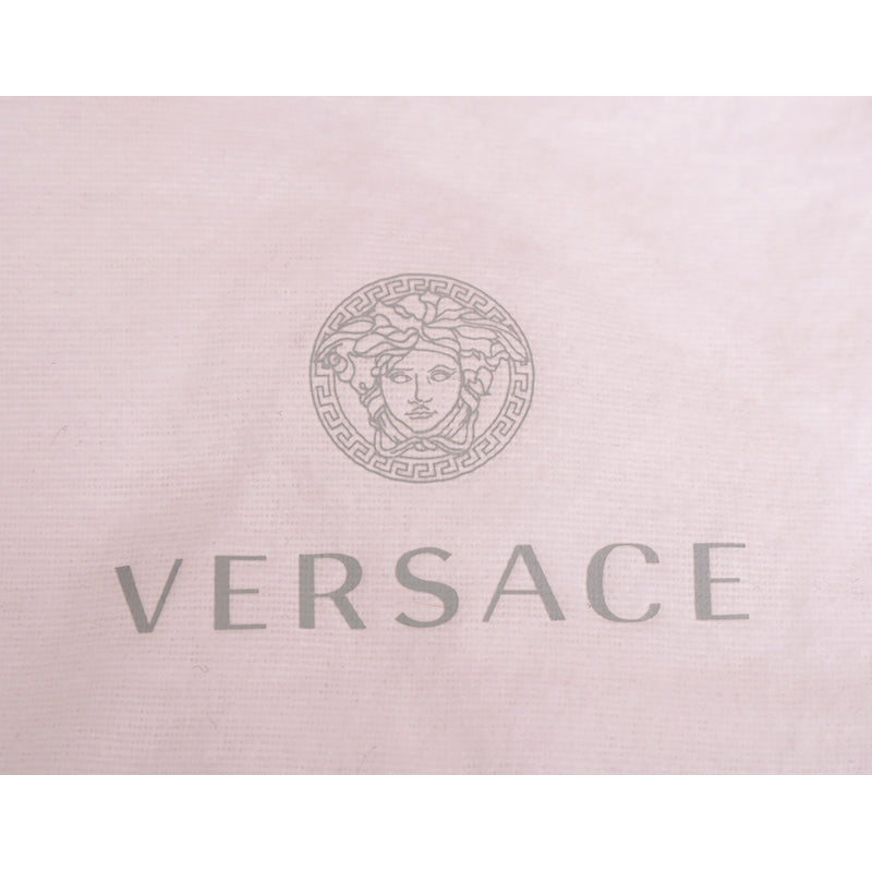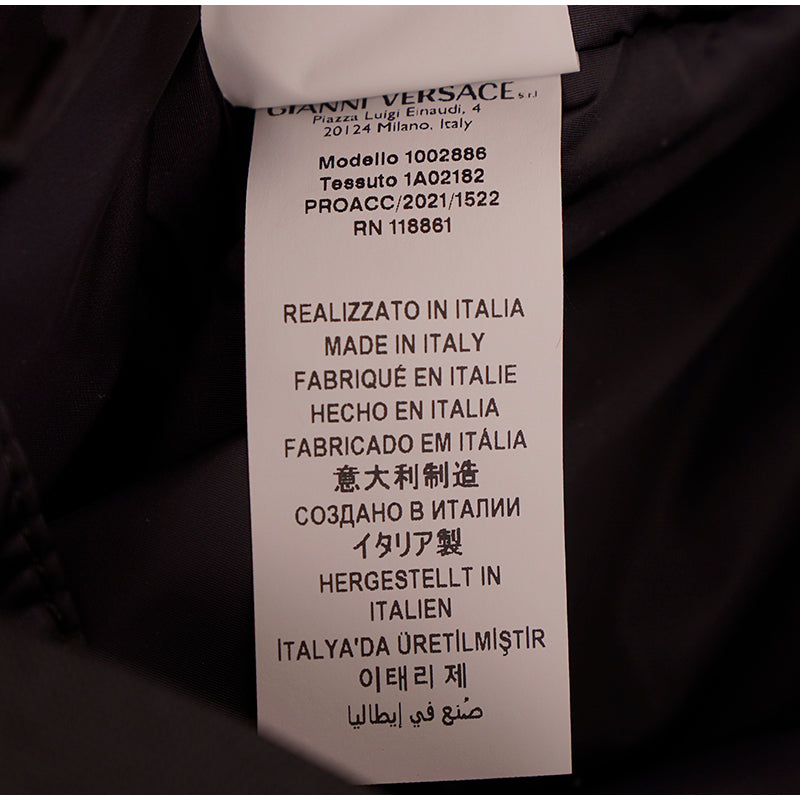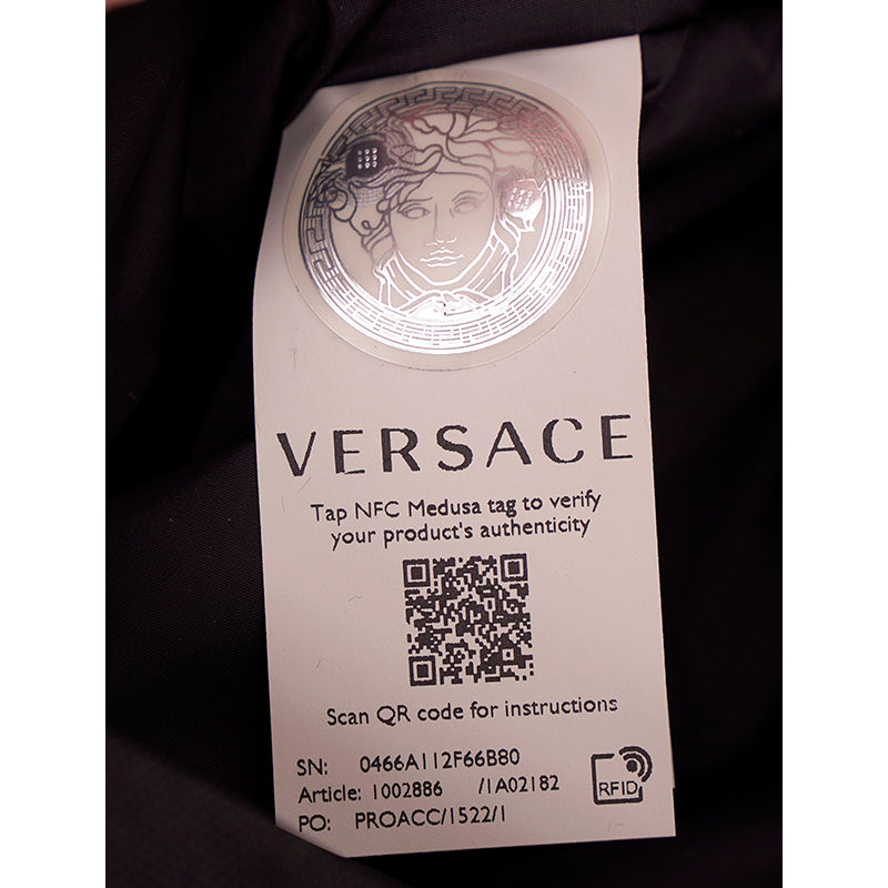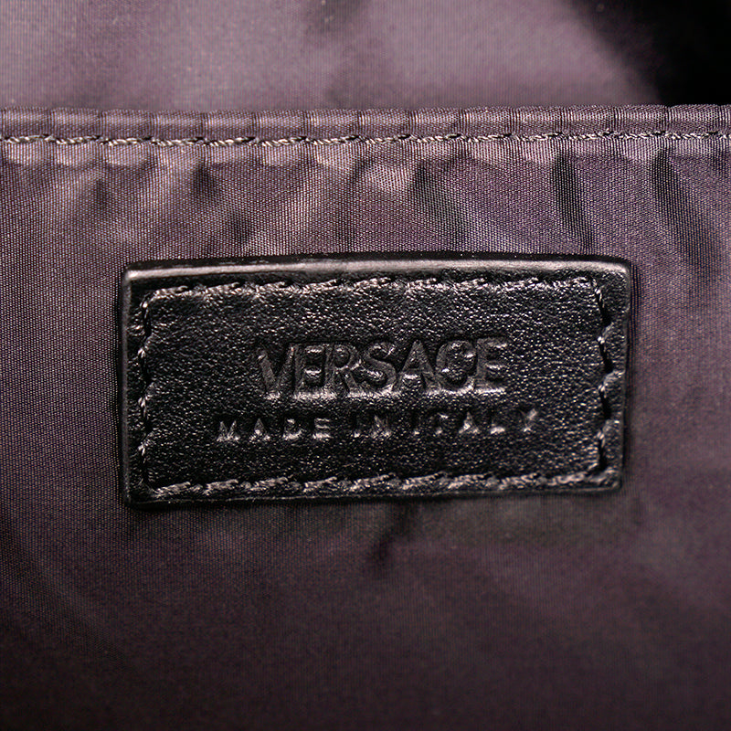 Authentic Versace backpack in a classic Baroque print. Black polyester canvas with Barocco and Signature print Large Virtus V logo and Medusa head logo. Front zip pocket, two-way curved zip top with Greca zipper pulls. Adjustable shoulder straps and handle back. Solid black back. Lined in black nylon. Made in Italy. Style 1002886. Sure to noticed. Makes a great gift.