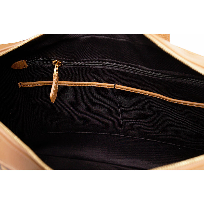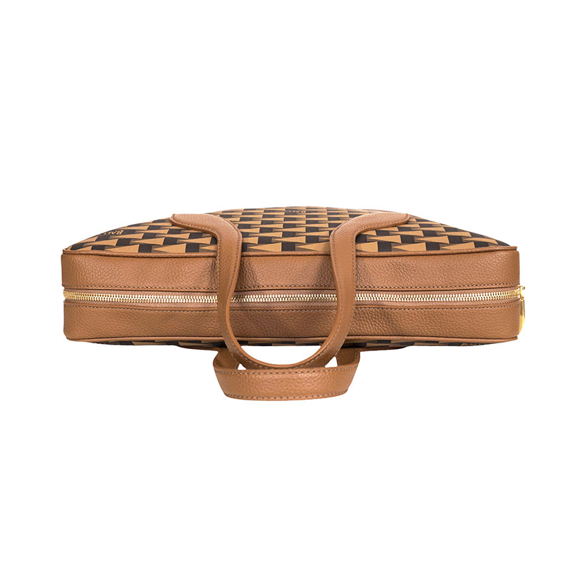Authentic Bally briefcase in a vintage varisty sports style print. Signature Pennant monogram in brown and camel geometric pattern with matching grain leather trim. Gold-tone hardware and protective feet at the base. Top double zip closure. Dual rolled leather handles and detachable shoulder strap. Black canvas interior with zip and slip pockets for organization. Style I8D40. A sharp and versatile piece for business or travel.