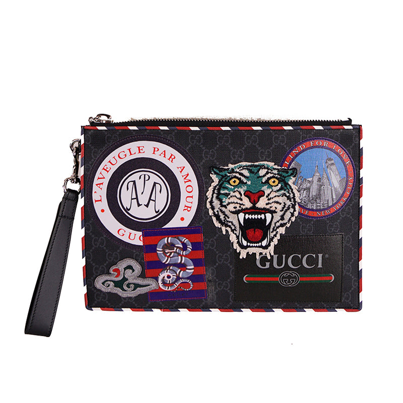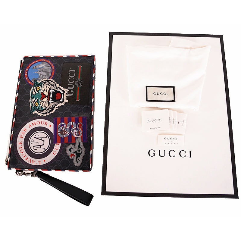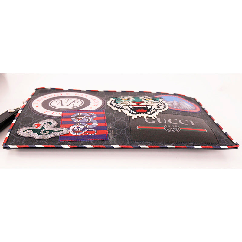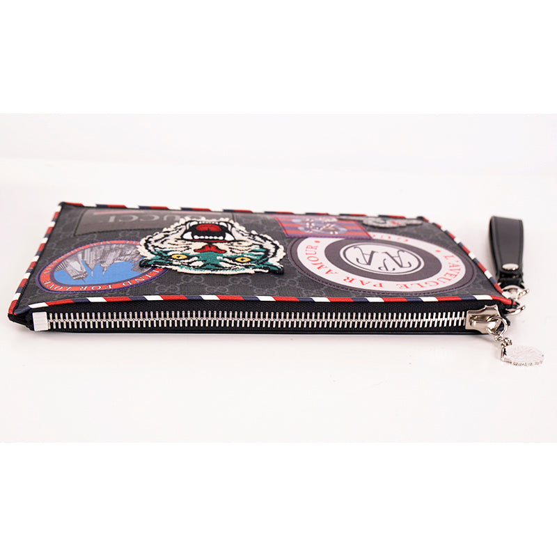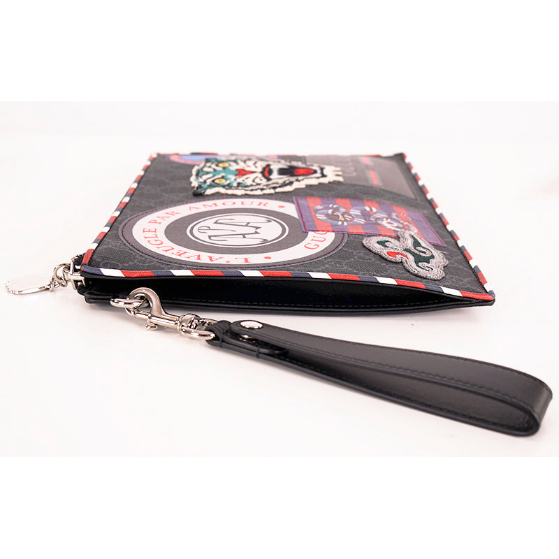 Authentic Gucci wristlet in a sleek everyday style. Black and grey GG Supreme canvas. Zip top closure. Removable leather wrist strap. UFO engraved zipper pull. Printed appliques patches with embroidered tiger head and cloud appliques. Airmail striped piping. Lined in canvas with leather interior card slots (6), Silver tone hardware. Style 496346. Made in Italy. Perfect for on the go, sure to get noticed.