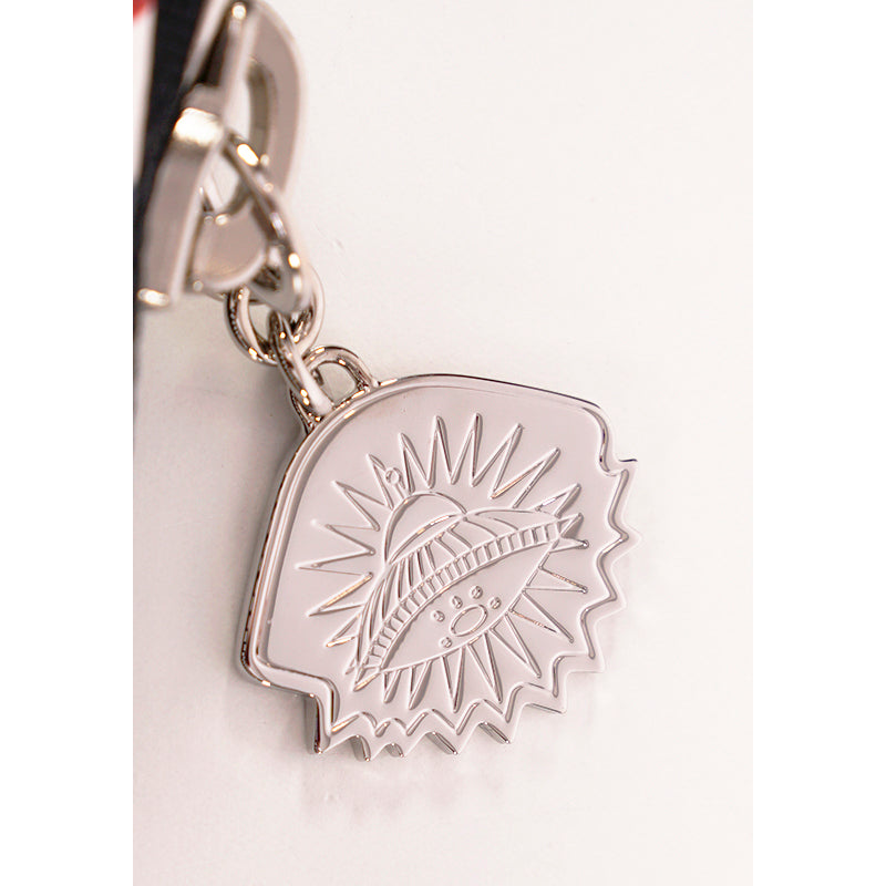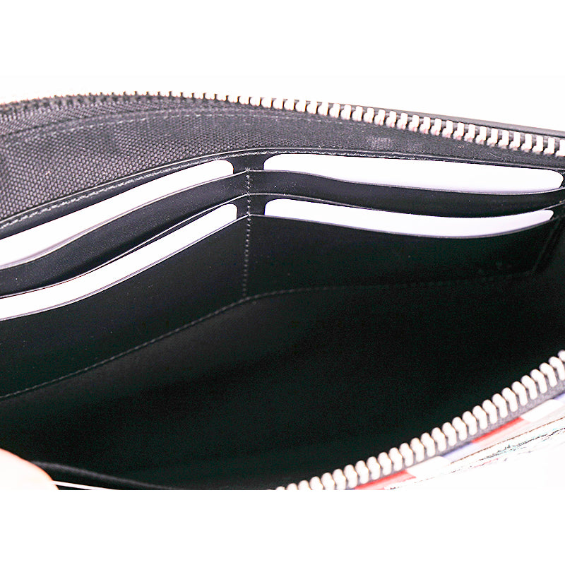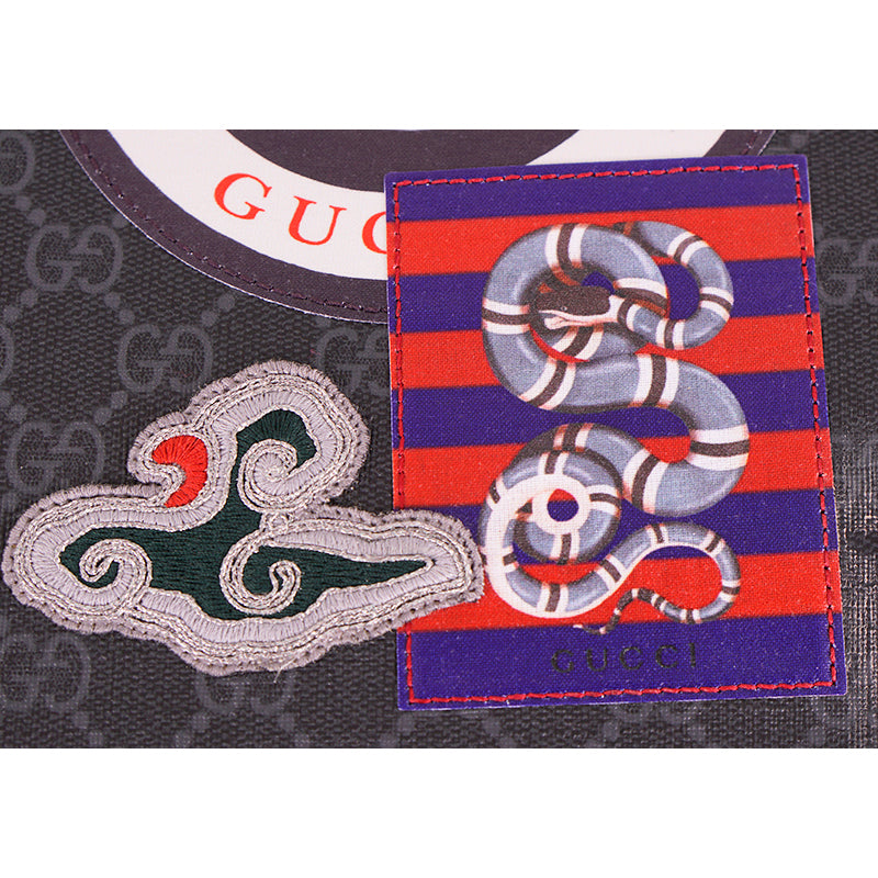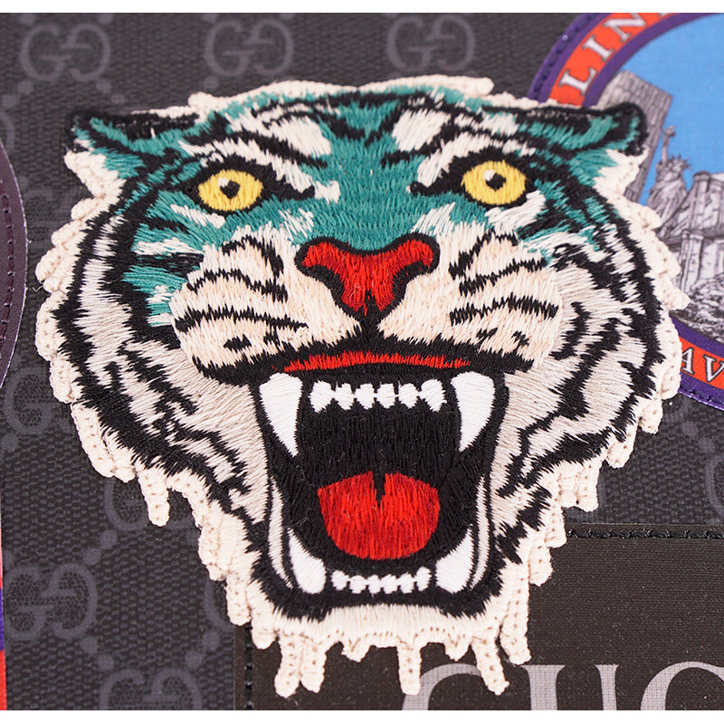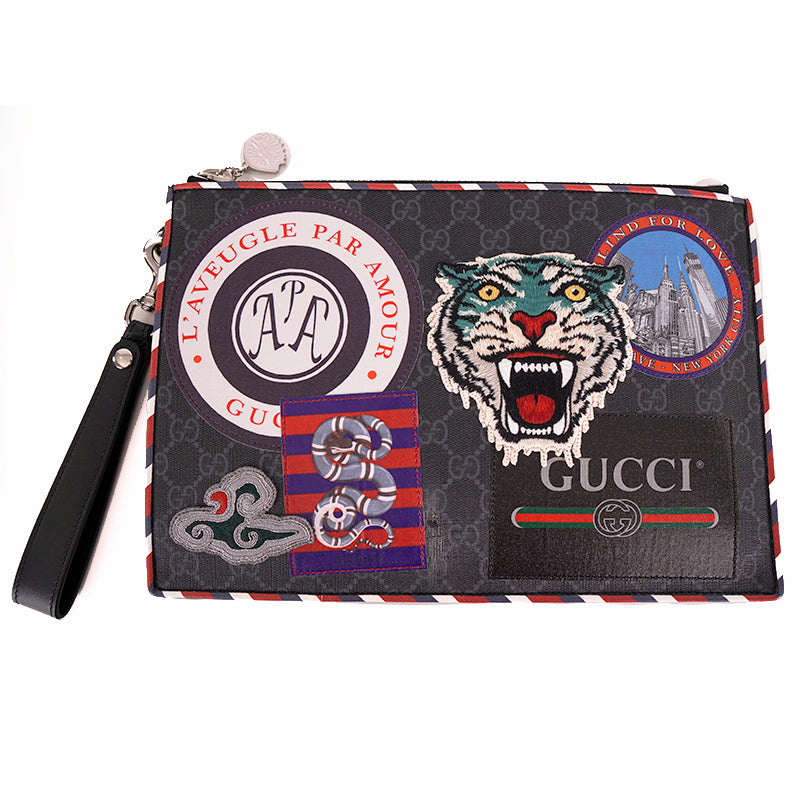 Authentic Gucci wristlet in a sleek everyday style. Black and grey GG Supreme canvas. Zip top closure. Removable leather wrist strap. UFO engraved zipper pull. Printed appliques patches with embroidered tiger head and cloud appliques. Airmail striped piping. Lined in canvas with leather interior card slots (6), Silver tone hardware. Style 496346. Made in Italy. Perfect for on the go, sure to get noticed.