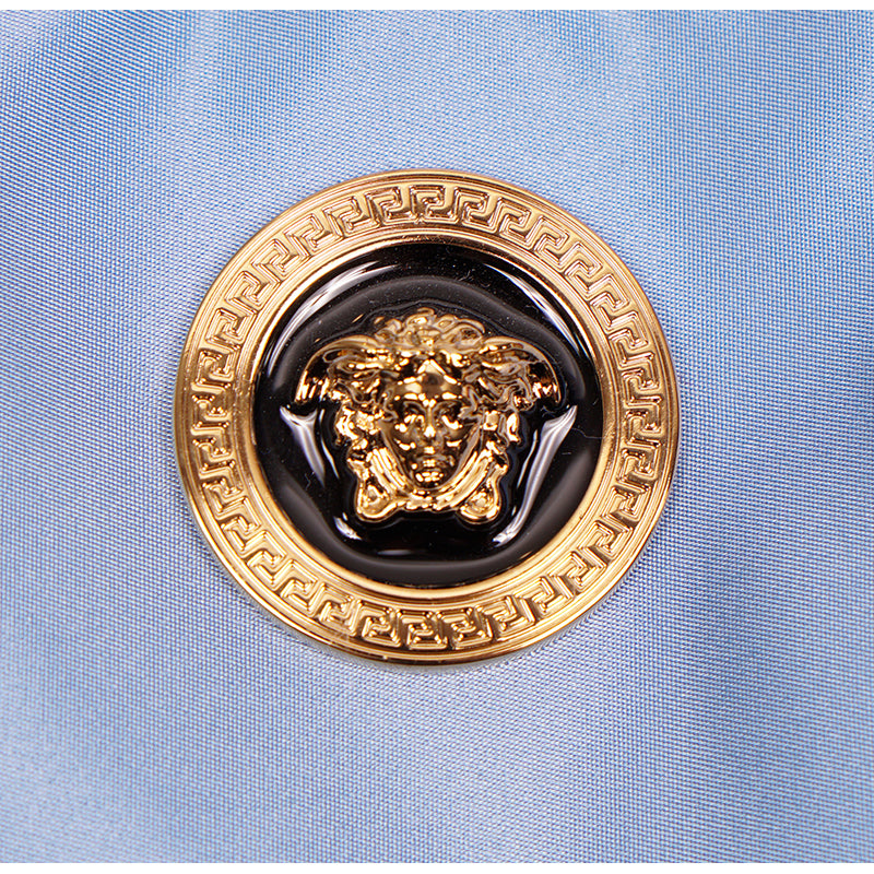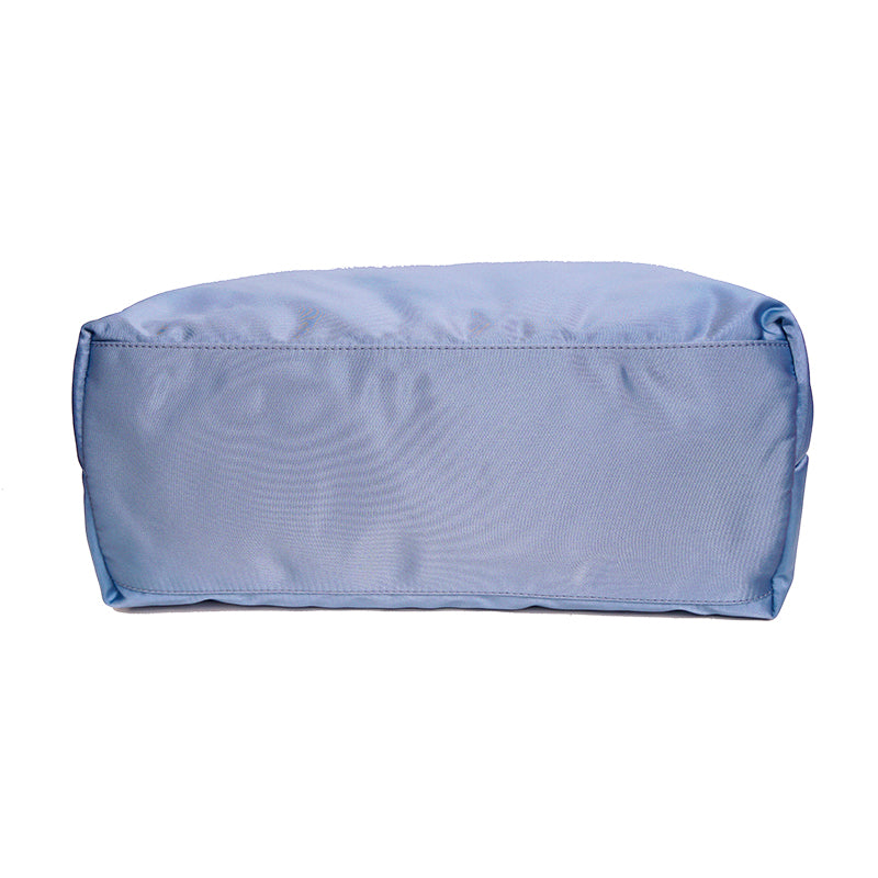 Authentic Versace tote in a pretty hue. Called Cornflower blue in all nylon. Double black leather shoulder straps. Zip top. Gold tone with black enamel Medusa Logo medallion in front. Zip top with leather zipper pull. Inside has one zipper pocket. Lined in a black nylon. Style 1005936. Made in Italy. Great tote for the office or weekends. Folds up for easy travel.