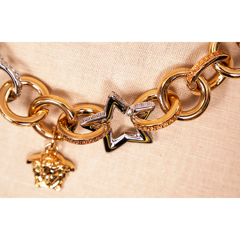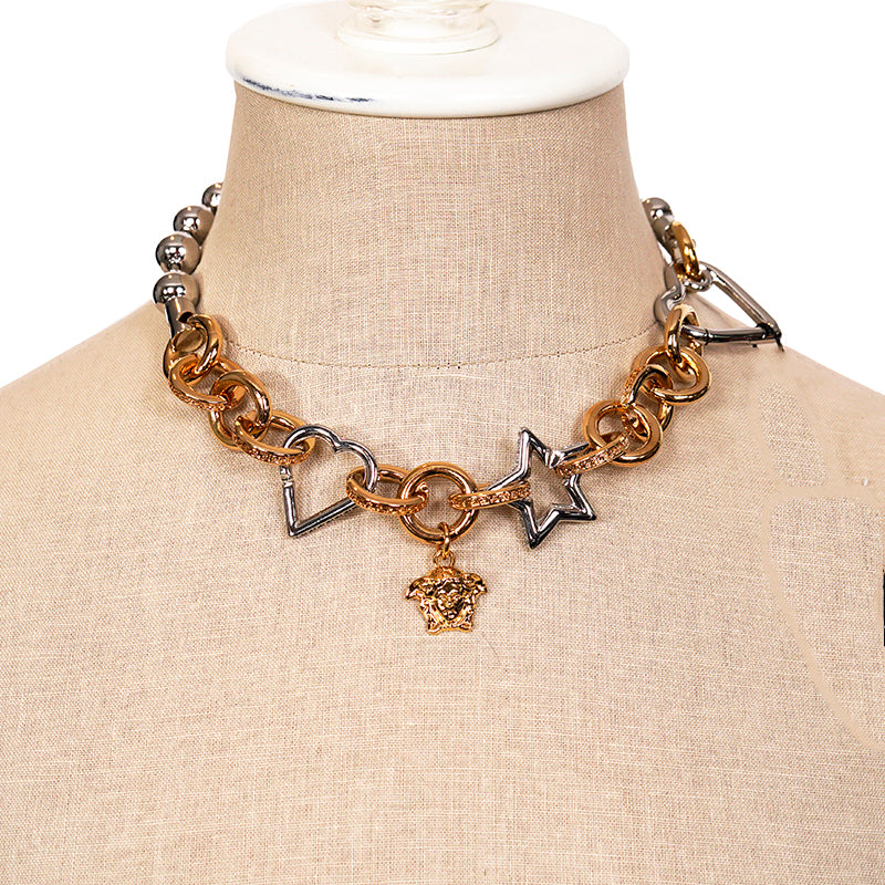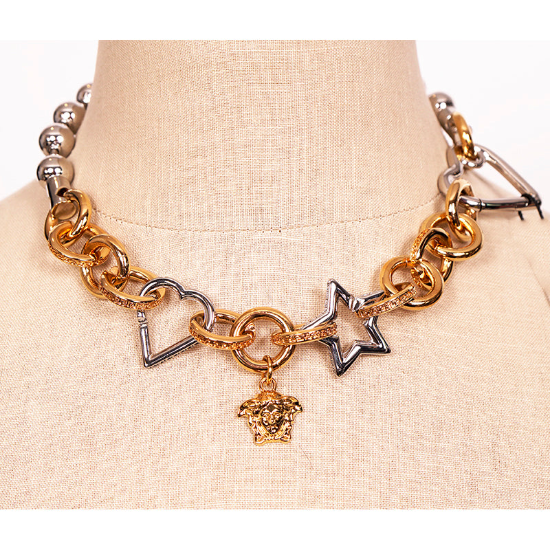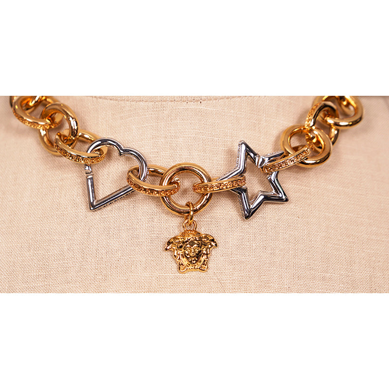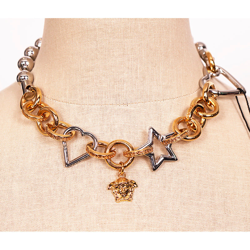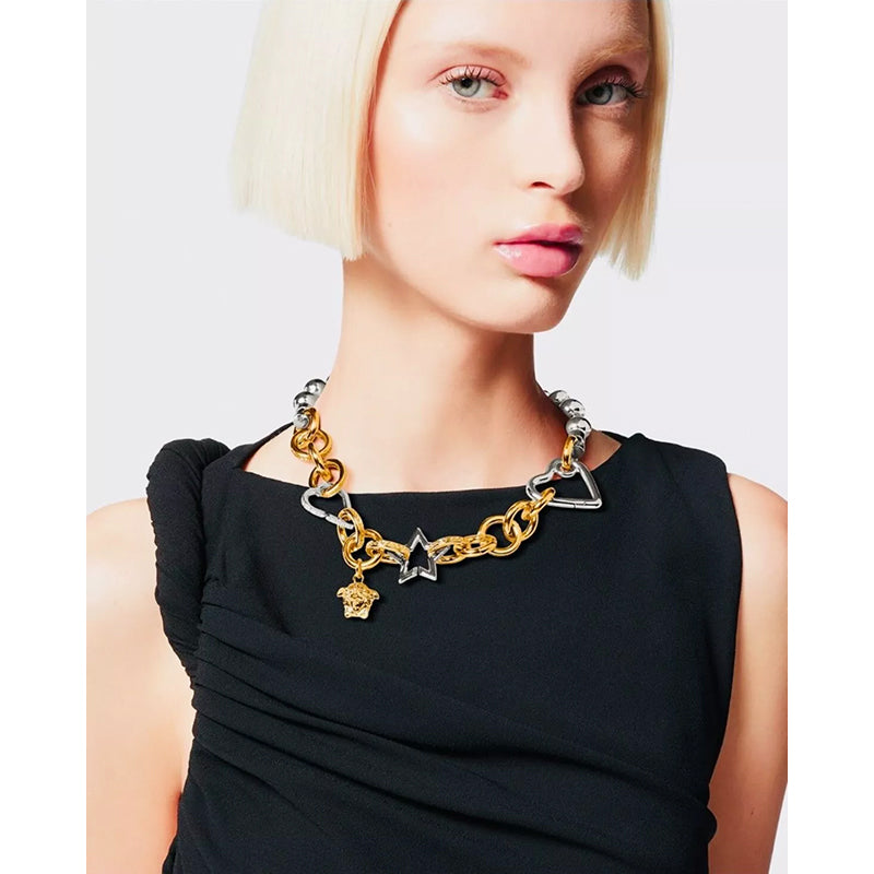 Authentic Versace necklace in a glam style. Gold and silver-tone in brass. Polish finish. Signature Medusa Head pendant charm dangles from a chunky chain. Star and heart links with Greca details. Cable-link chain in front with ball chain in back. Heart is the clasp. Style 1008310. Made in Italy. Can be worn out for cocktails or just with jeans and a tee.