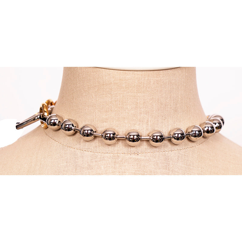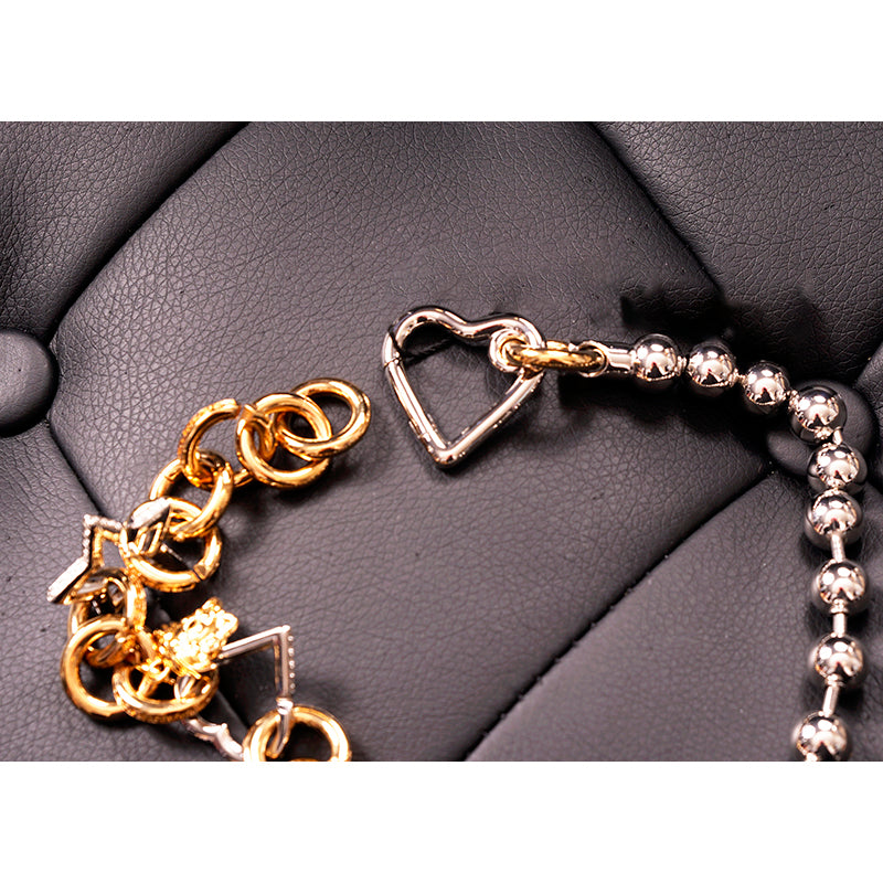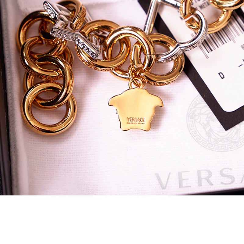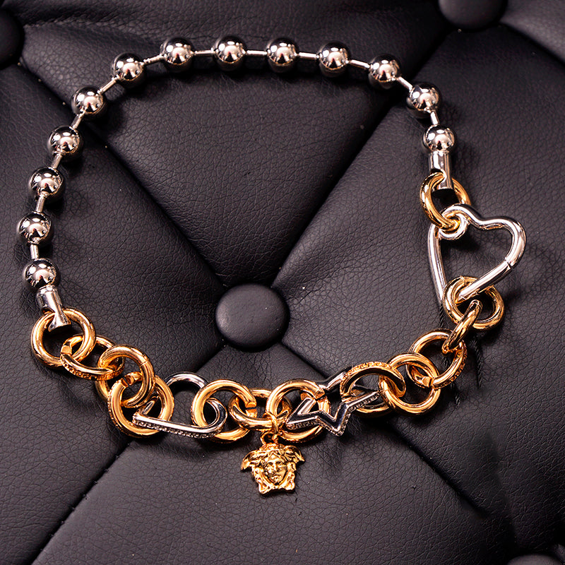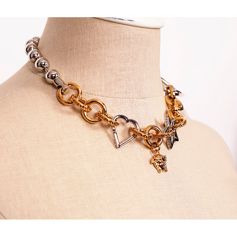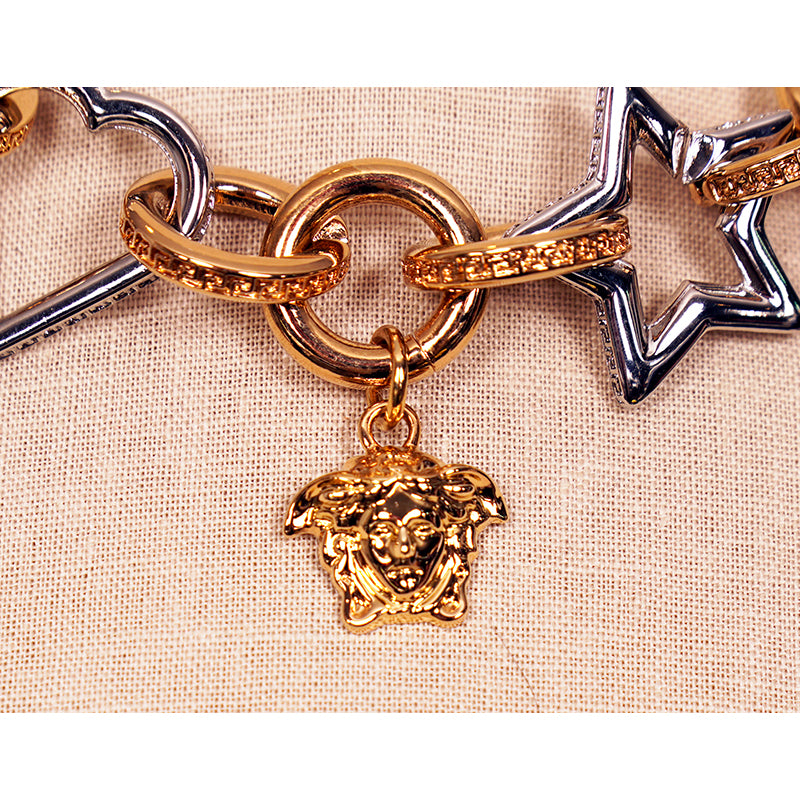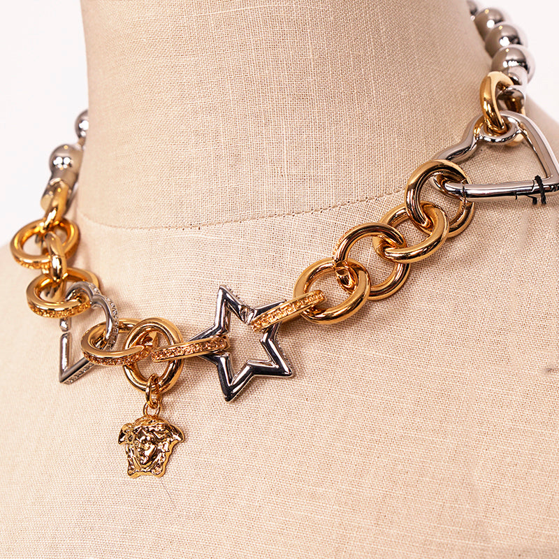 Authentic Versace necklace in a glam style. Gold and silver-tone in brass. Polish finish. Signature Medusa Head pendant charm dangles from a chunky chain. Star and heart links with Greca details. Cable-link chain in front with ball chain in back. Heart is the clasp. Style 1008310. Made in Italy. Can be worn out for cocktails or just with jeans and a tee.