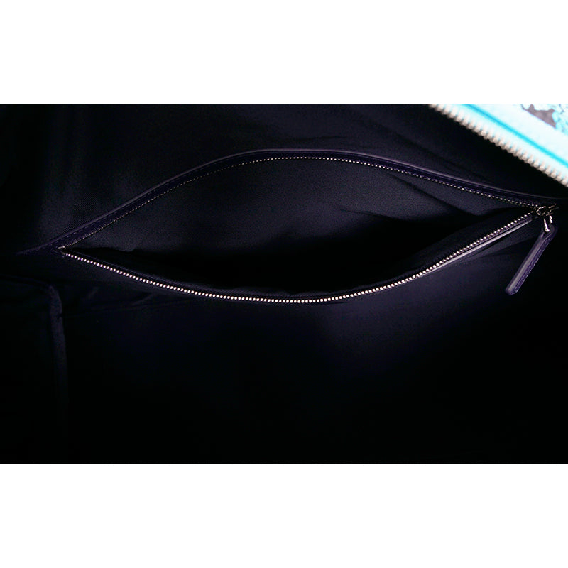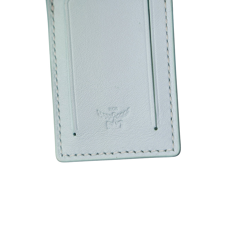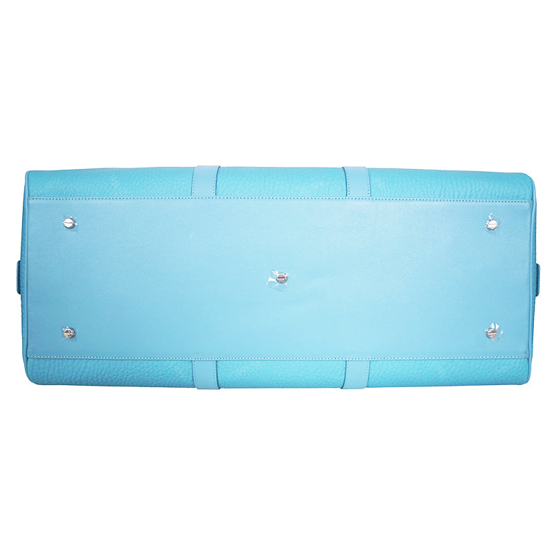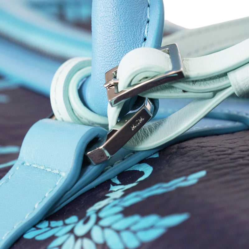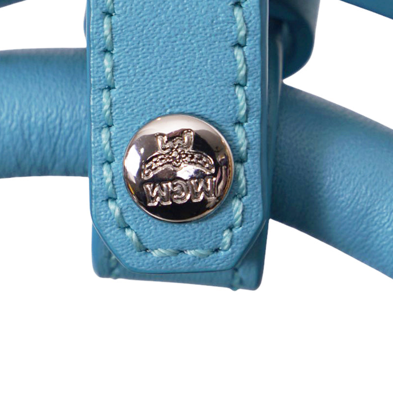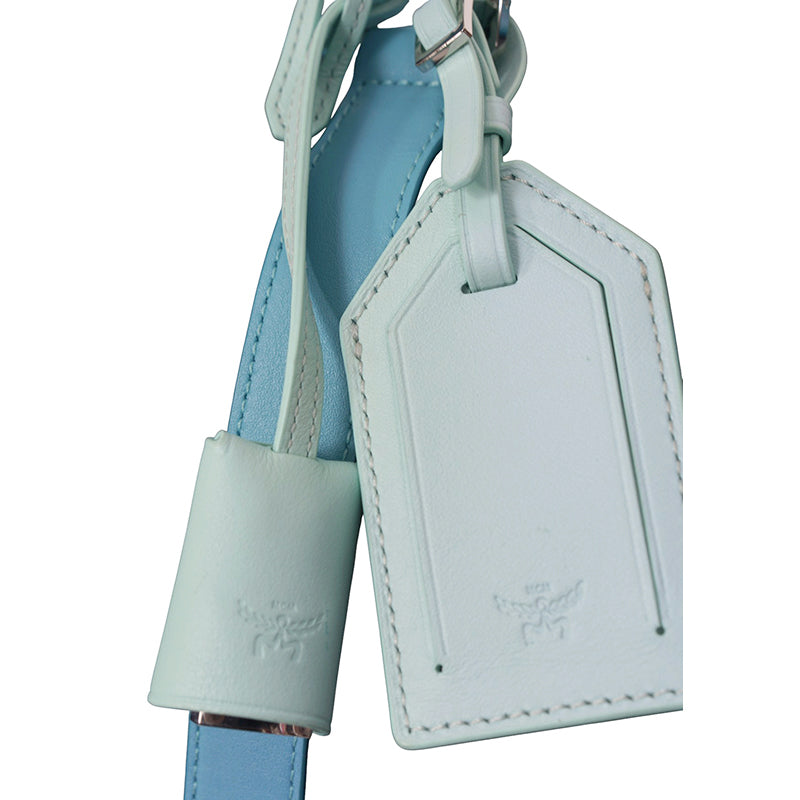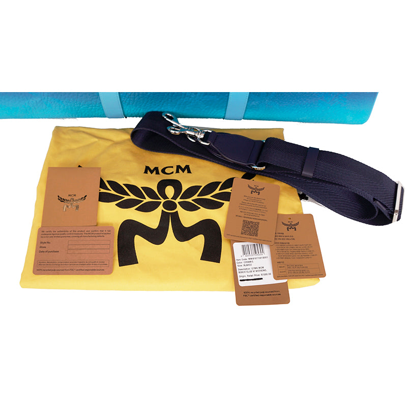 Authentic MCM Ottomar Weekender bag in a jet-setting style. Whimsical aqua blue palm tree monogram print on Visetos coated canvas. Ceramic blue leather top handles and trim. Silver-tone cobalt metal hardware. Leather hang tag. Removable/adjustable herringbone webbing strap. Two-way extended zip closure. Interior pockets and zip compartment. Protective metal feet. Body: monogram canvas. Made in South Korea. Style MMVFSTT021B001. Simply stunning and sure to get noticed.
