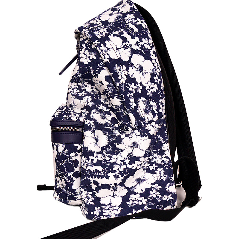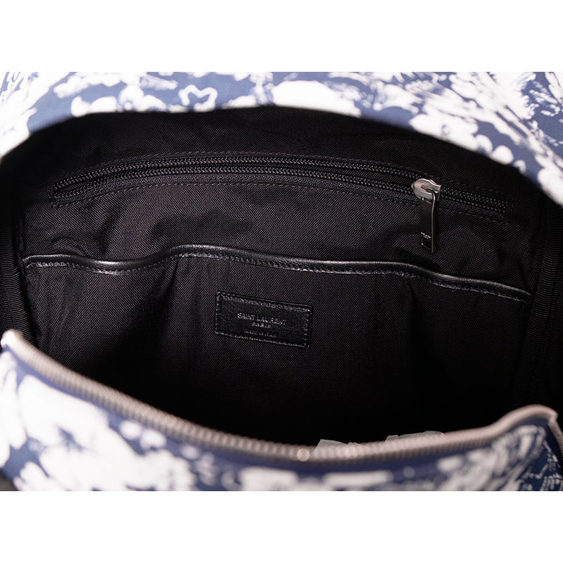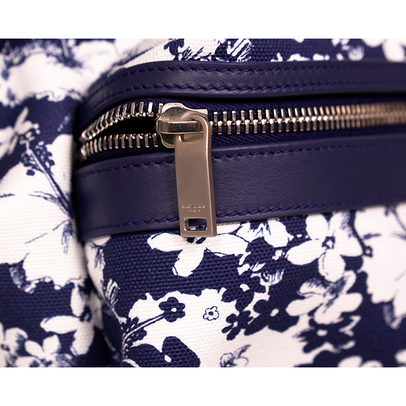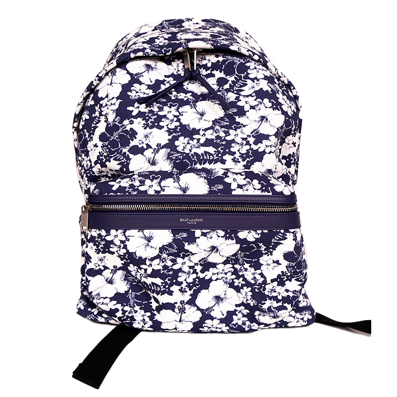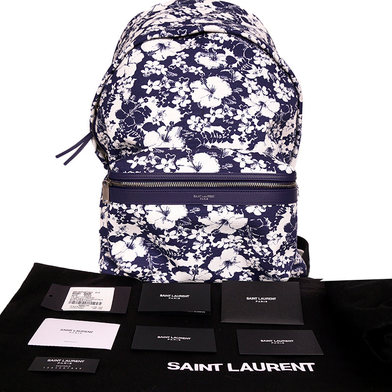 Authentic Saint Laurent city backpack in a fun tropical print. A pretty blue with white hibiscus floral print. Durable canvas and reinforced with matching blue leather trim. Roomy main compartment, large front pocket, plus two extra inside for storing a charger or a paperback. Adjustable shoulder straps and handle back. Black mesh back and a hole for threading headphones to a media device. Matte silver tone hardware. Leather logo bag fob. Style 534967. Made in Italy. Great bag for the gym, weekend getaways or around town.