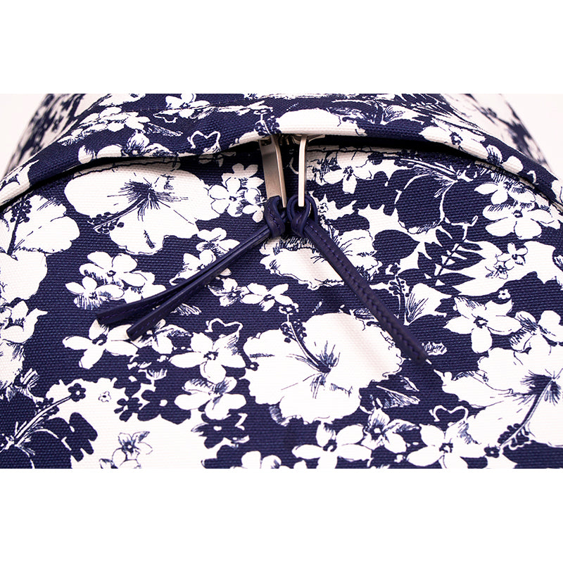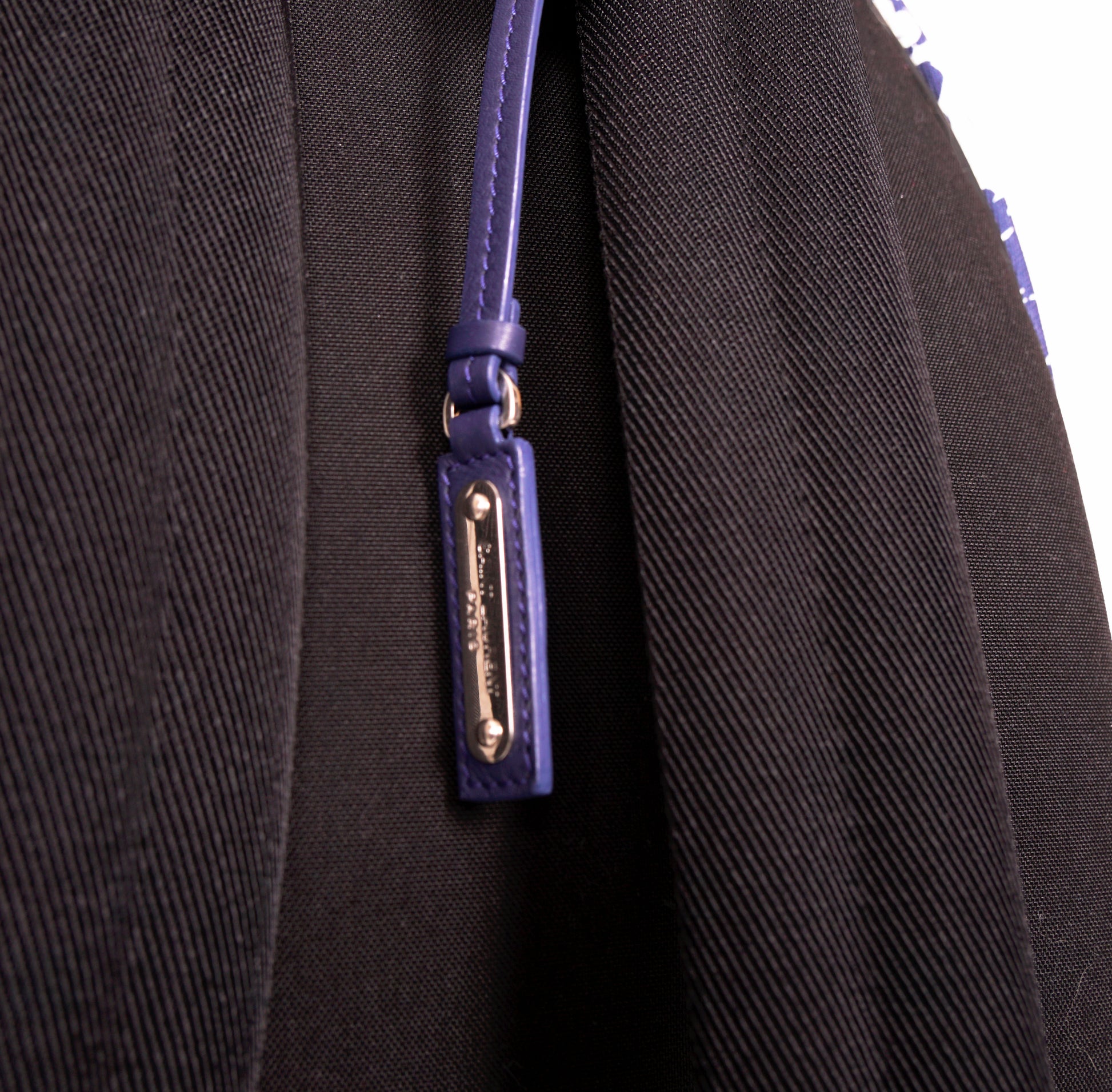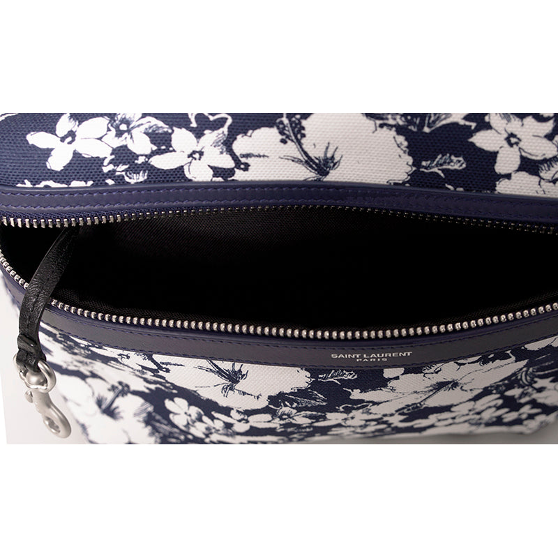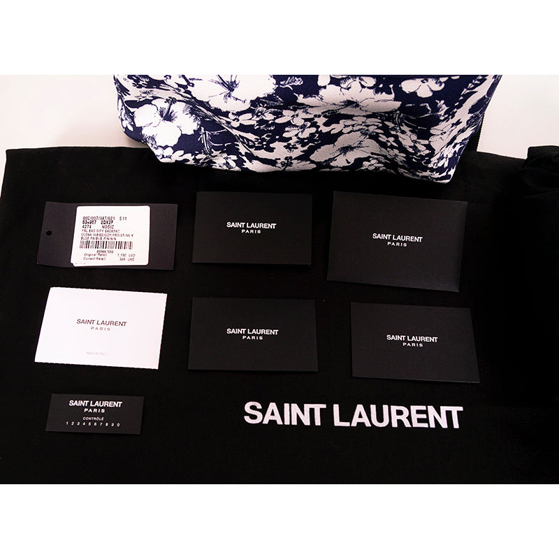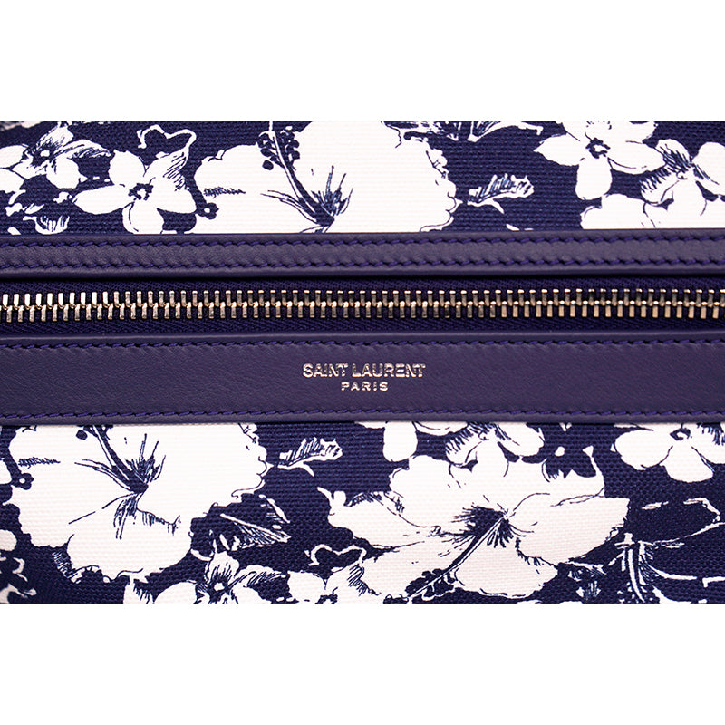 Authentic Saint Laurent city backpack in a fun tropical print. A pretty blue with white hibiscus floral print. Durable canvas and reinforced with matching blue leather trim. Roomy main compartment, large front pocket, plus two extra inside for storing a charger or a paperback. Adjustable shoulder straps and handle back. Black mesh back and a hole for threading headphones to a media device. Matte silver tone hardware. Leather logo bag fob. Style 534967. Made in Italy. Great bag for the gym, weekend getaways or around town.