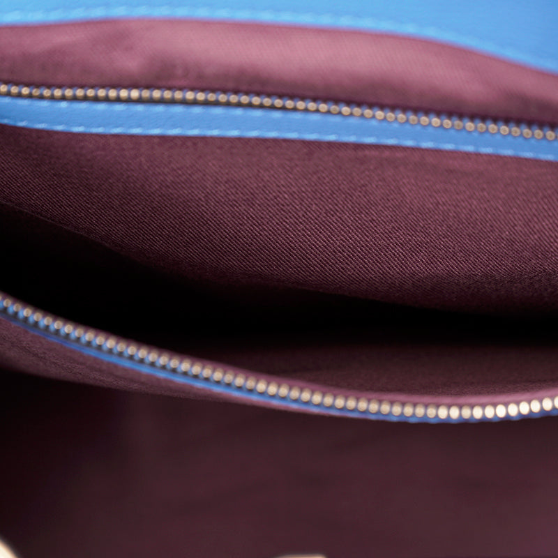 Authentic Versace bag in a pop of color. Blue grain leather is adorned with a chain-embellished accent and La Medusa plaque. Double top handles with additional leather ring can be fastened to the handles for extra security and ease of carry. Detachable/adjustable crossbody or shoulder strap. Insided is muted pink canvas lined with two zipped pockets and a lobster clasp hook for a structured silhouette. Leather feet. Style 1021611. Made in Italy. Perfect for the office, around town or a night out.