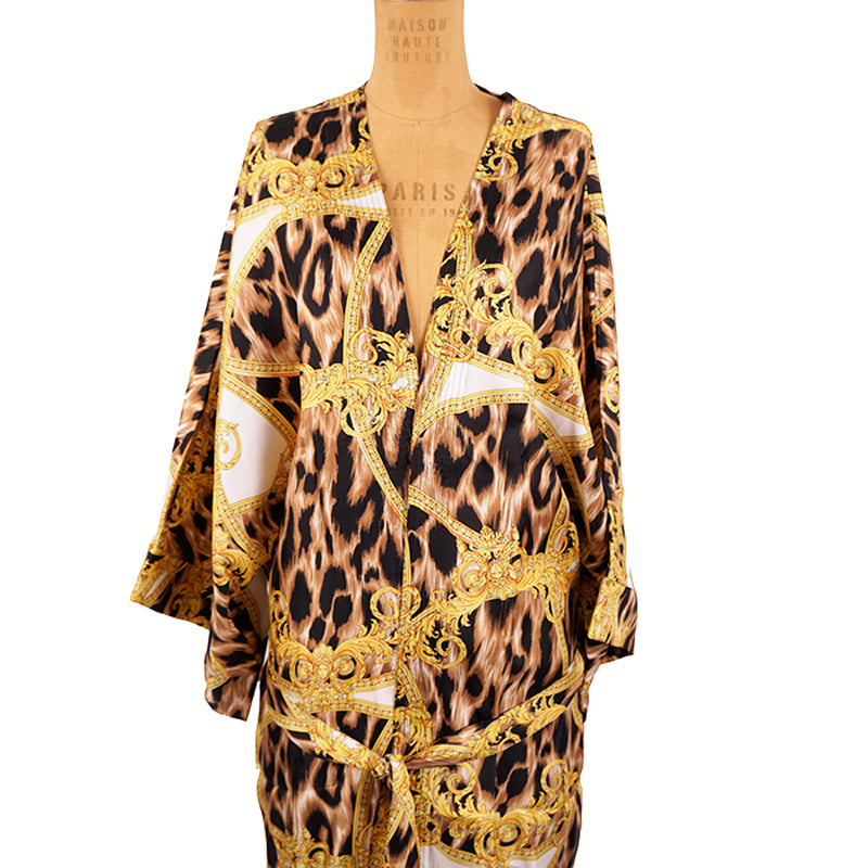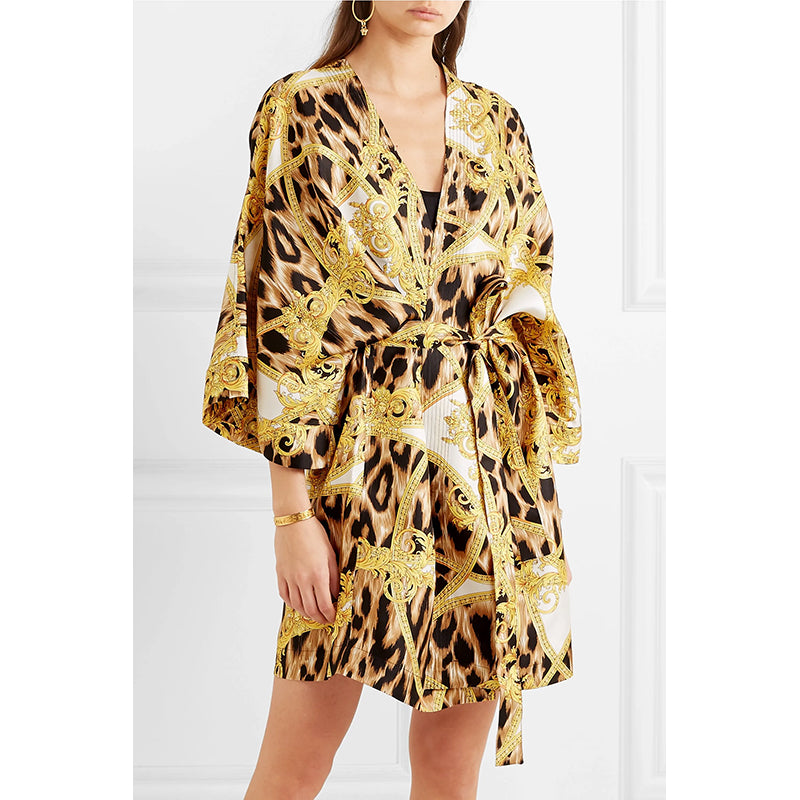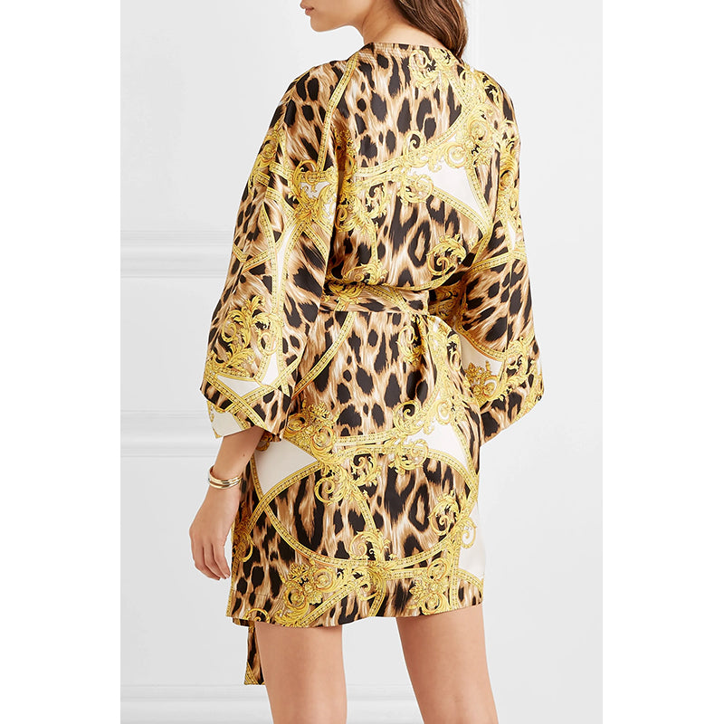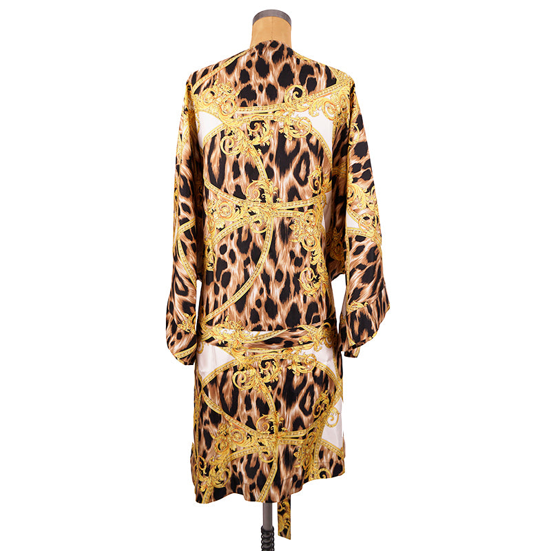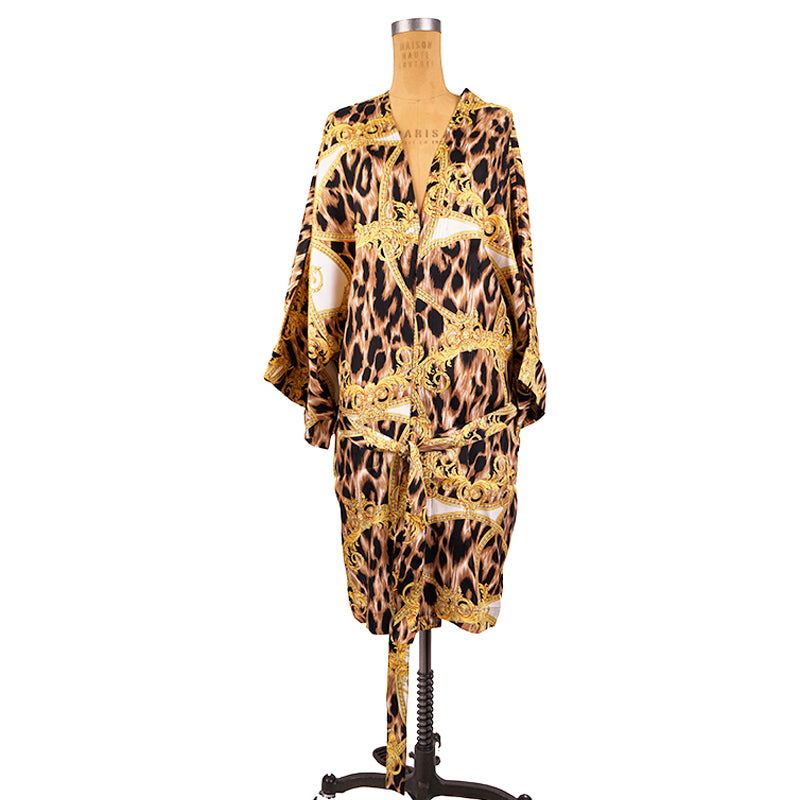 Authentic Versace dressing gown that has so many uses. Kimono style robe. Gold Barocco Animalier motif, combining leopard print and signature Baroque patterns. Wide cropped sleeves. Self-tie sash belt. Unlined. Style AUD05058. Made in Italy. Amazing from the print to the style. Use as a dressing gown, cover-up for the pool or just around the house.