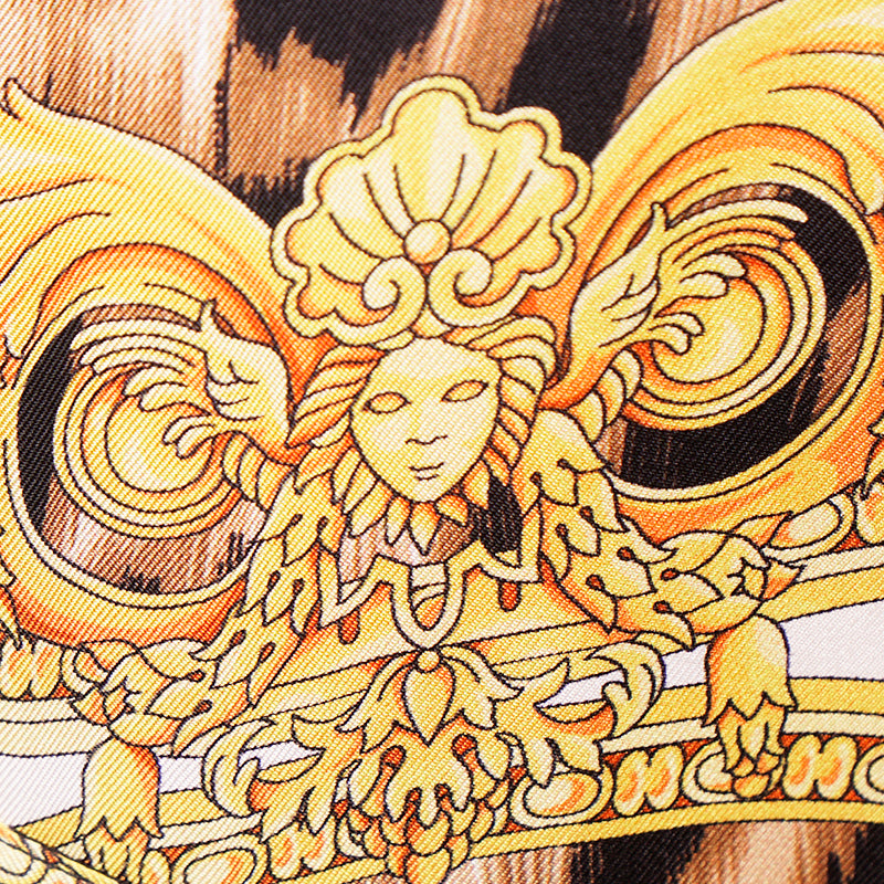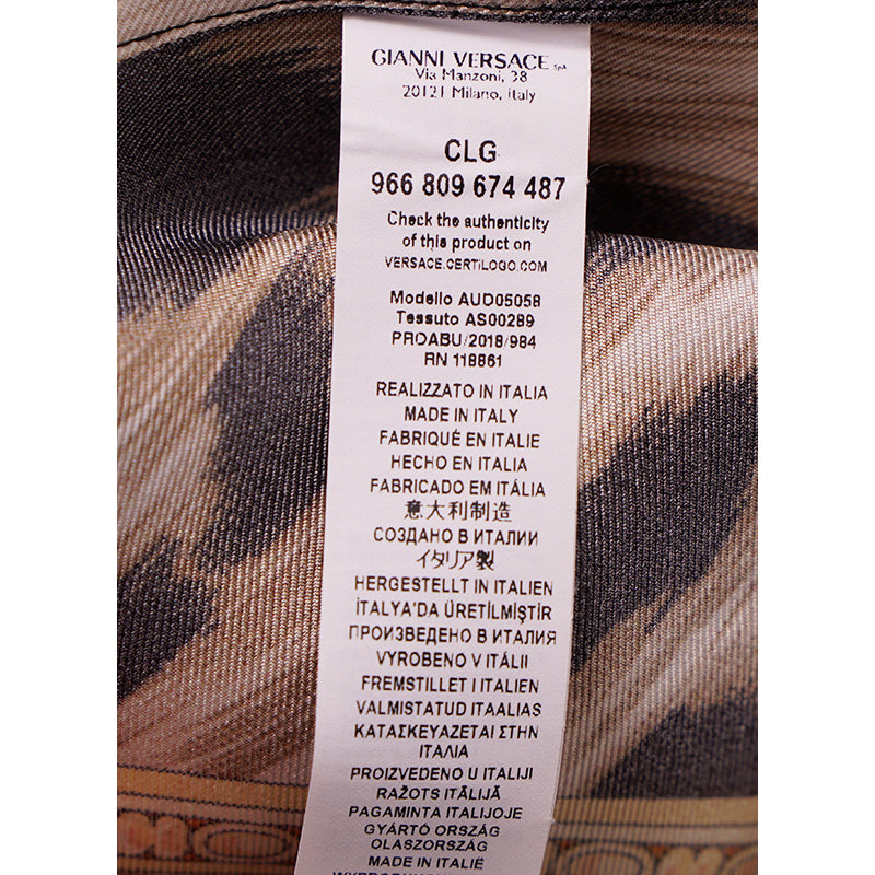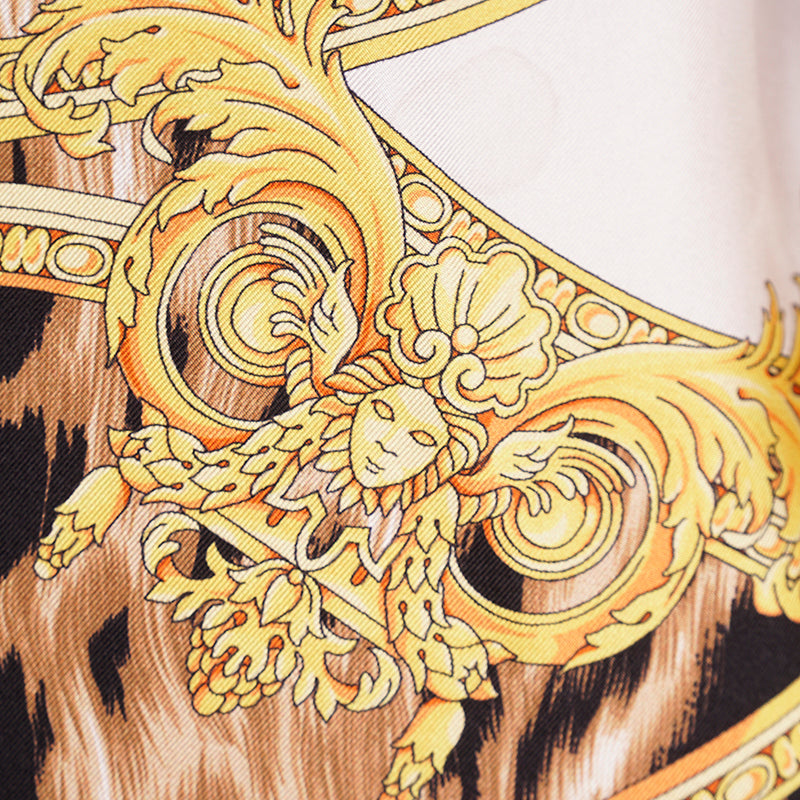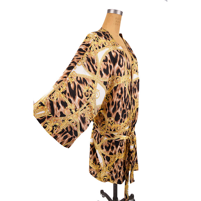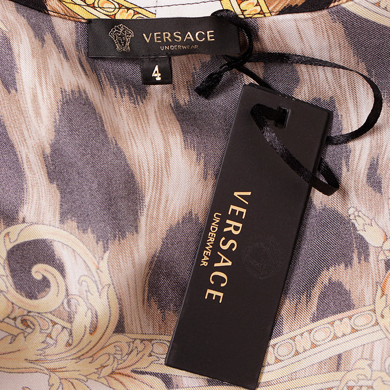 Authentic Versace dressing gown that has so many uses. Kimono style robe. Gold Barocco Animalier motif, combining leopard print and signature Baroque patterns. Wide cropped sleeves. Self-tie sash belt. Unlined. Style AUD05058. Made in Italy. Amazing from the print to the style. Use as a dressing gown, cover-up for the pool or just around the house.