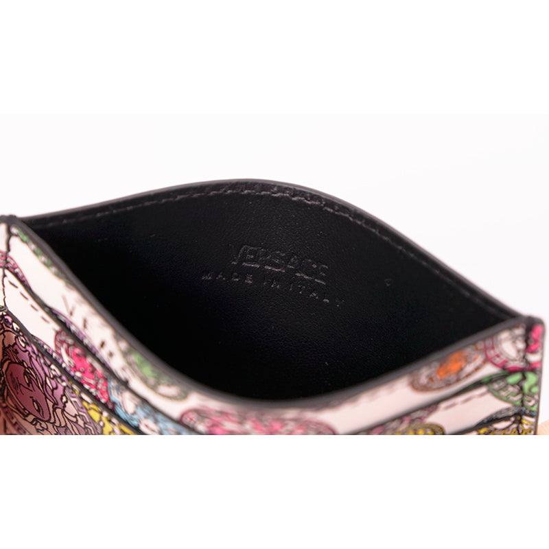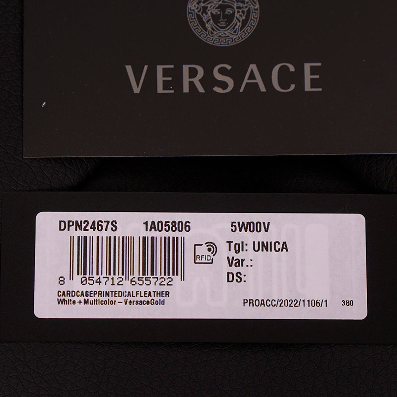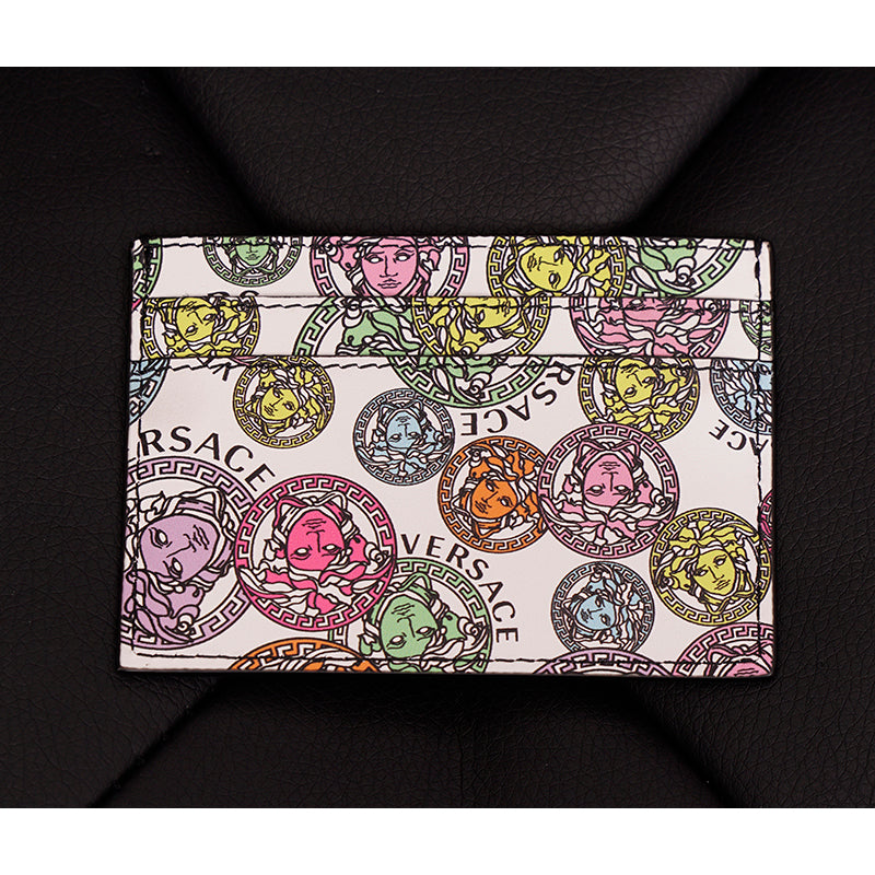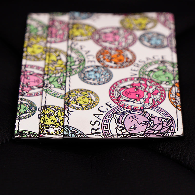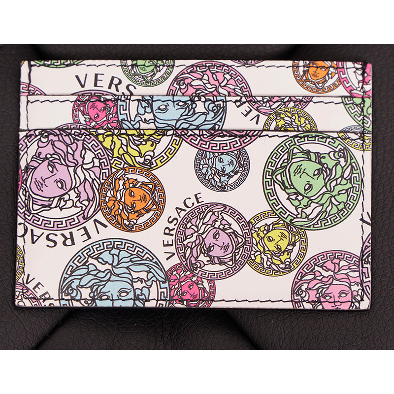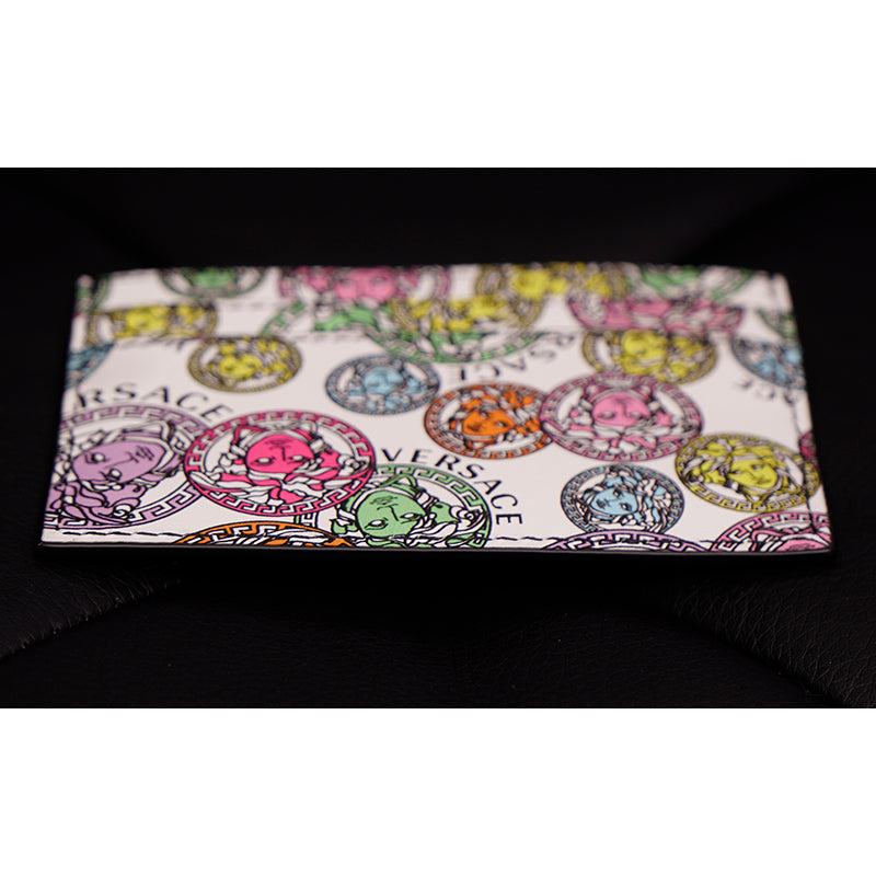 Authentic Versace card case wallet in a striking print. White leather has colorful multicolor Medusa Amplified limited edition print. Two card slots on the each side and slot in center. Style DPN2467S. Made in Italy. Stunning and sure to get noticed.