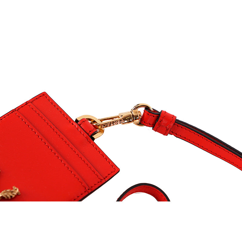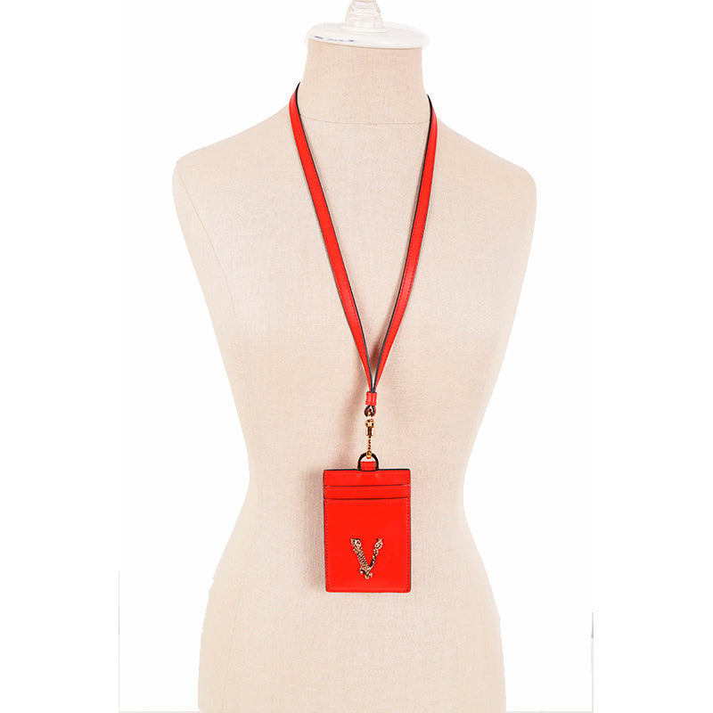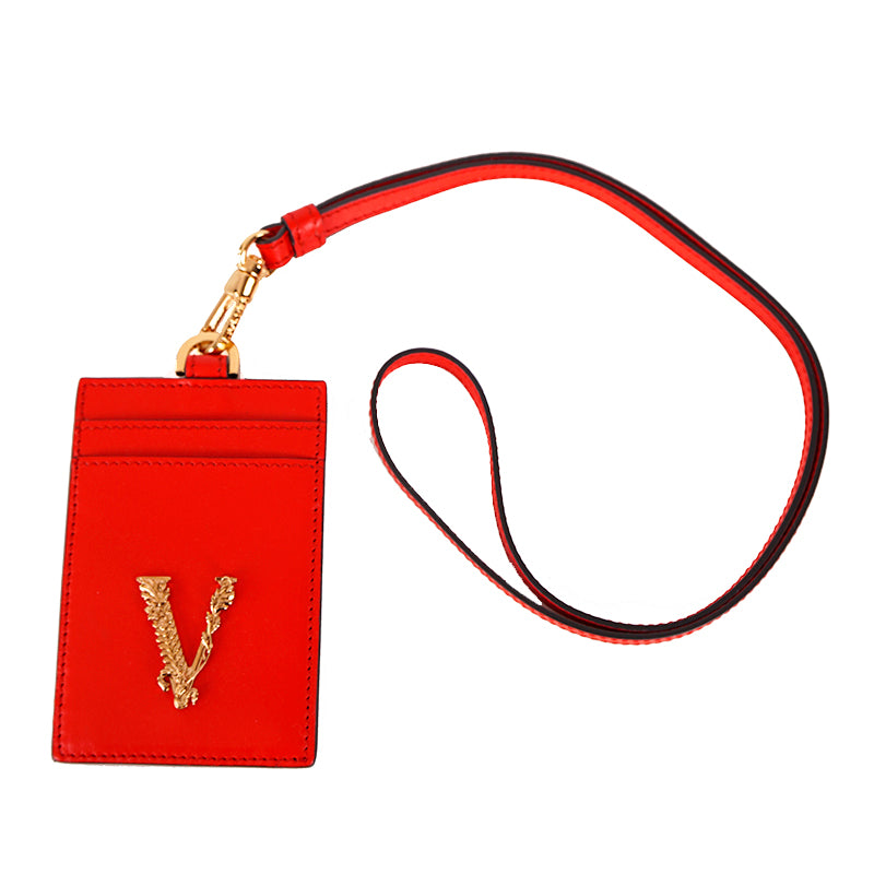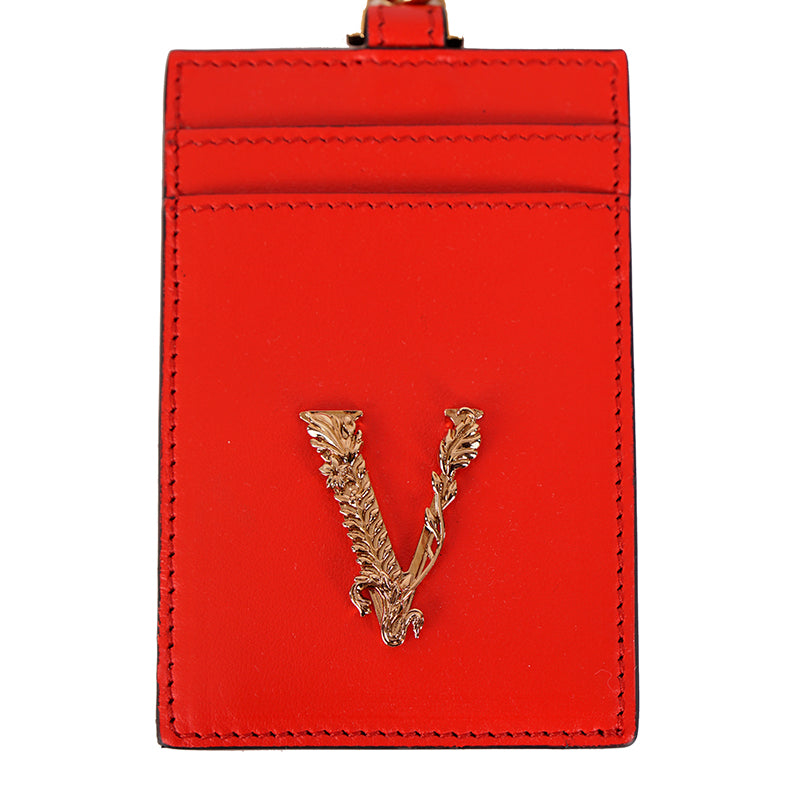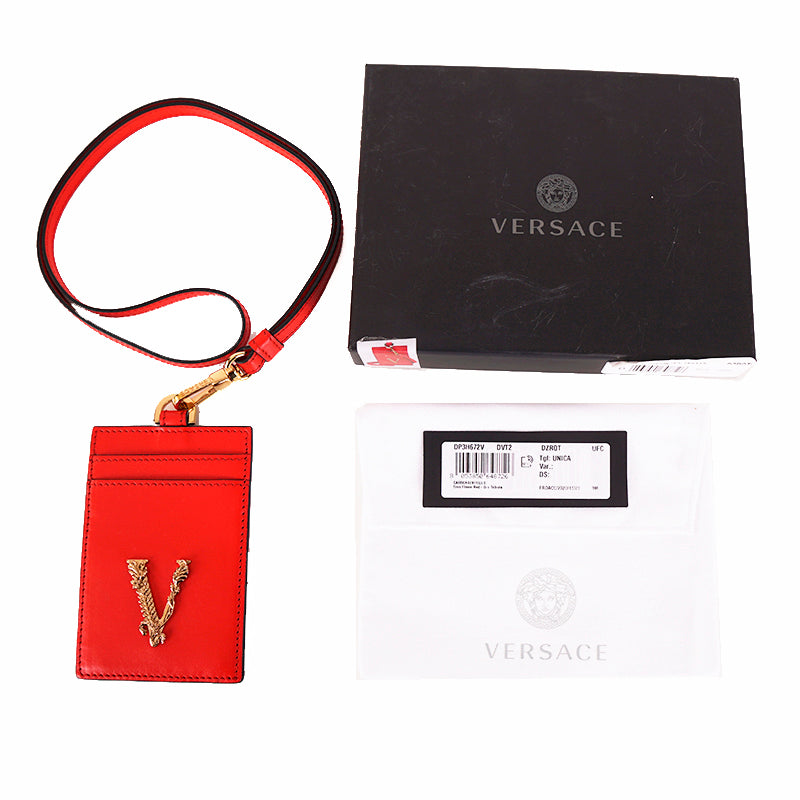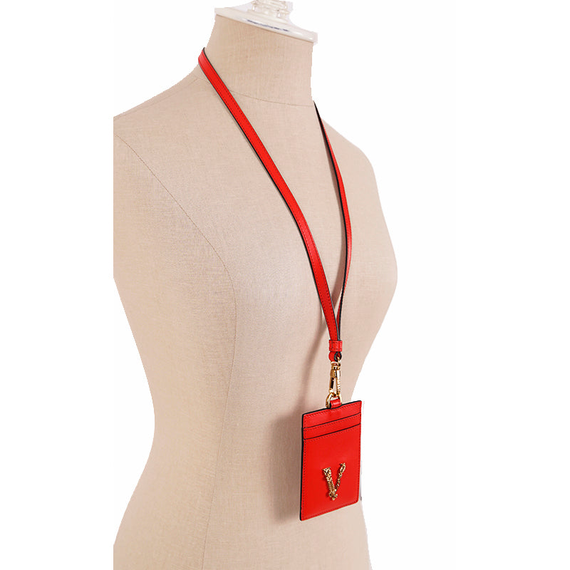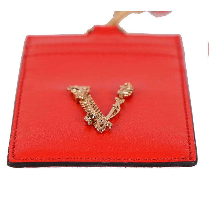 NEW $375 VERSACE Red Leather GOLD BAROCCO V LOGO VIRTUS Lanyard ID CARD CASE