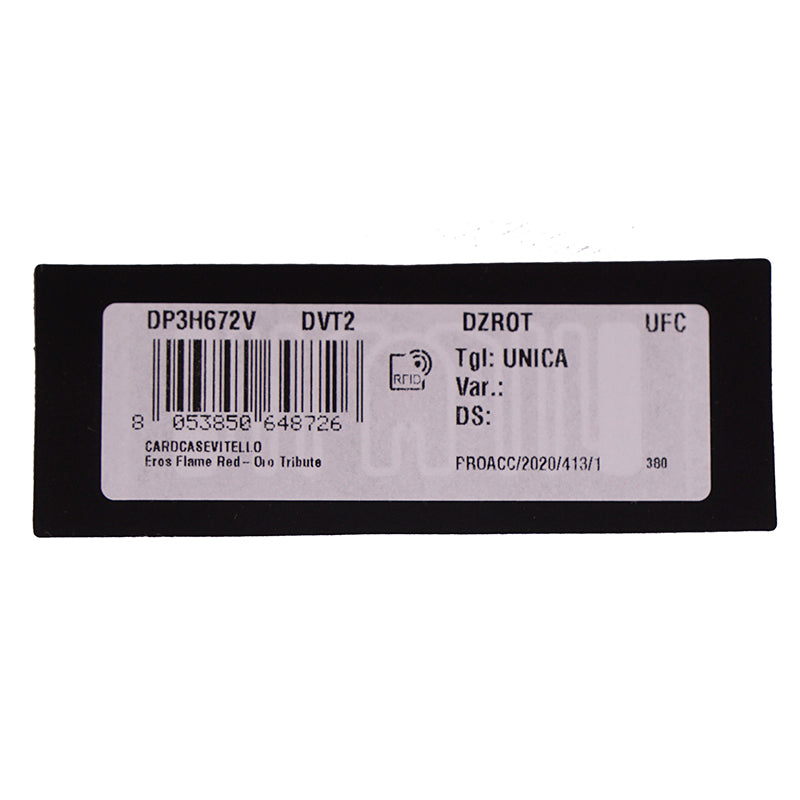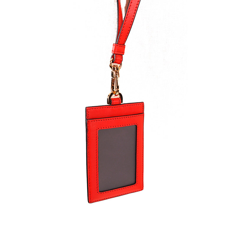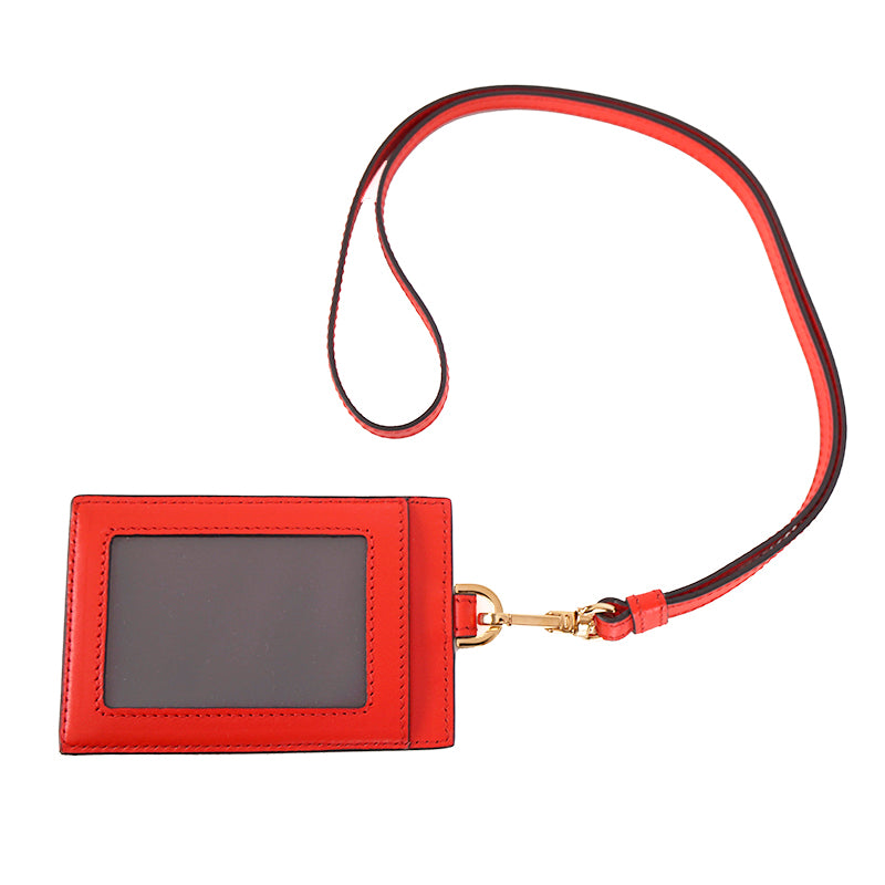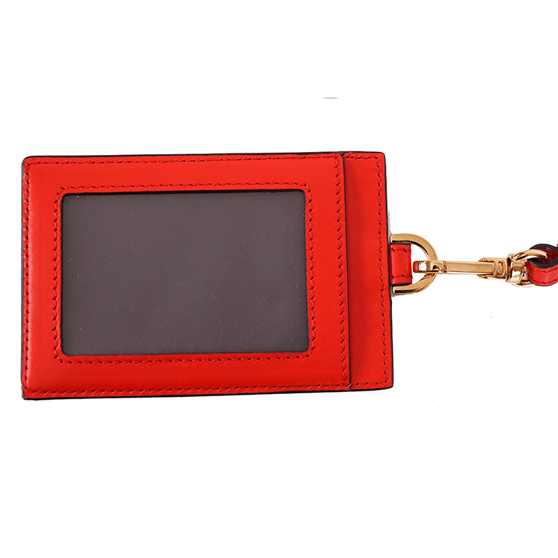 Authentic Versace lanyard card case in a super functional style. Stunning cherry red in all leather. Wear around your neck or in your handbag. Iconic Barocco V logo in front. Front has two card slots and back has badge compartment. Gold tone hardware. Style DP3H672V. Made in Italy. Perfect for on the go.