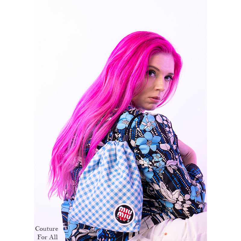 Authentic Miu Miu bag in a preppy fresh style. Blue check print pouch with red embroidered patch. Round Miu Miu Club logo patch. Metal logo plaque on other side. Black cord drawstring at throat with leather trim. Black lining. Gold-tone hardware. Style 5NG005. Made in Italy.