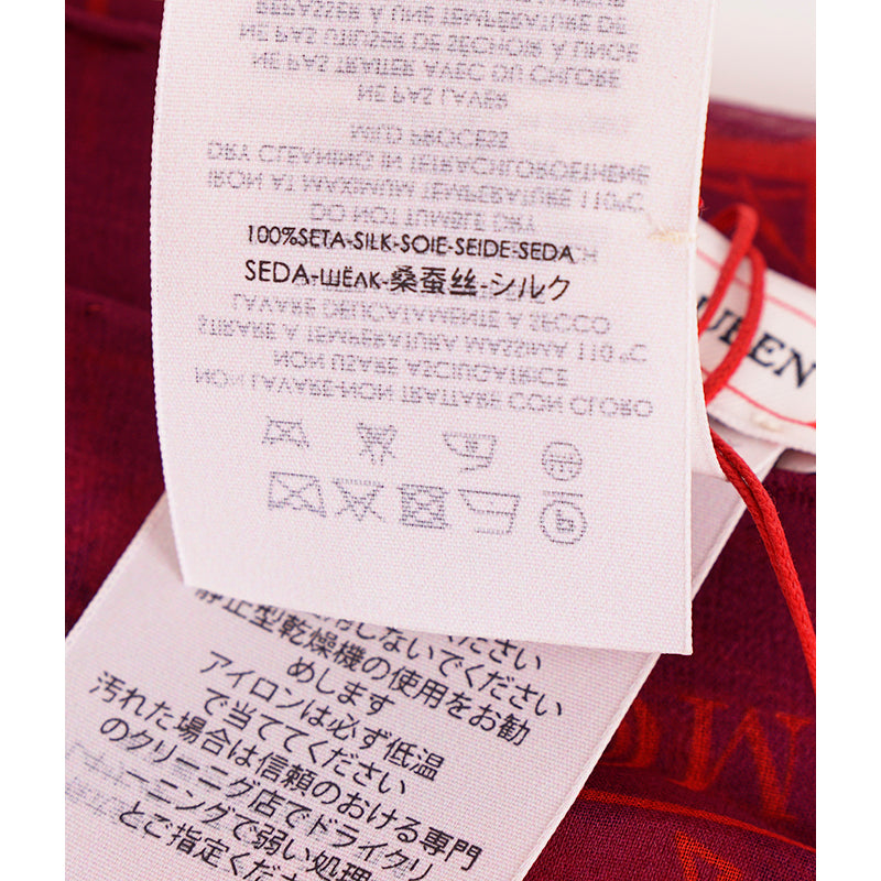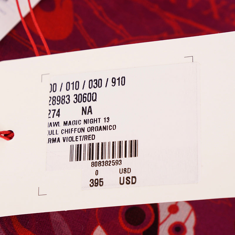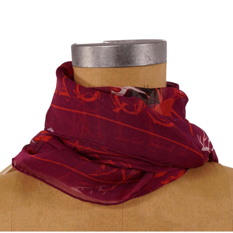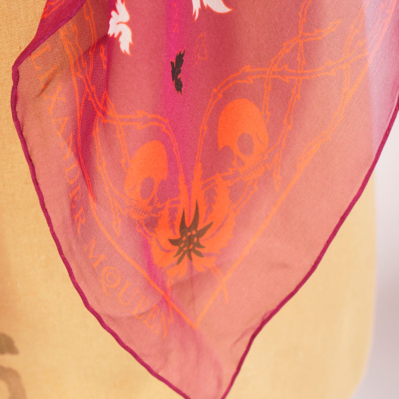 Authentic Alexander McQueen scarf in a stunning print. Dark red in a sheer chiffon silk with accents colors of orange, black and white. Print is called "Fantasy Nest" featuring skull fairies dancing amongst nature-inspired motifs. Rolled edges. 100% Silk. Made in Italy. Style 541341. Great oversize style can be worn several ways.
