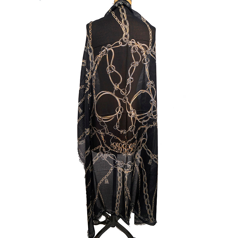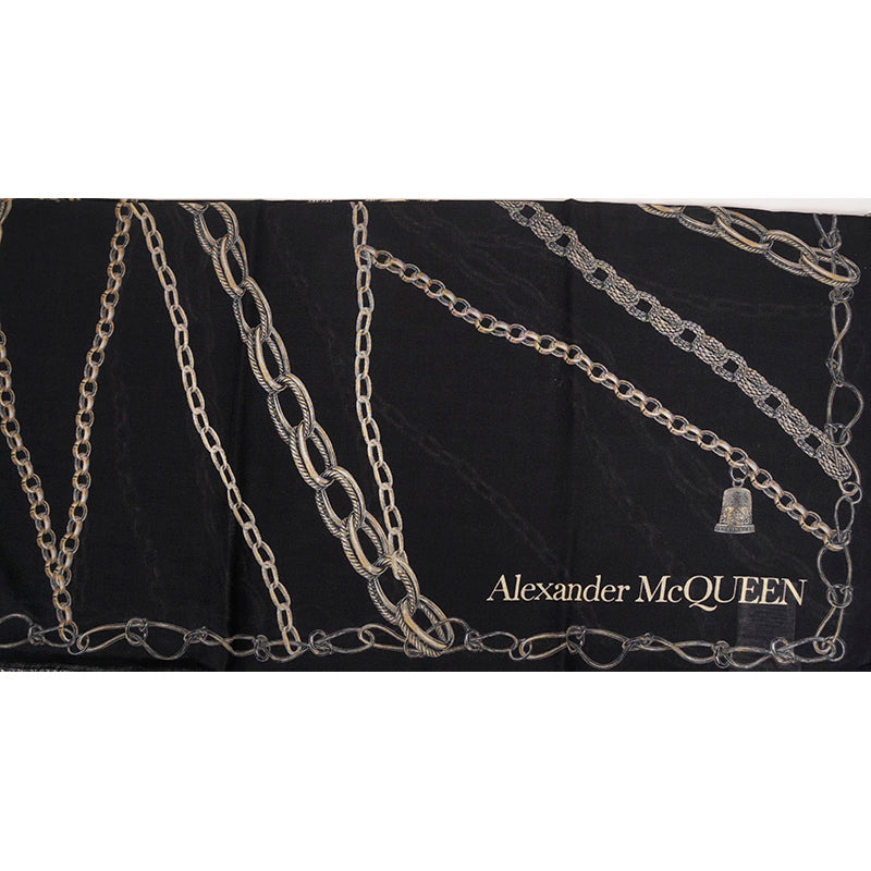 Authentic Alexander McQueen scarf in a stunning punk print. Black in a soft modal blend. Print is called "Skull of Chains" featuring multi-styled chains and barbed wire creating a large skull in the center. Black border. Frayed edges. 75% Modal, 25% Wool. Made in Italy. Style 620514. Great oversize style can be worn several ways.