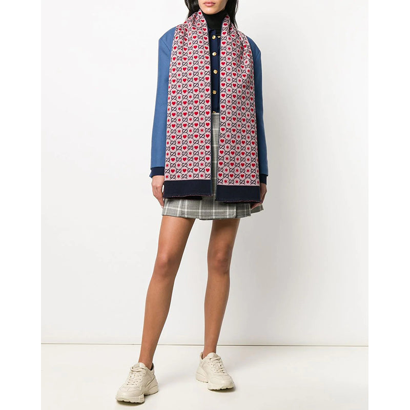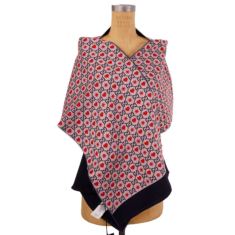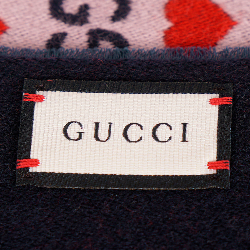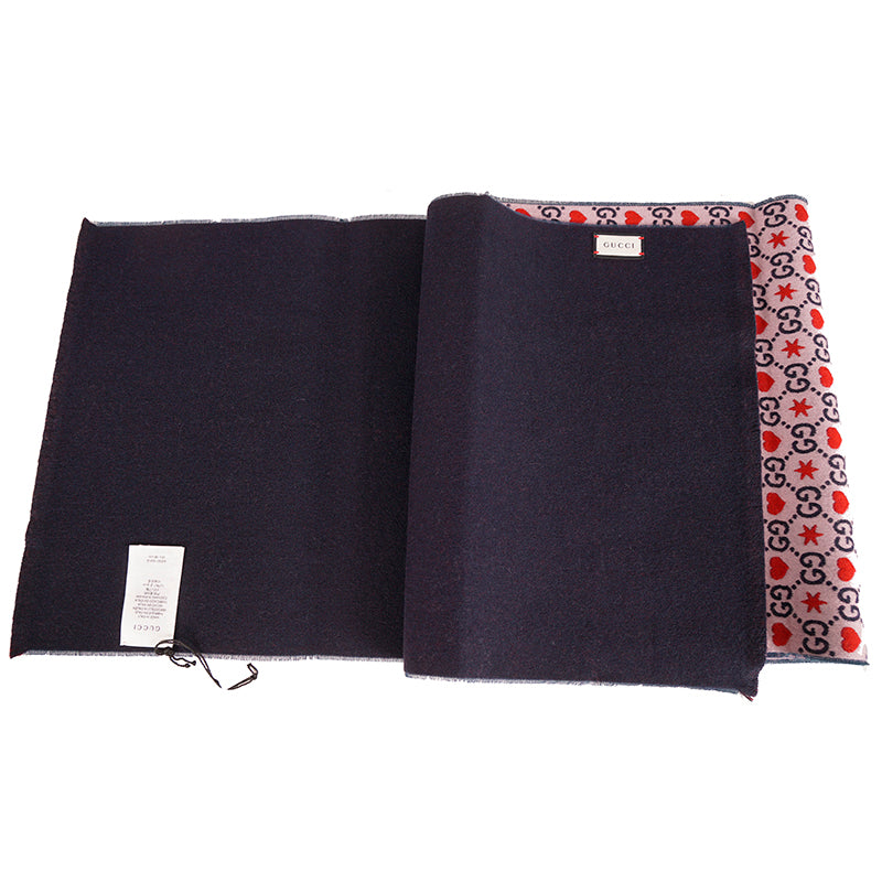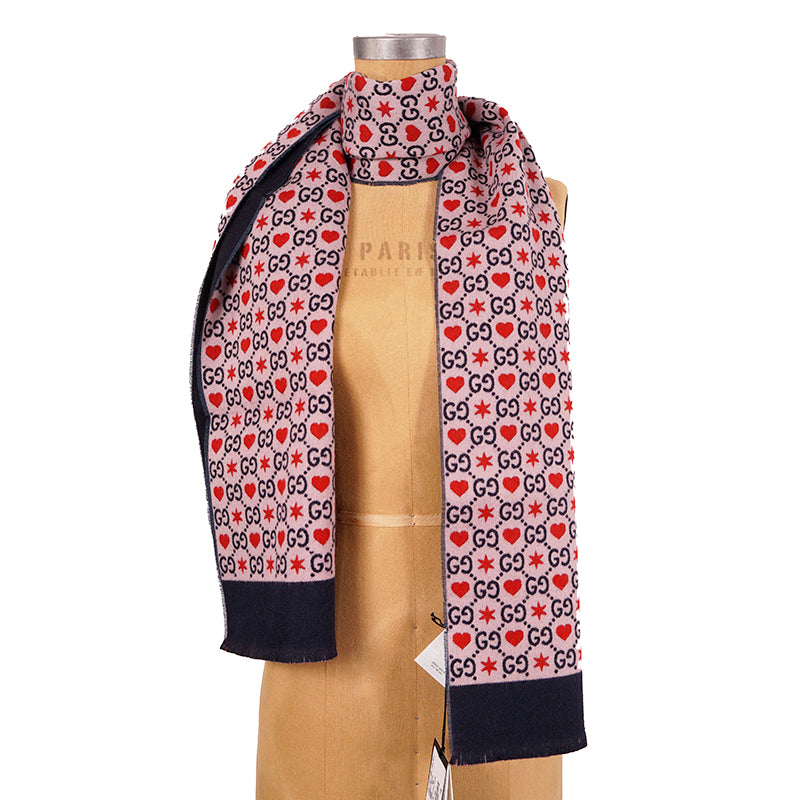 Authentic Gucci scarf in a stunning style. Pink with blue GG with red hearts and stars in a wallpaper print. Blue border with fringe ends. Reverse is solid blue. 91% wool, 9% cotton. Style 609327. Made in Italy. So pretty and cozy. Sure to get noticed.