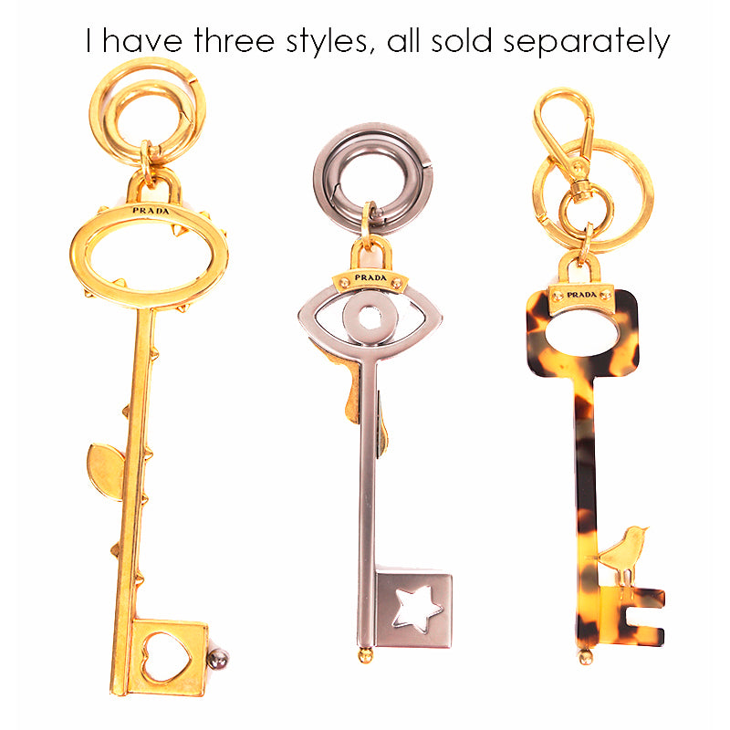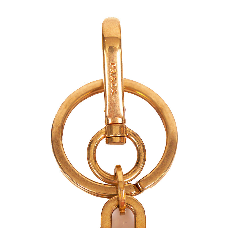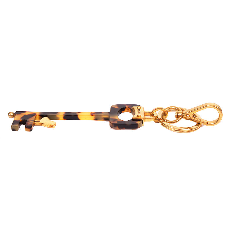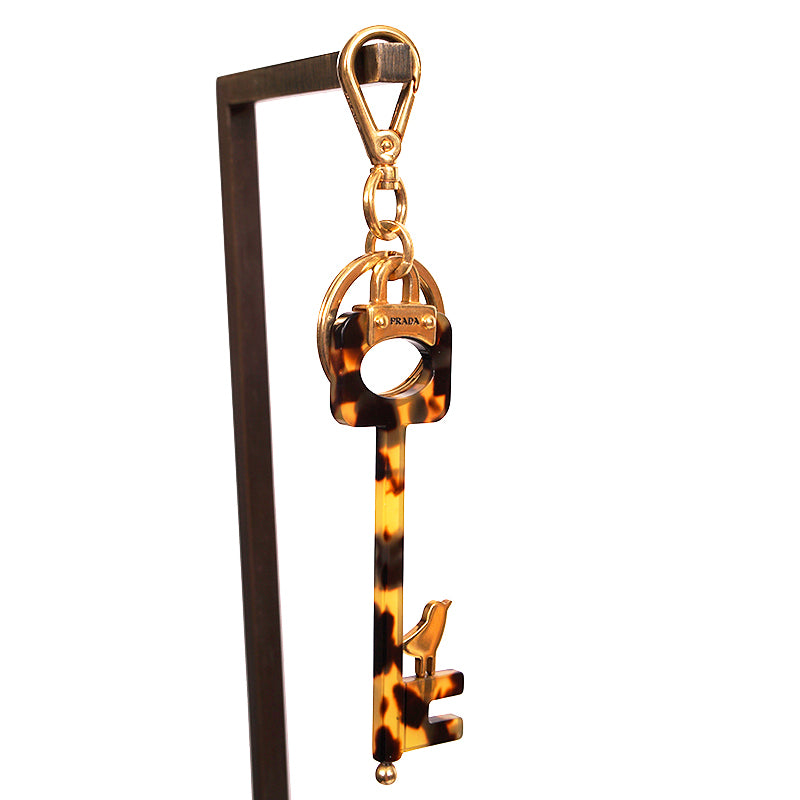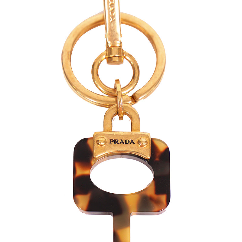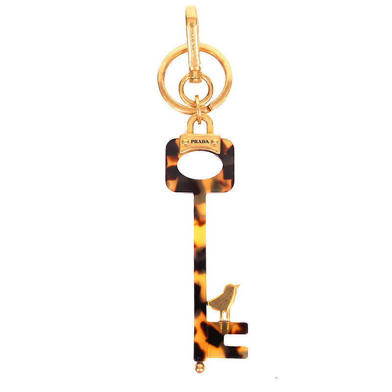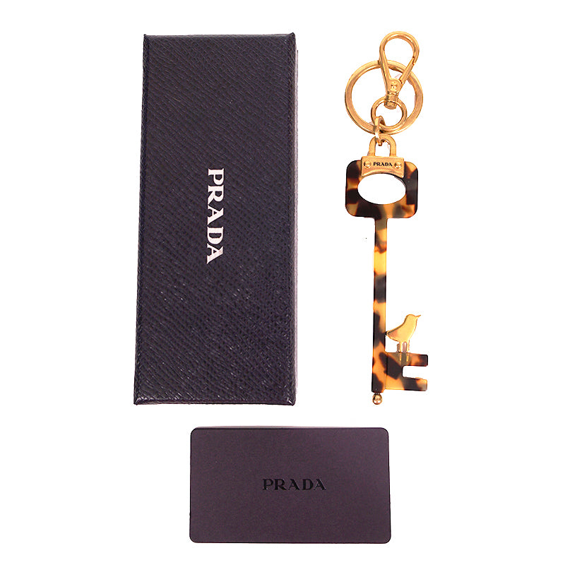 Authentic Prada keychain in a whimsy style. Faux Tortoise. with gold tone metal with aged finish. Little bird. Prada engraved at the top. Double ring clips. Style 1TT018. Made in Italy.Sure to get noticed. Seen on the runway clippped to belts, bags and necklaces.