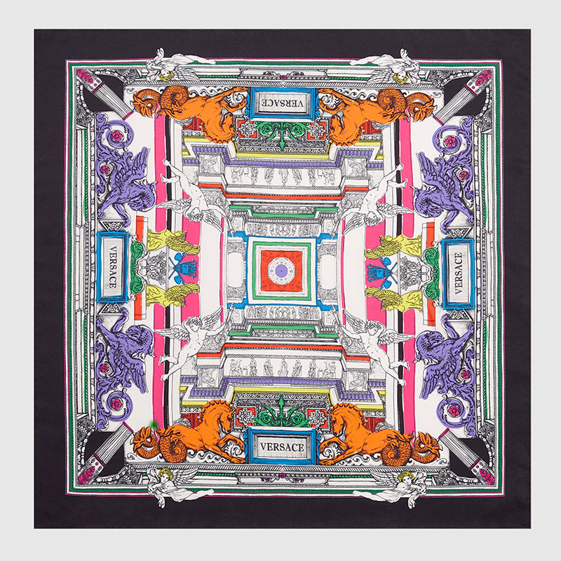 Authentic Versace scarf in a stunning print. Vivid and bright Il Tempio print with orange and purple horses and logos stylized under the painting on the ceilings of ancient Greek temples. Black wide border. Rolled edges. 100% Silk. Made in Italy. Style 1FO9001S. Great style can be worn several ways.