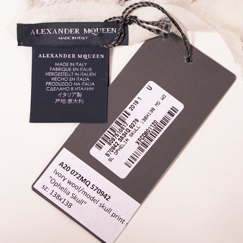 Authentic Alexander McQueen scarf in a captivating print. White and Grey in a soft Modal blend. Print is called "Ophelia Skull" featuring mandala-inspired medallion with white flowers and signature skulls. Frayed edges. 75% Modal, 25% Wool . Made in Italy. Style 570942. Great oversize style can be worn several ways.