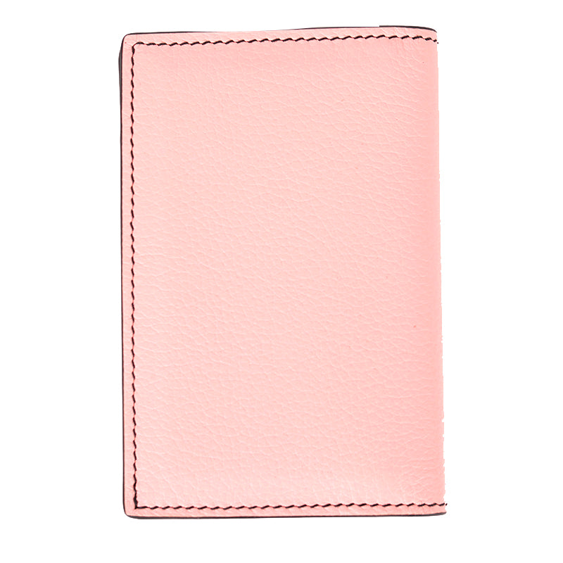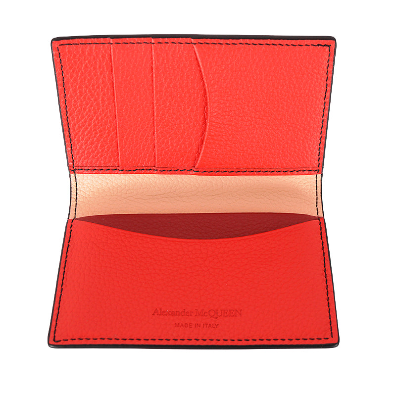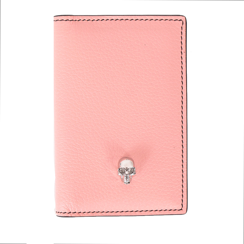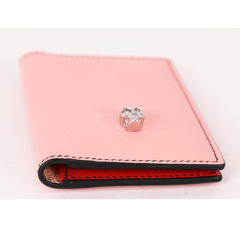 Authentic Alexander McQueen card case in a pretty color. Pink outer with nude and red inside. Grain leather. Decorated with a single silver tone skull with crystal eyes. Folded cardholder wallet with multiple card slots and slip pocket. Style 554195. Made in Italy.