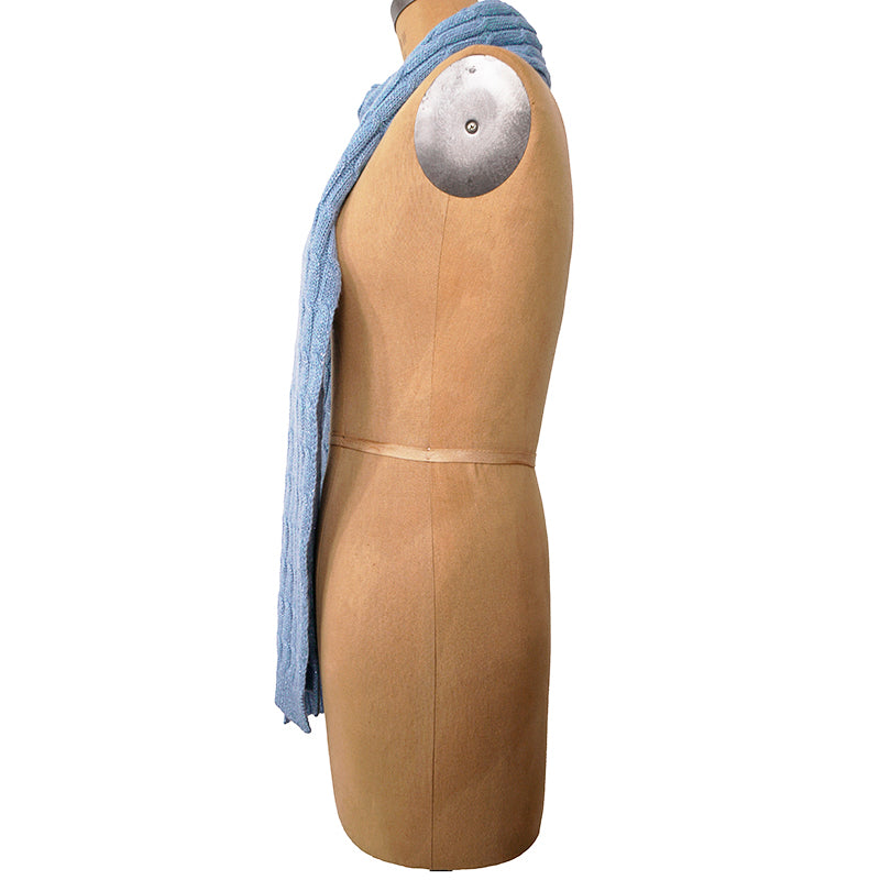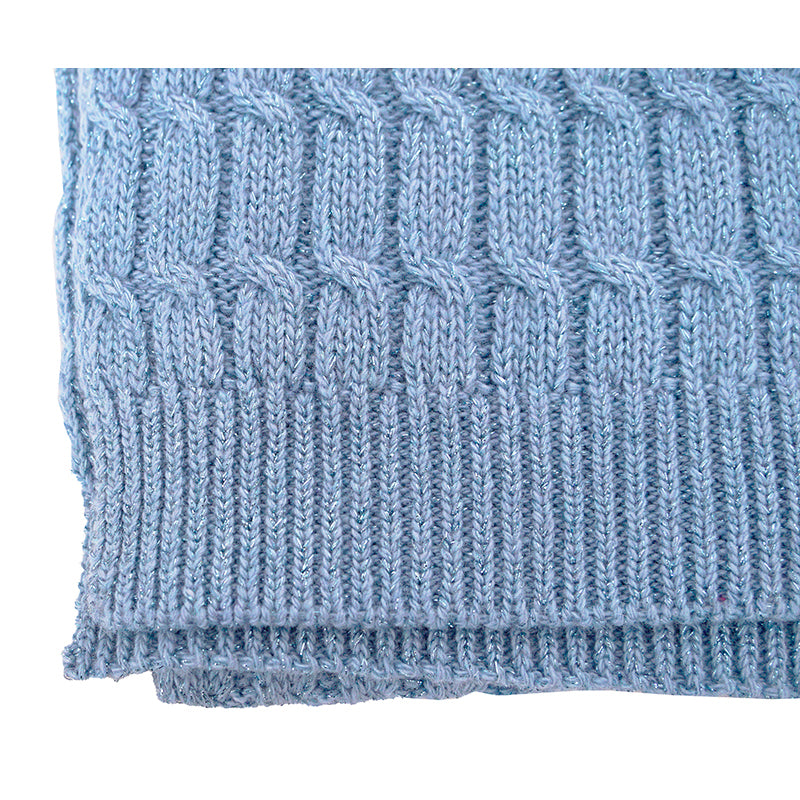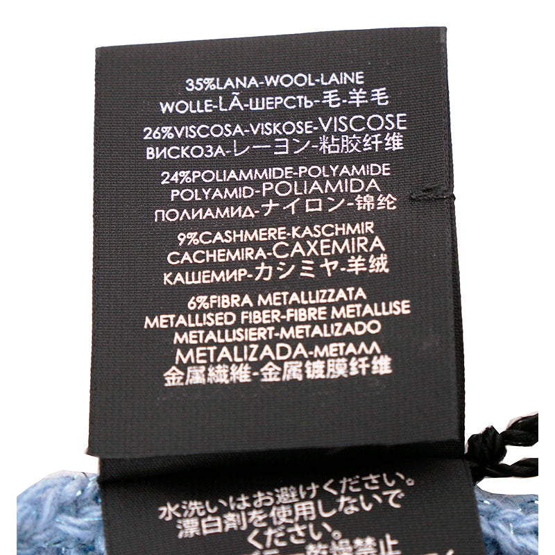 Authentic Gucci scarf in soft baby blue knit. Features a cable-weave design with subtle metallic thread woven throughout for a refined shimmer. Crafted from a luxurious blend of wool, viscose, polyamide, and cashmere with a hint of metallized fiber for a lightweight yet warm finish. Made in Italy. A timeless, elegant accessory that adds a touch of understated sophistication to any look.