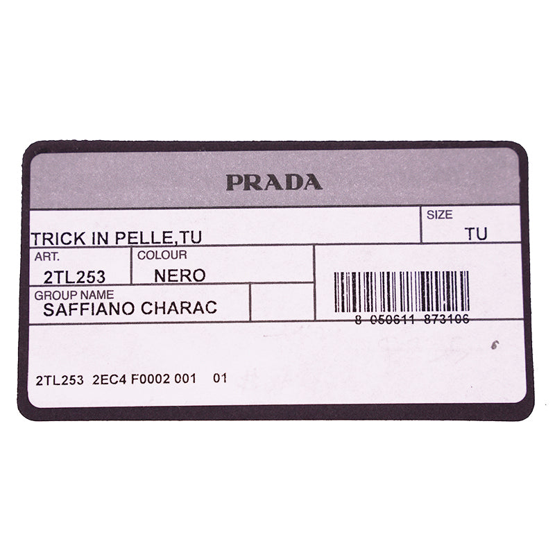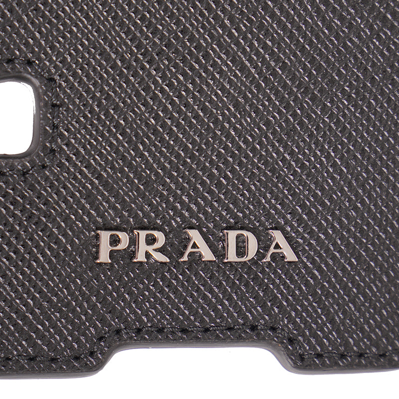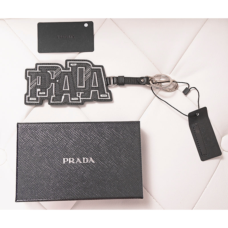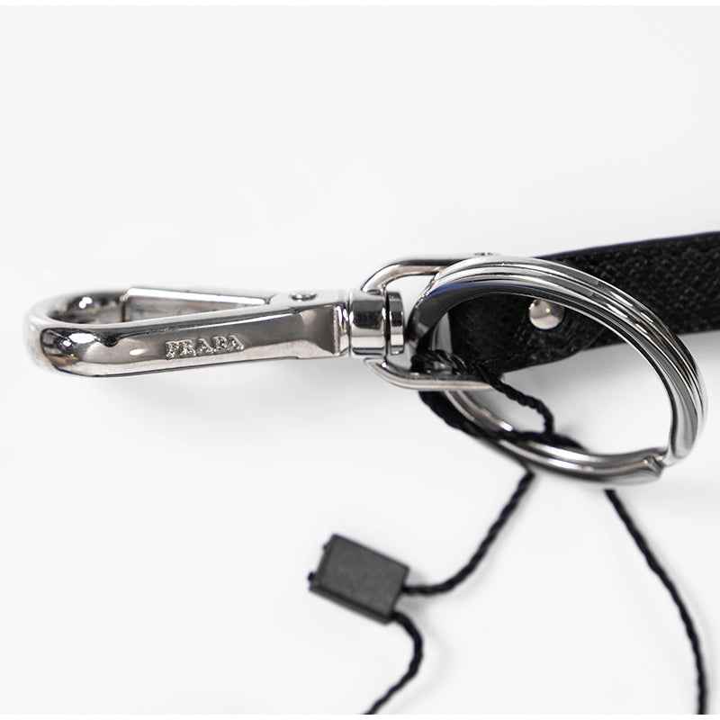 Authentic Prada keyring in a preppy style. Saffiano leather in black and gray. Prada letters logo. Back is all black with silver raised Prada logo. Silver tone hardware. Lobster clasp. Style 2TL253. Made in Italy. Great little trick for tote or gym bag.