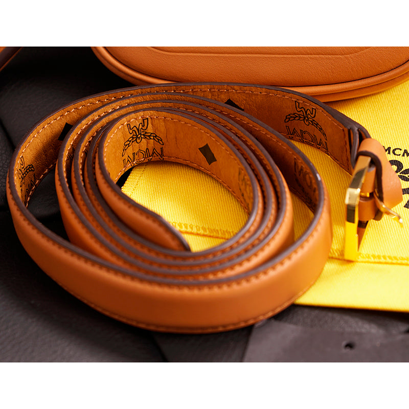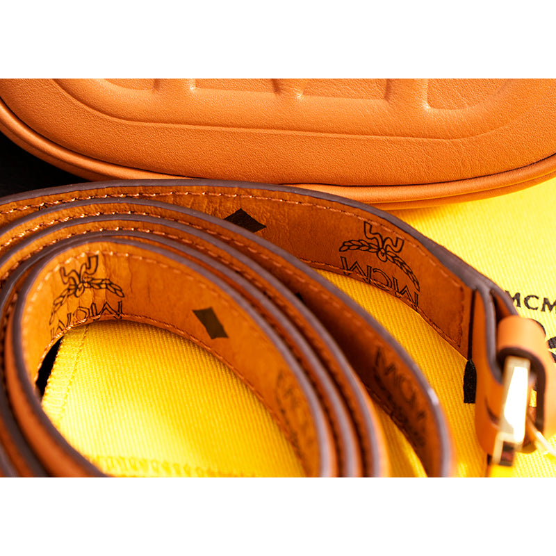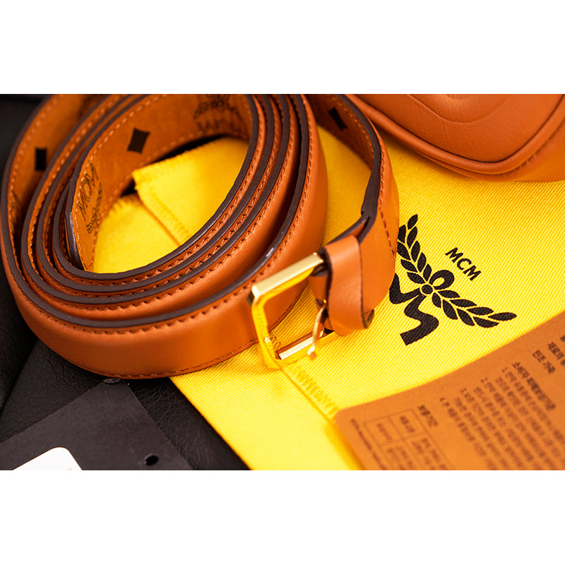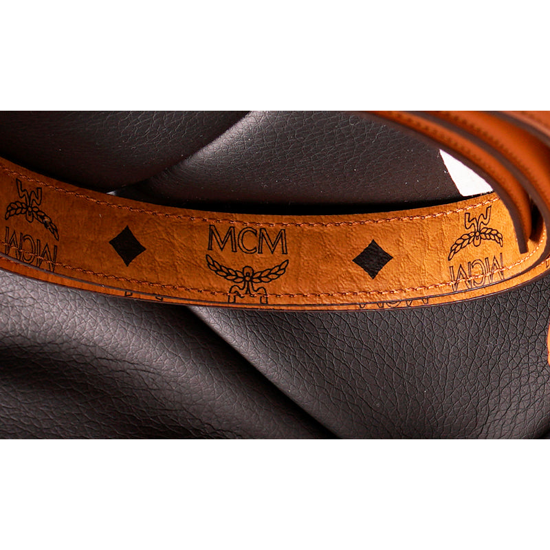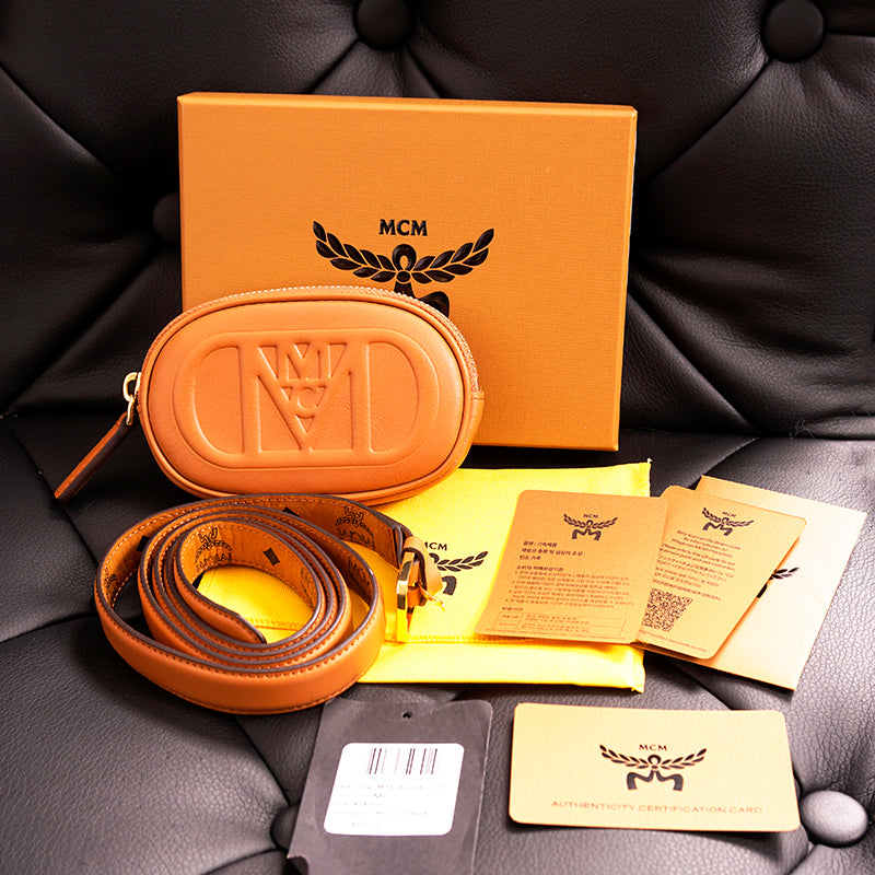Authentic MCM pouch and belt combo set. Embossed with the sculptural Mode Travia MCM logo, a detachable nappa leather zip pouch accompanies this artisan-crafted belt. Cognac brown full-grain nappa leather the front of the belt, while the underside is signature Visetos monogram canvas. 24k gold-plated metal buckle hardware. Made in South Korea. Style DALD04.