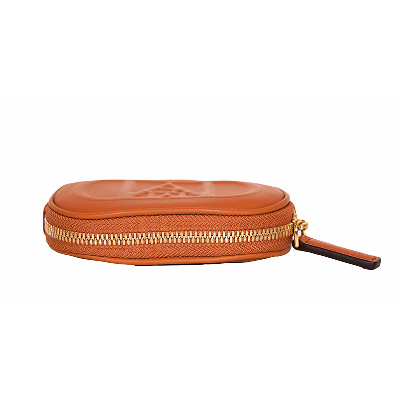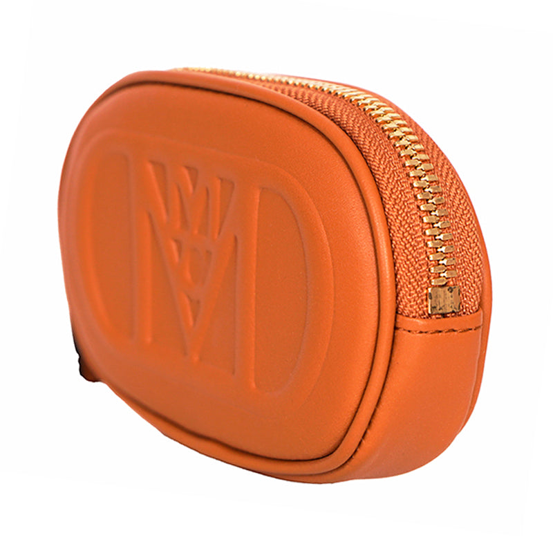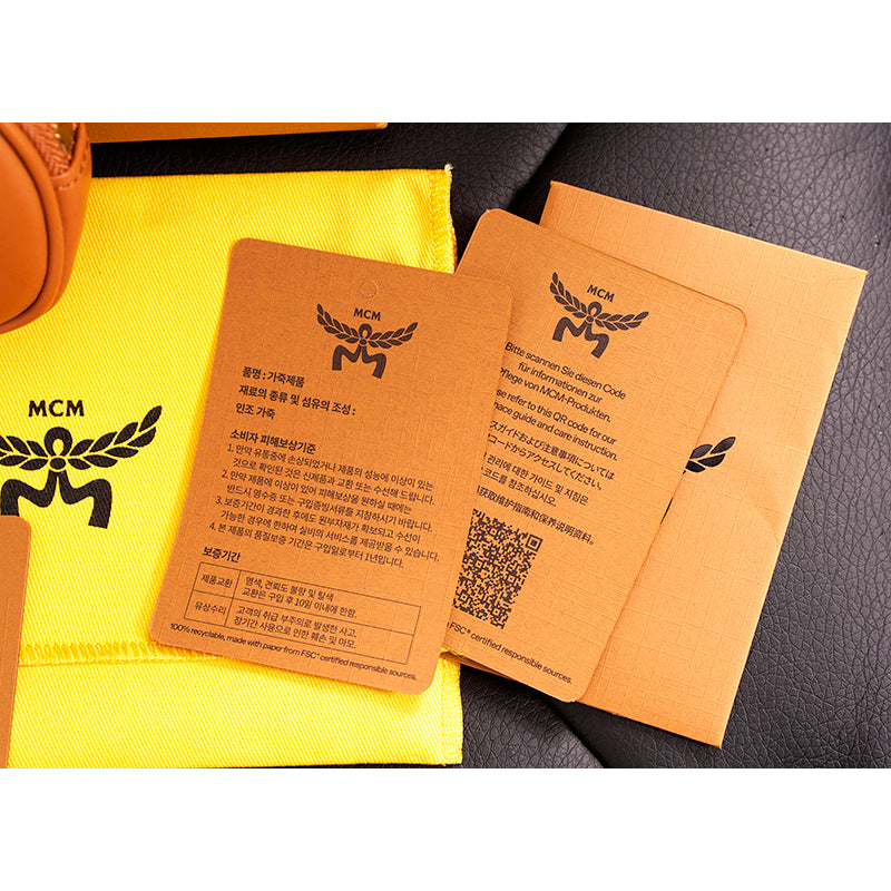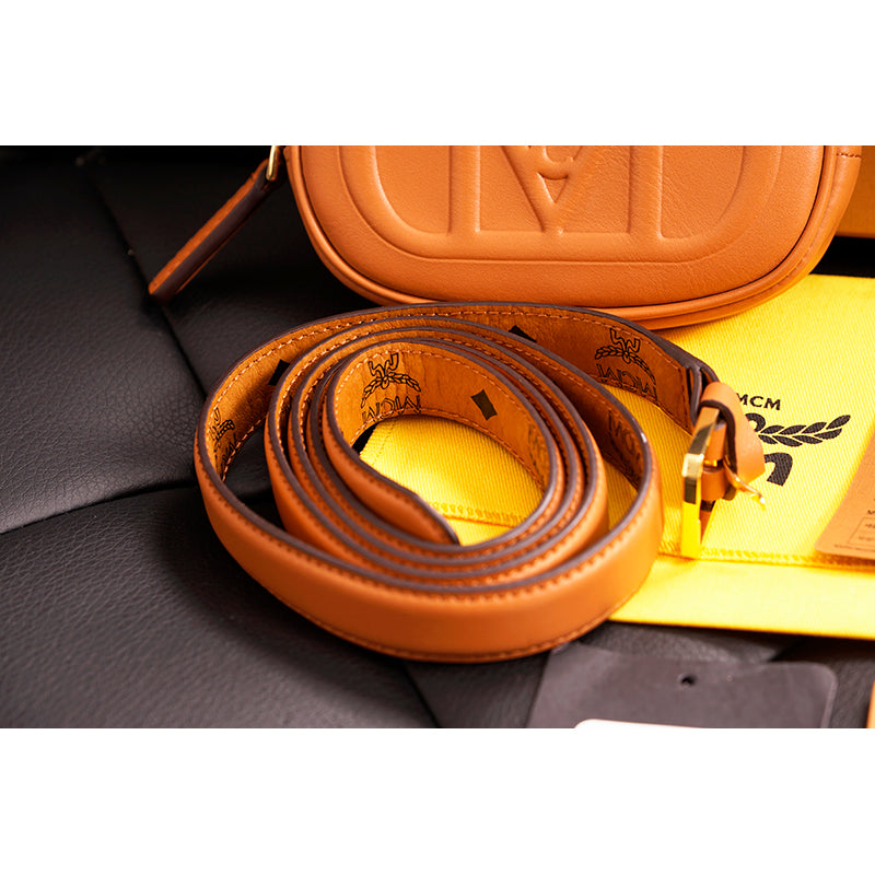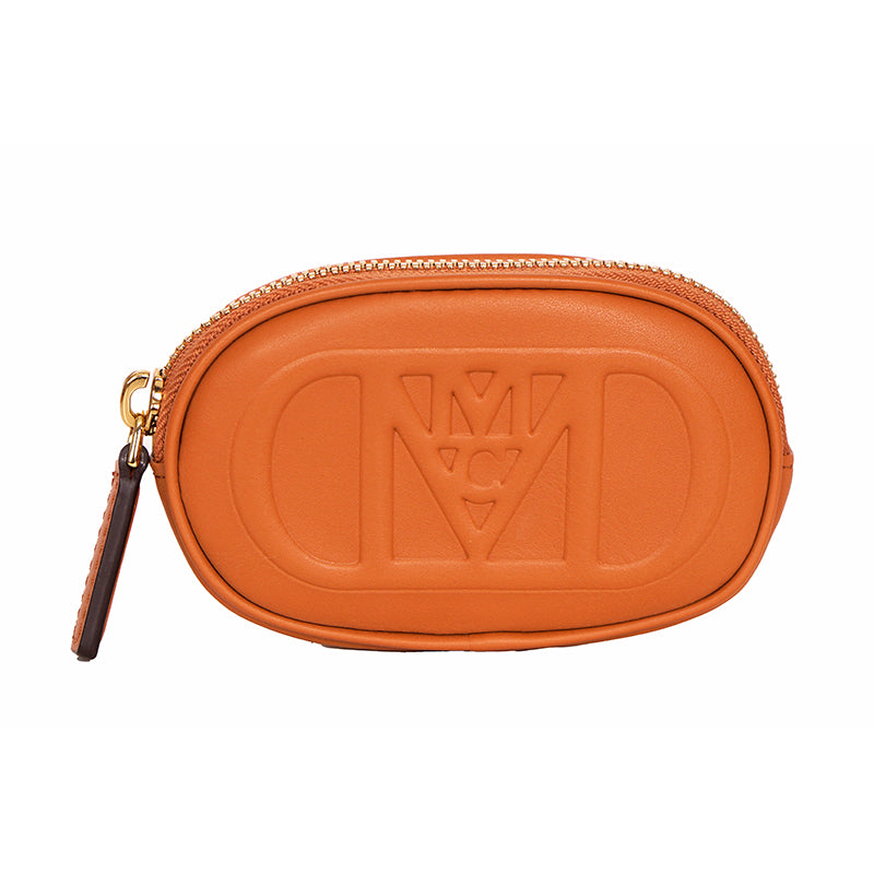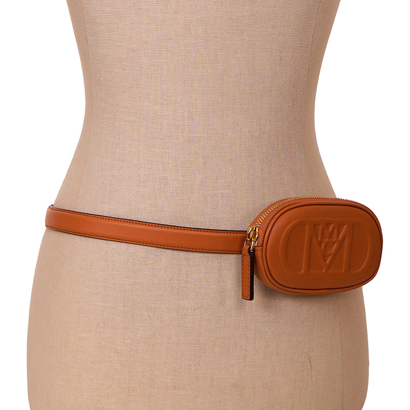 Authentic MCM pouch and belt combo set. Embossed with the sculptural Mode Travia MCM logo, a detachable nappa leather zip pouch accompanies this artisan-crafted belt. Cognac brown full-grain nappa leather the front of the belt, while the underside is signature Visetos monogram canvas. 24k gold-plated metal buckle hardware. Made in South Korea. Style DALD04.