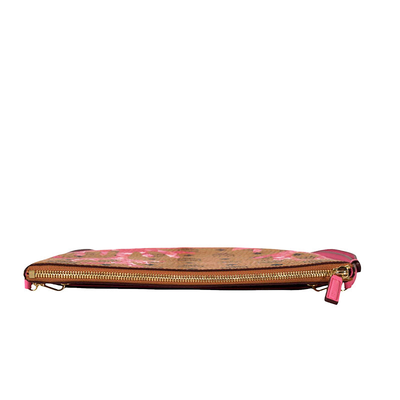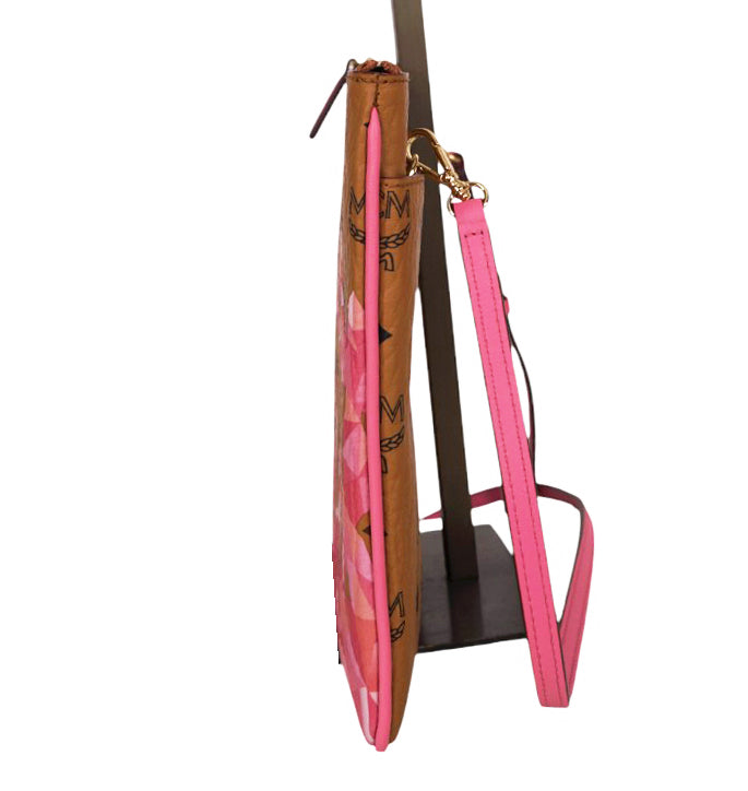Authentic MCM Aren Crossbody Pouch from the "Under the Sea" collection, this print is named Coral Mountain.. Vivid pink Cubic Coral graphic over the signature Visetos monogram canvas. Trimmed in natural nappa leather in a pretty pink. 18k gold-plated hardware. Slim silhouette with zip closure, rear exterior pocket with hidden snap, and interior zip compartment. Lined in cotton twill. Detachable, adjustable crossbody strap for versatile wear. Made in South Korea. A standout piece, perfect for adding a bold, artistic edge to everyday or travel looks.
