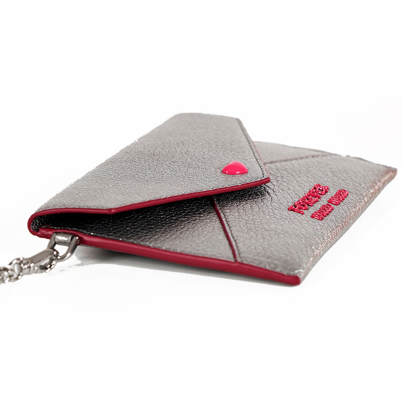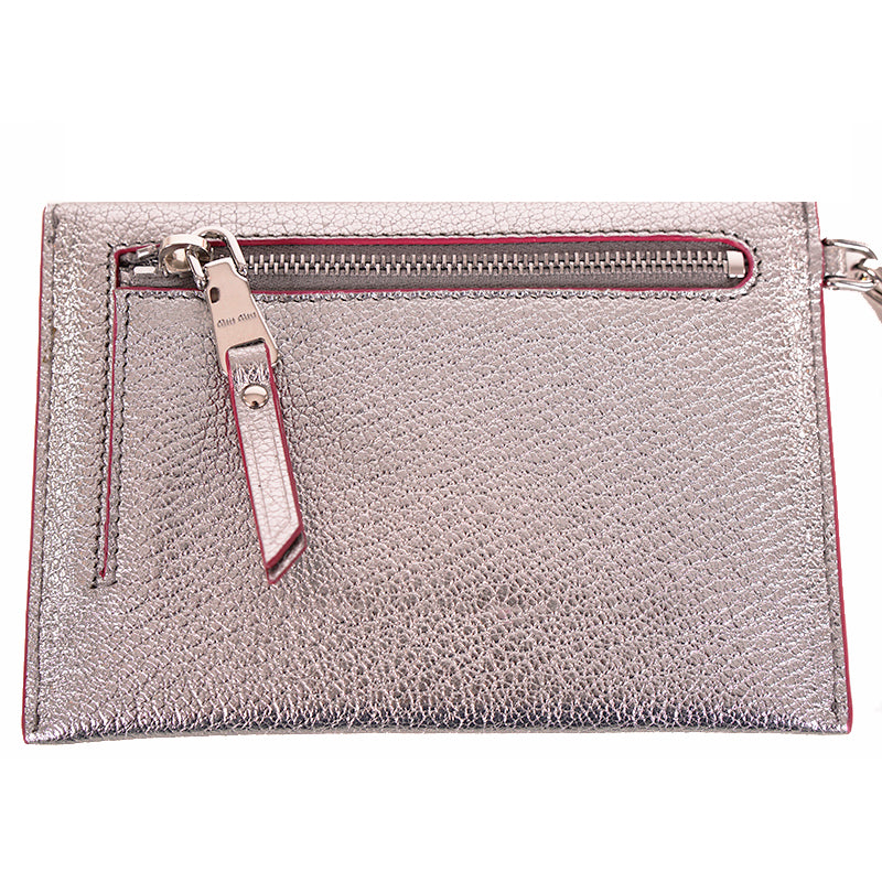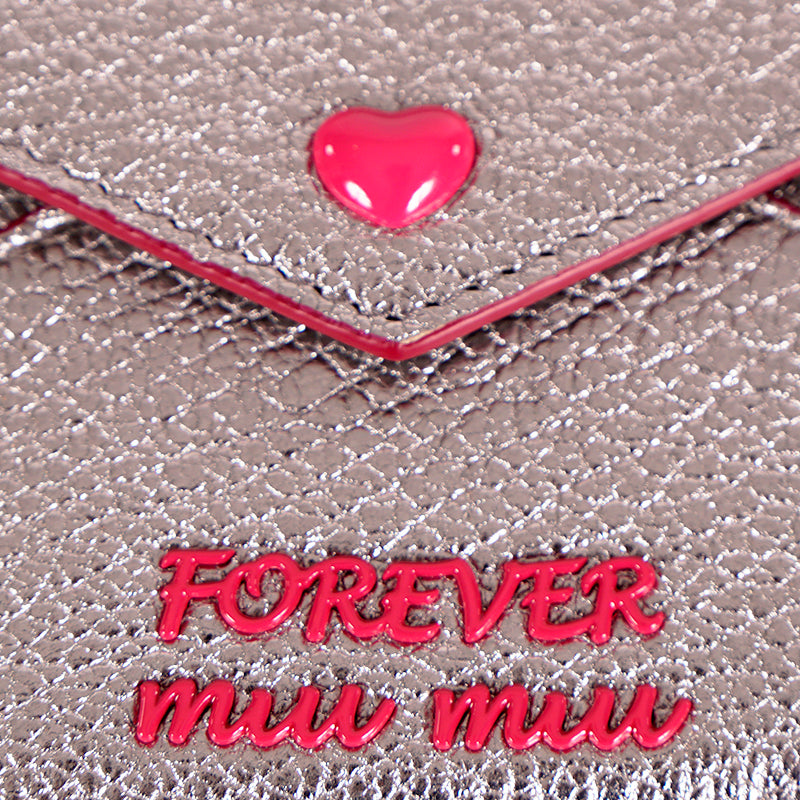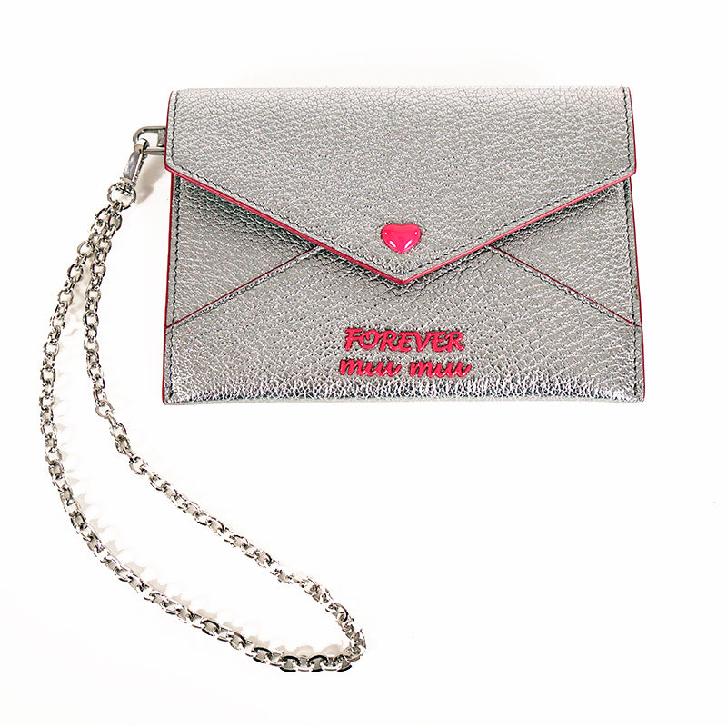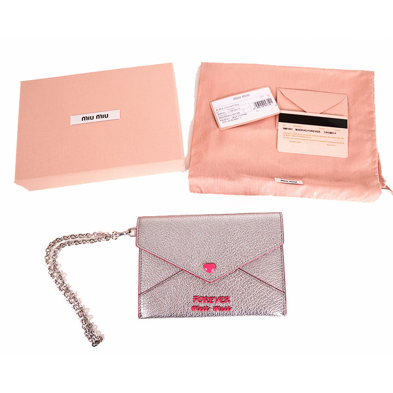 Authentic Miu Miu wallet in a whimsy and fresh style. Silver pebble leather called Cromo. Pink little heart with Forever Miu Miu logo in front. Detachable silver chain can be used as a clutch or wristlet. Silver tone hardware. Snap closure. Inside has 3 card slots. Exterior zipper coin pouch. Style 5MF001. Made in Italy. Has the look of a little love letter. Great for a night out.