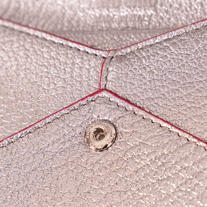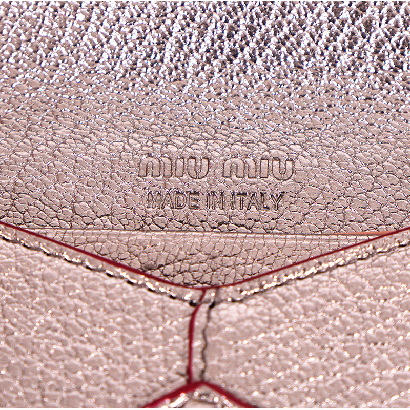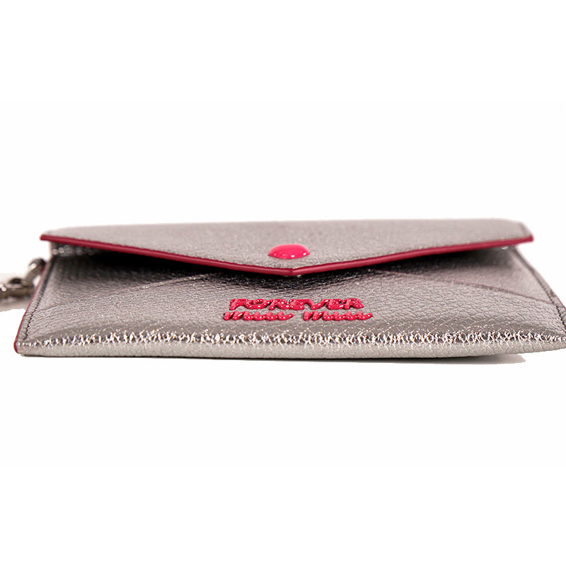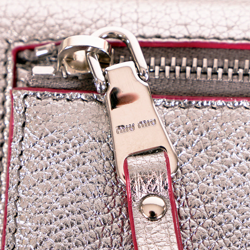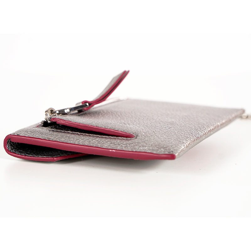 Authentic Miu Miu wallet in a whimsy and fresh style. Silver pebble leather called Cromo. Pink little heart with Forever Miu Miu logo in front. Detachable silver chain can be used as a clutch or wristlet. Silver tone hardware. Snap closure. Inside has 3 card slots. Exterior zipper coin pouch. Style 5MF001. Made in Italy. Has the look of a little love letter. Great for a night out.