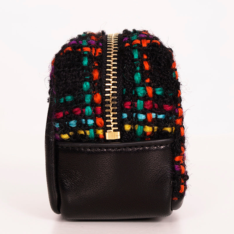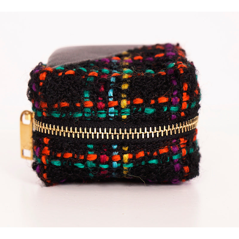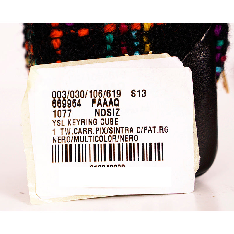 Authentic Saint Laurent keyring bag charm in a whimsy style. Jamie Cube Charm Black with orange, blue and purple twee. Leather accent on the corners and bottom. YSL logo emblem in front center. Gold-tone hardware. Zip closure. Lobster clasp with chain. Made in Italy.