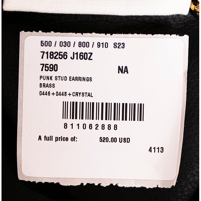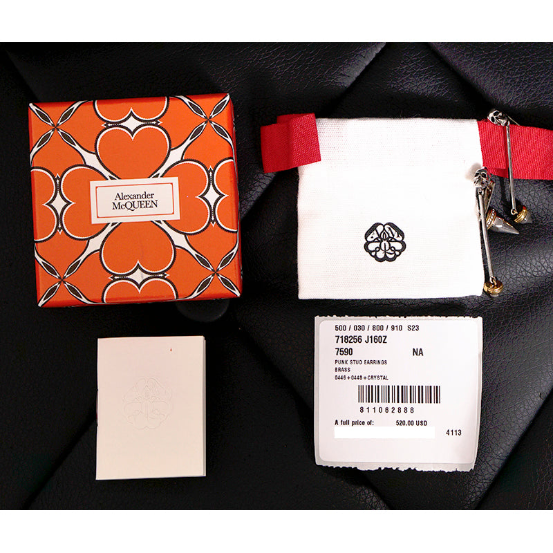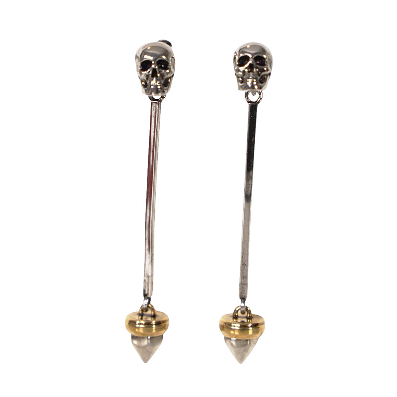 Authentic Alexander McQueen earrings in a bold punk-inspired style. Silver-tone brass with antiqued finish. Skull studs anchor the design, leading to elongated bar drops ending in gold-tone spiked pendants. Back of earrings have larger spike studs with crystal pavé detail. Hallmarl on back of earrings. Intricate mix of edgy and refined elements. Style 718256. Made in Italy. Perfect for adding a dramatic statement to evening wear or elevating casual looks.