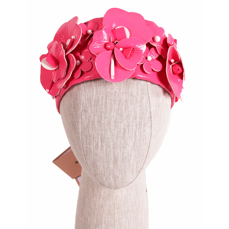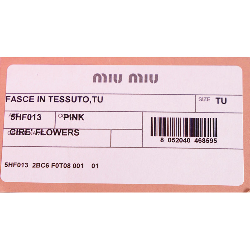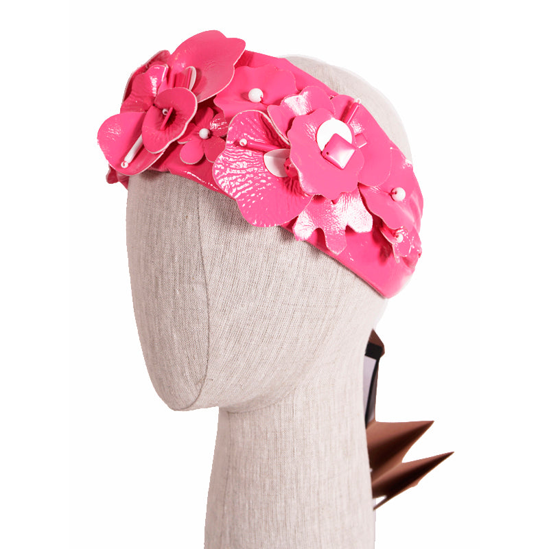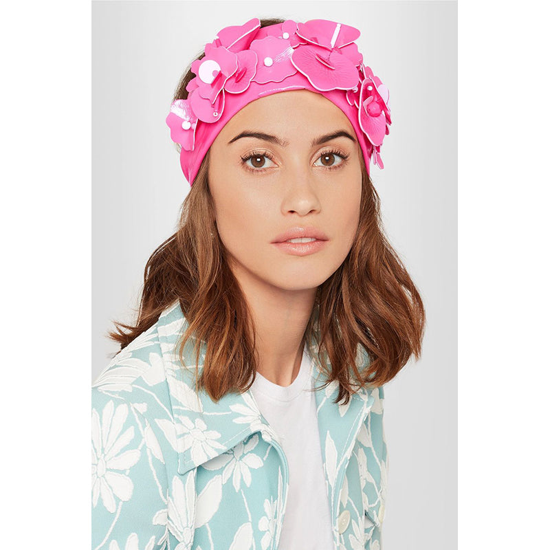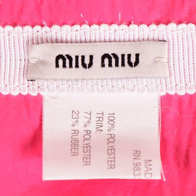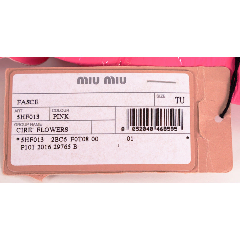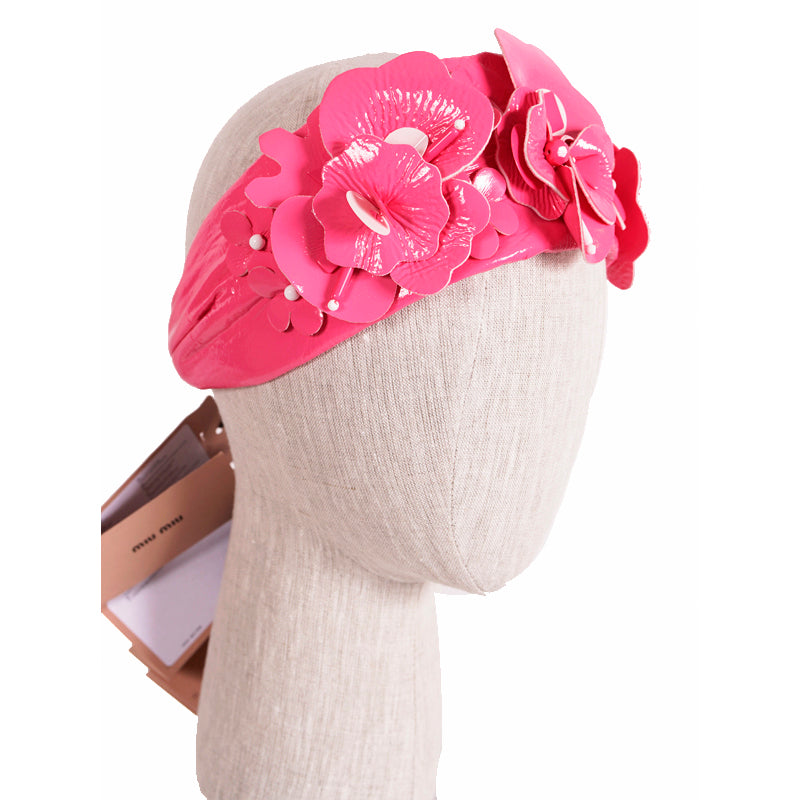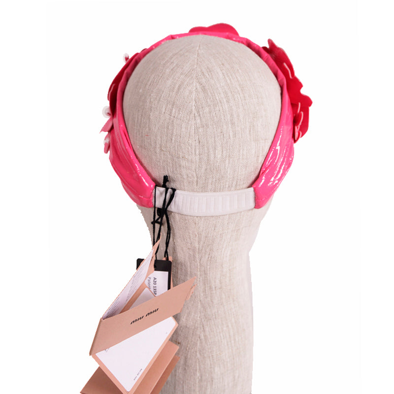 Authentic Miu Miu headband in a retro pin-up girl style. Pink polyester has a patent finish. Cutout flower details adorned with beads. Wide headband. Elastic piece at the back. 100% polyester. Style 5HF013. Made in Italy. Perfect for the pool or beach, sure to get noticed. Seen on the runway in many colors.